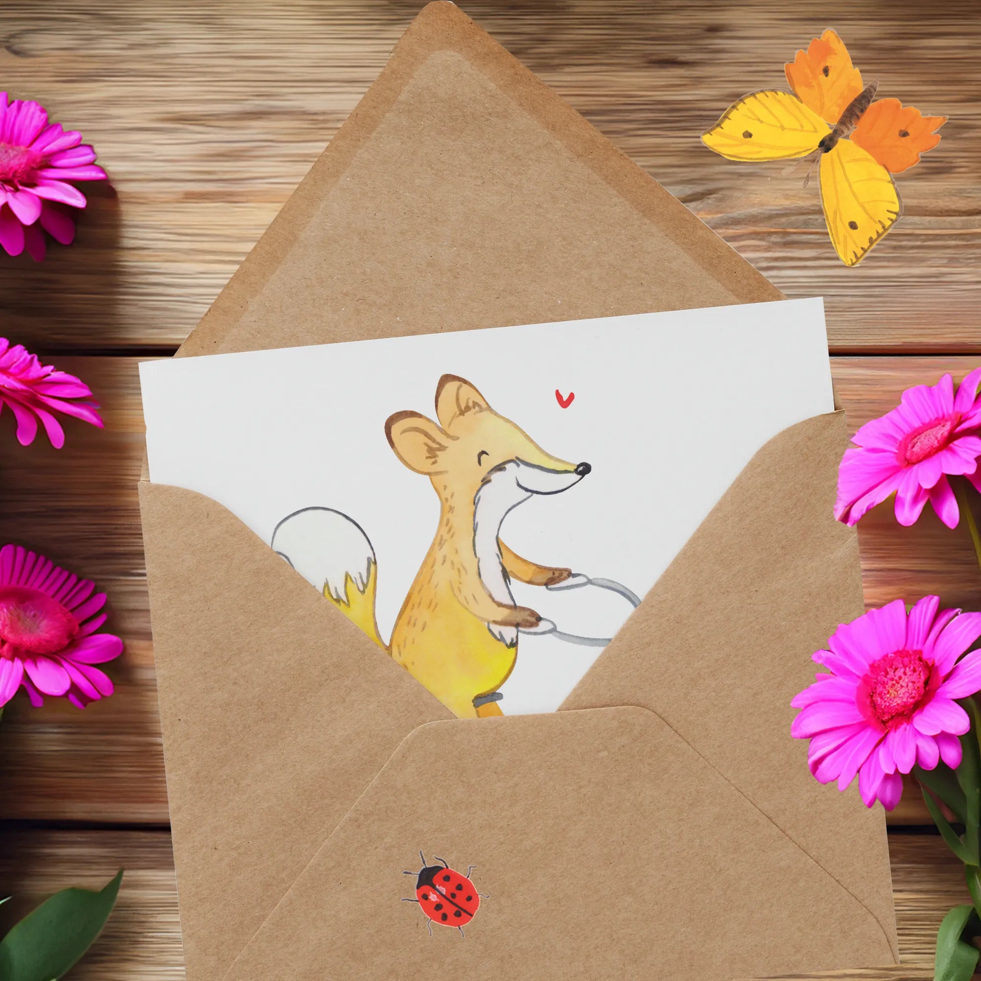 Die Karte kommt im edlen Umschlag und bietet viel Platz für deine persönlichen Worte. Hergestellt aus 300 Gramm hochwertigem Karton ist sie sowohl stabil als auch elegant. Mit einem liebevoll gezeichneten, begeisterten Fuchs auf dem Fahrrad bringt sie ein Lächeln auf das Gesicht des Beschenkten.