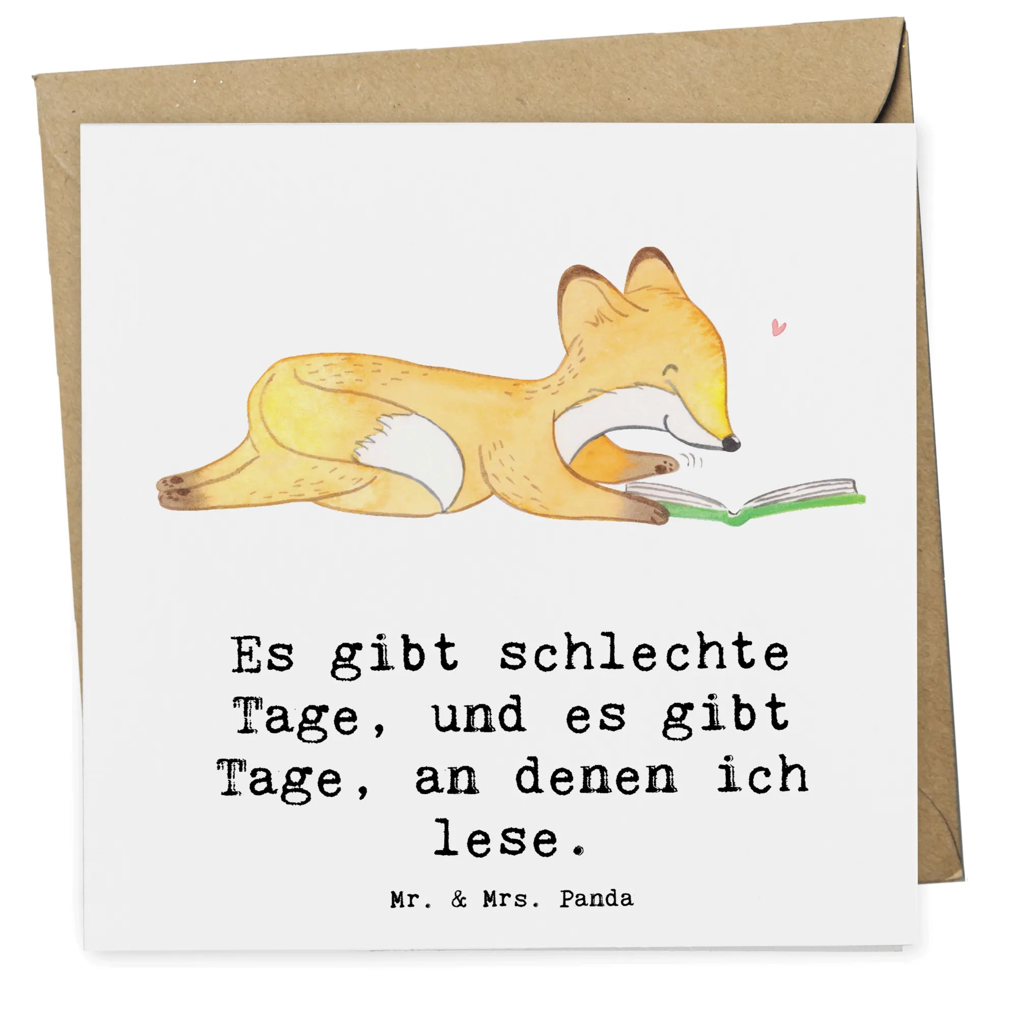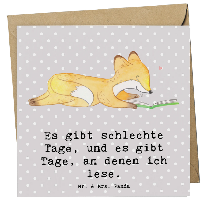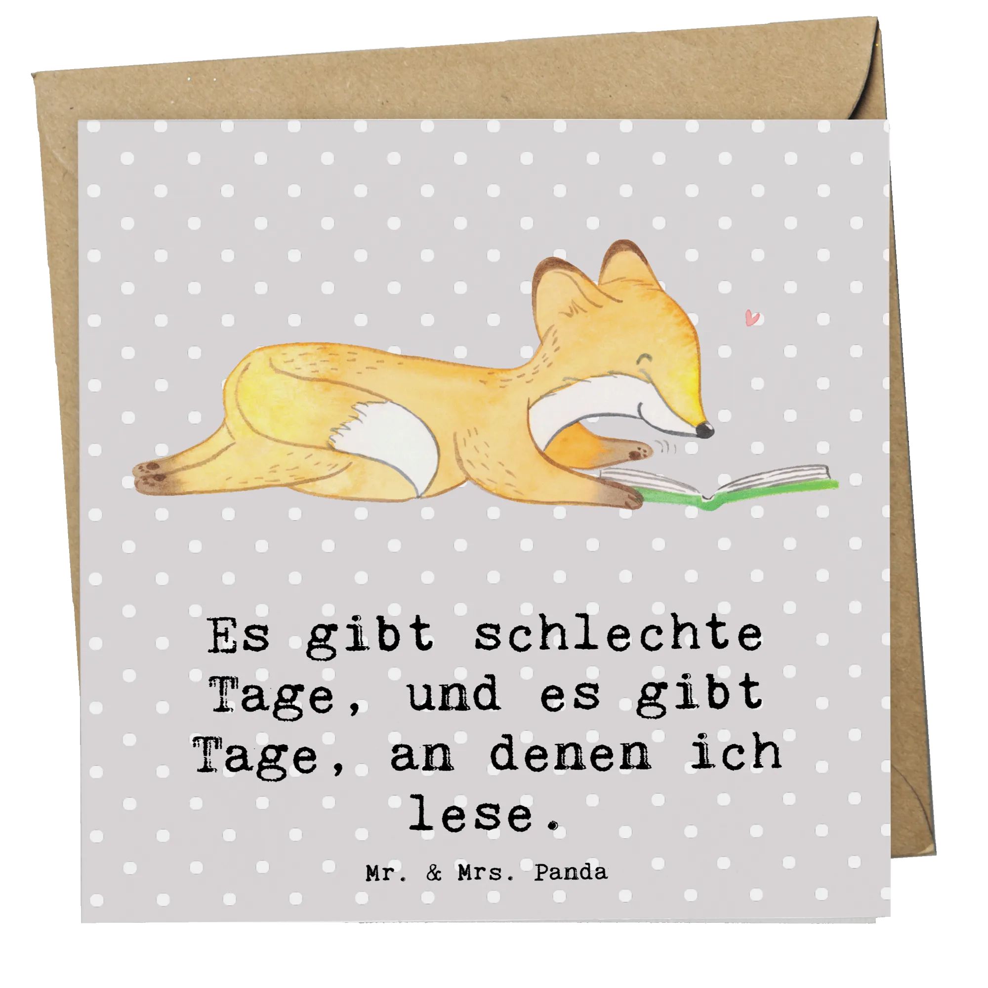 Diese wunderschöne und besonders hochwertige quadratische Karte hebt sich durch ihr liebevolles Design hervor. Sie zeigt einen süßen Fuchs, der entspannt auf dem Boden liegt und ein spannendes Buch liest. Der Spruch "Es gibt schlechte Tage, und es gibt Tage, an denen ich lese." bringt mit einem Hauch Humor die Freude am Lesen zum Ausdruck.