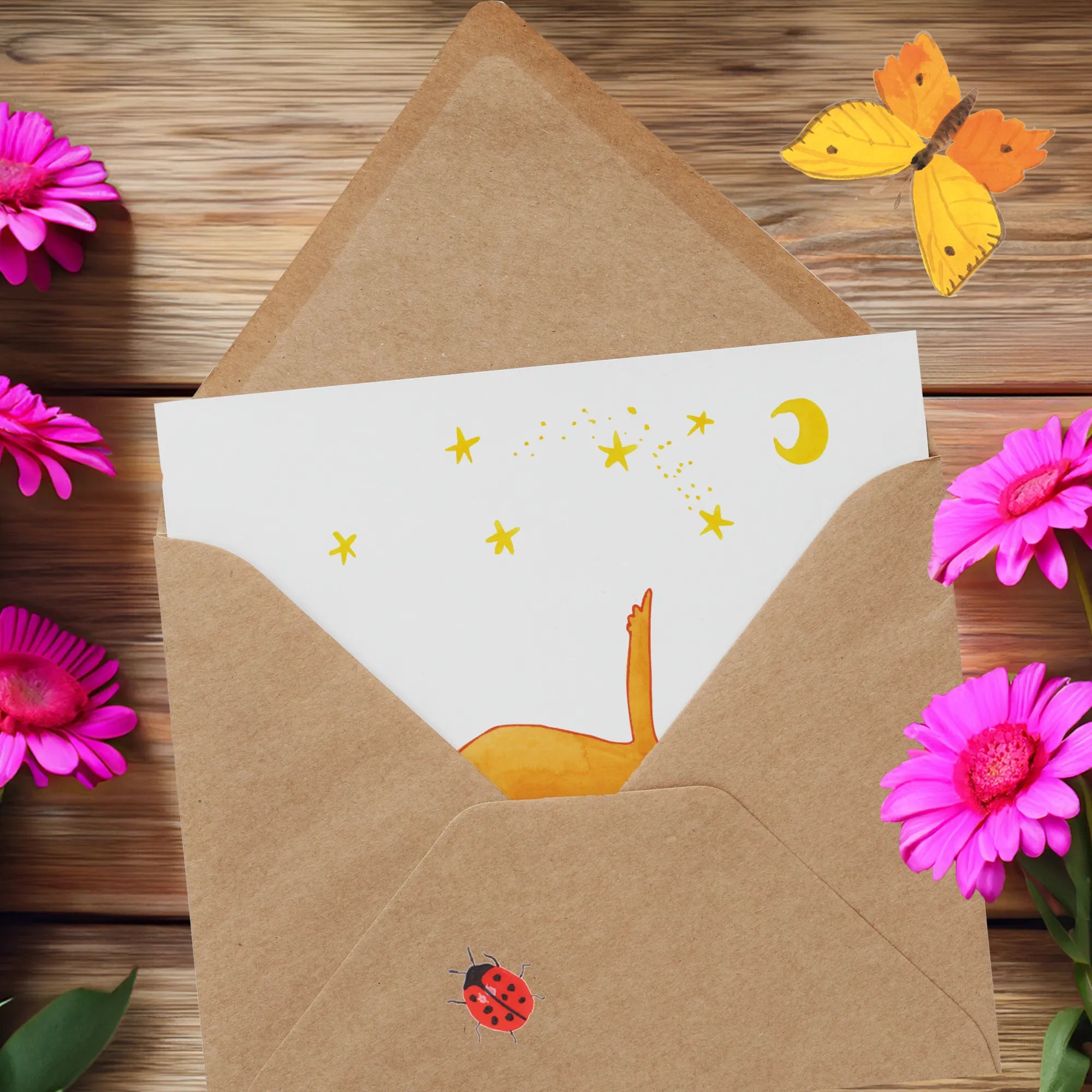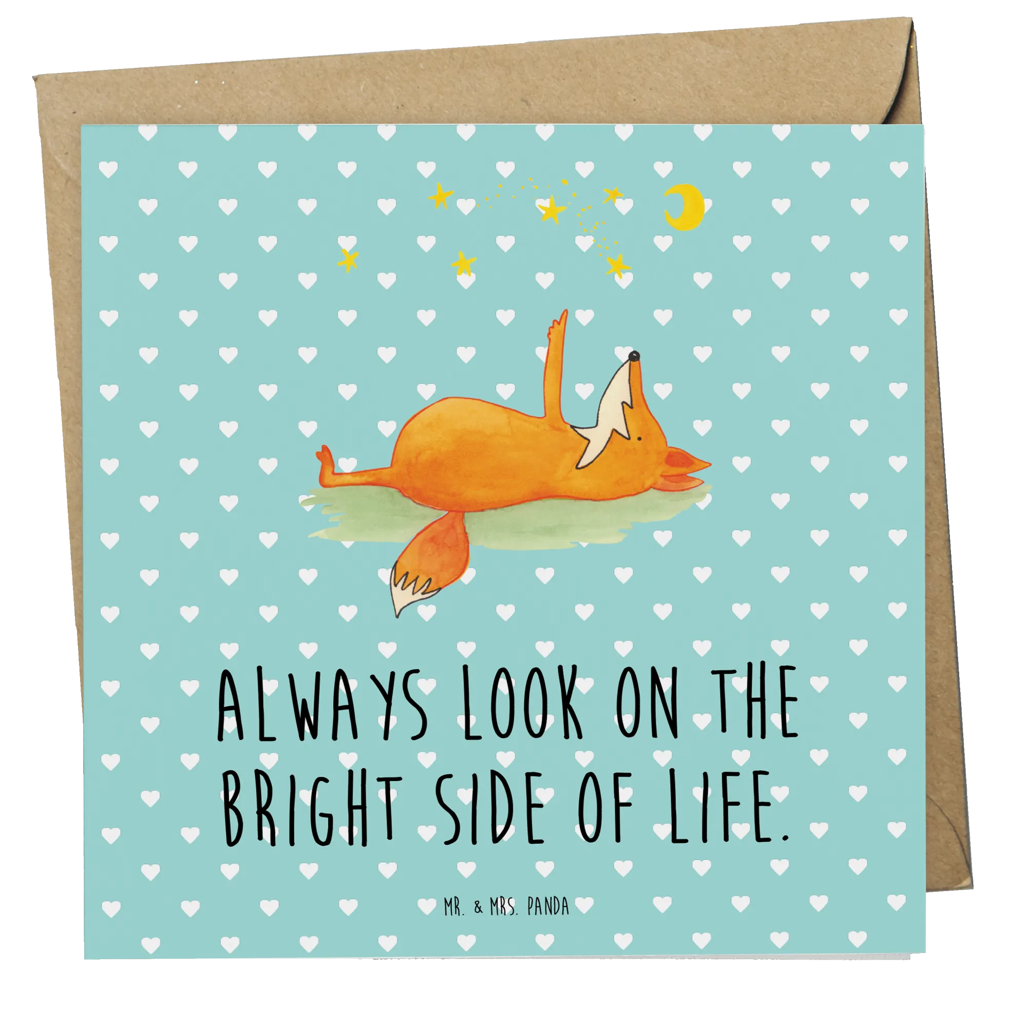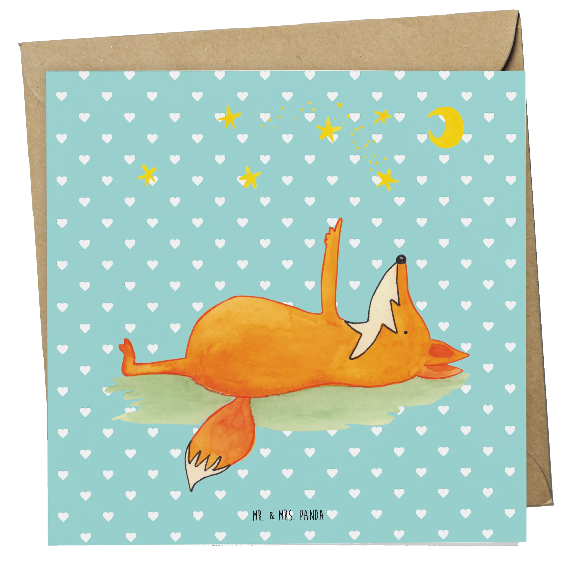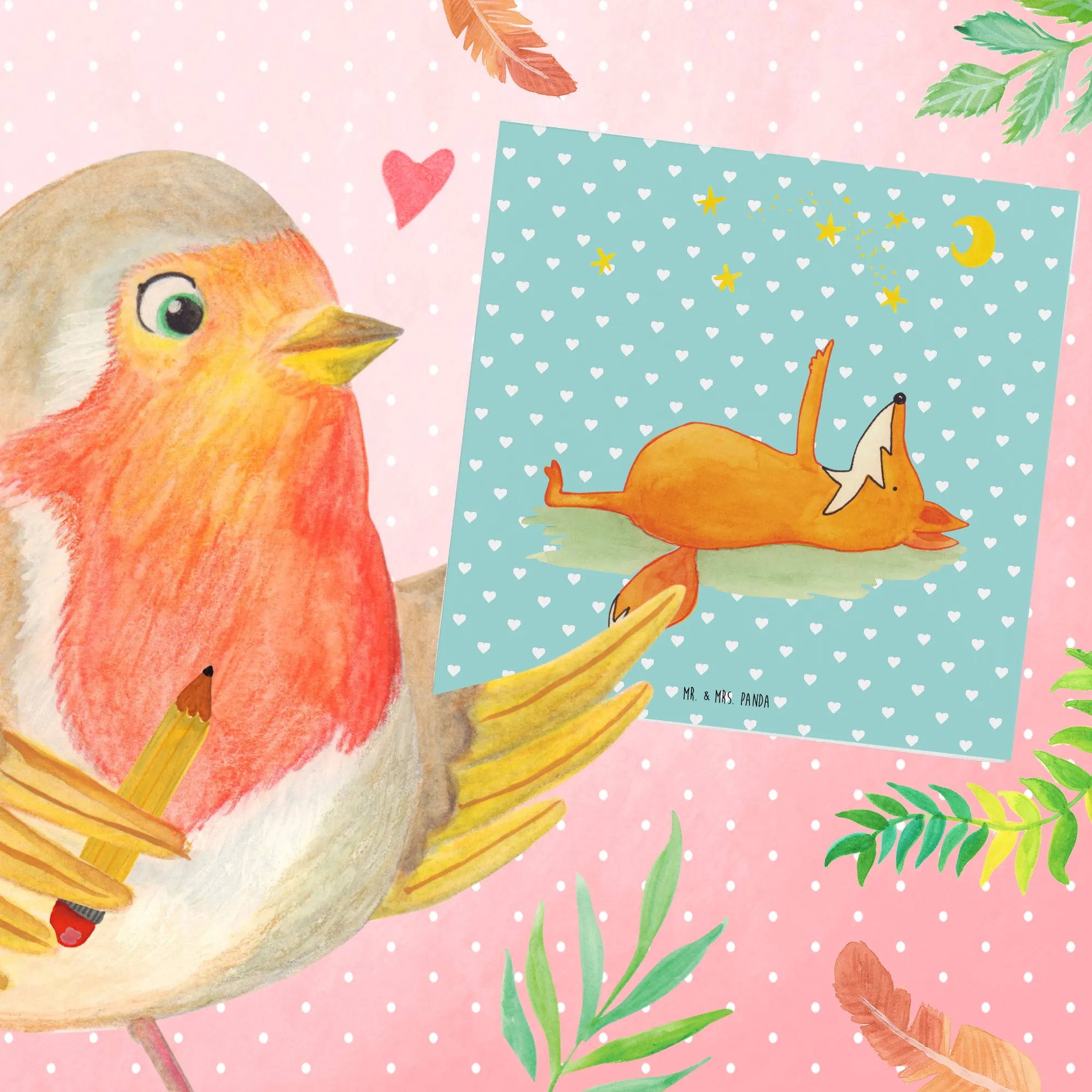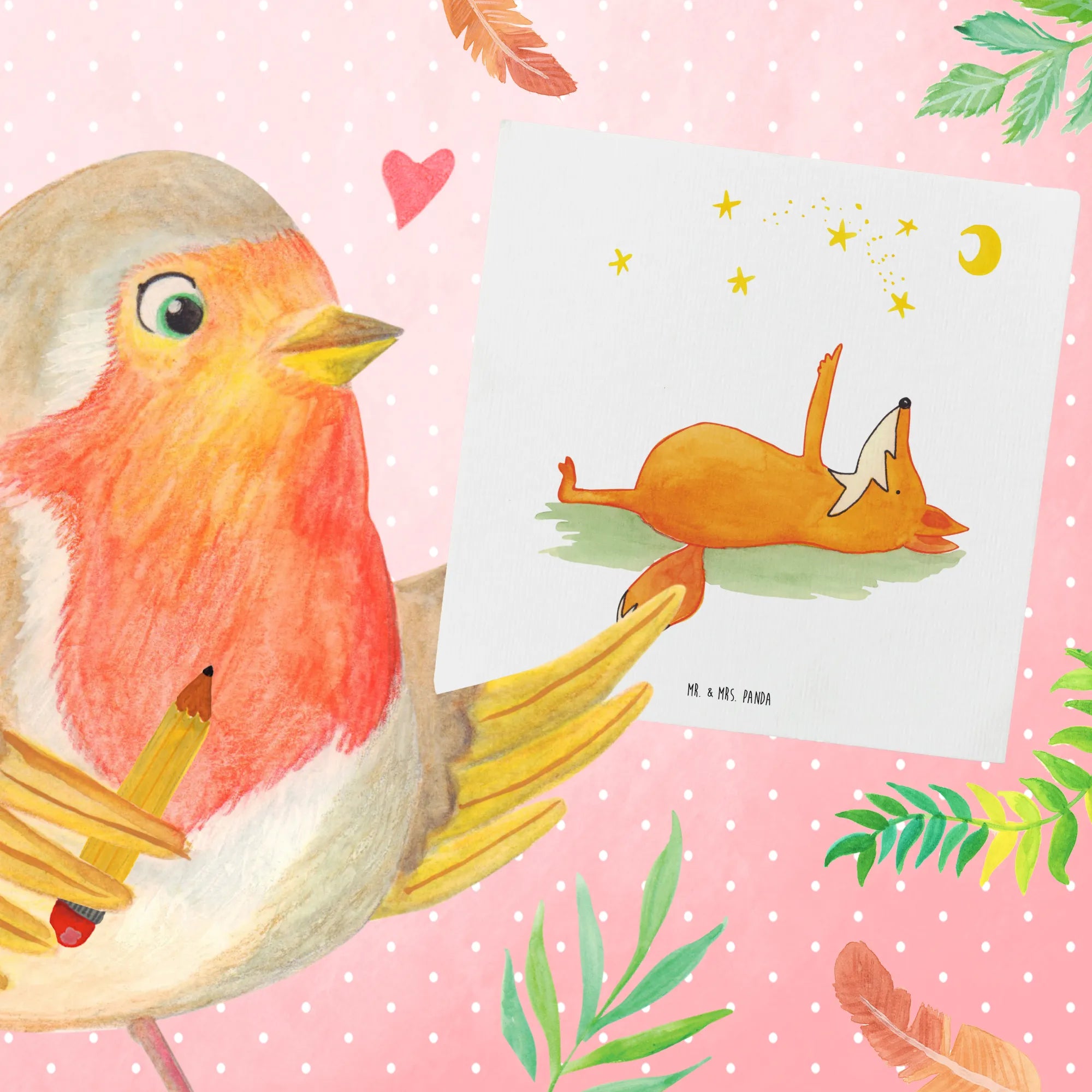 Diese hochwertige, quadratische Grußkarte zeigt einen niedlichen Fuchs, der auf dem Rücken liegt und verträumt in den Sternenhimmel schaut. Das Motiv ist liebevoll von Mrs. Panda mit Aquarell gefertigt und versprüht sofort Romantik, Zuversicht und Wärme. Perfekt als Hochzeitskarte, Geburtstagskarte, Glückwunschkarte oder als kleine Aufmunterung zwischendurch.
