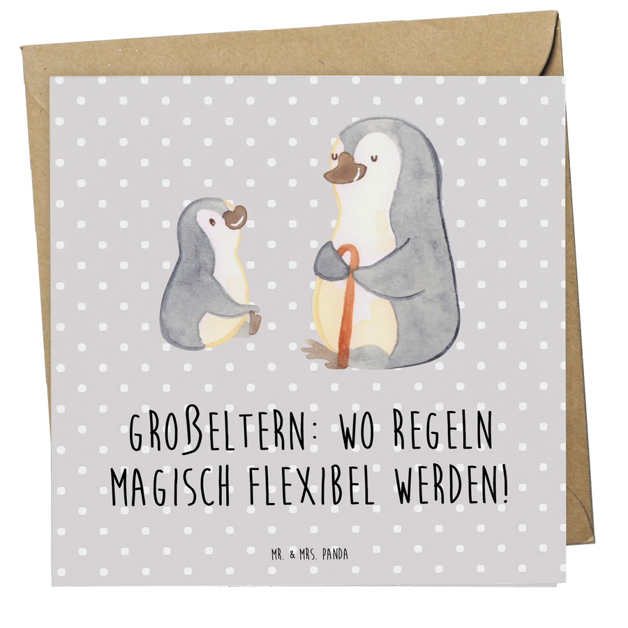 Die Deluxe Karte "Großeltern" aus der Kollektion Familie & Verwandte von Mr. & Mrs. Panda ist das perfekte Geschenk für alle, die ihre Großeltern lieben und wertschätzen. Diese hochwertige und besonders liebevoll gestaltete quadratische Karte hat die idealen Maße von 140 mm x 140 mm und besteht aus edlem 300 Gramm Karton. Die Vorderseite der Karte ist mit dem spritzigen Spruch "Großeltern: wo Regeln magisch flexibel werden!" versehen und dazu zieren fröhliche, handgezeichnete Aquarell-Motive das Design.