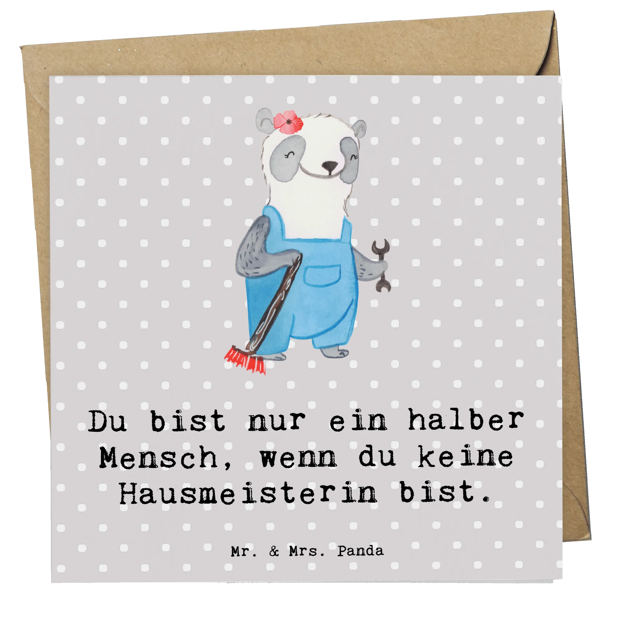 Diese quadratische Karte hat die Maße 140 mm x 140 mm und wird aus hochwertigem 300 Gramm Karton hergestellt, was ihr eine edle Anmutung verleiht. Die Vorderseite ist mit einem liebevoll gestalteten Motiv – einer süßen Pandadame in einem Blaumann, die fröhlich mit einem Besen in der Hand winkt – dekoriert und hat den herrlichen Spruch: "Du bist nur ein halber Mensch, wenn du keine Hausmeisterin bist." Auf der matte Innenseite hast Du genügend Platz, um Deine ganz persönlichen Glückwünsche oder Grüße einzutragen.