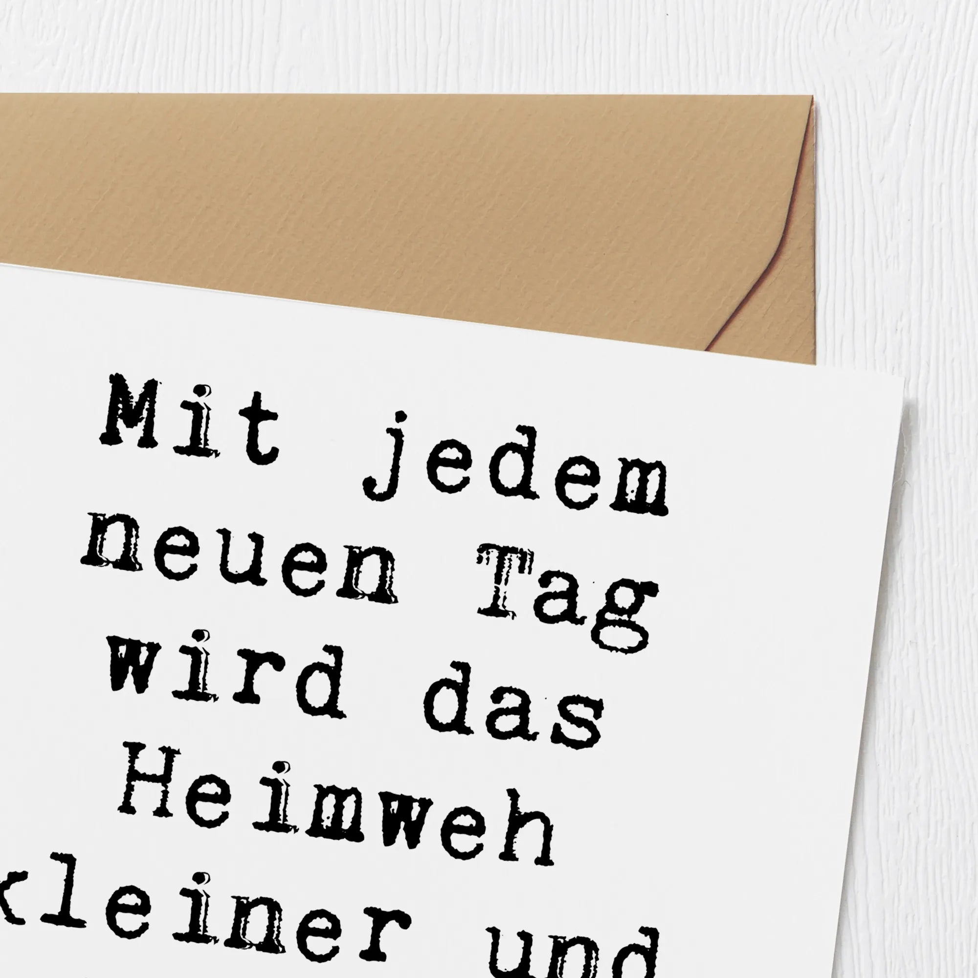 Mit jedem neuen Tag wird das Heimweh kleiner und dein Mut größer. Dies bedeutet, dass jeder neue Tag eine Chance ist, stärker und mutiger zu werden. Heimweh mag zu Beginn überwältigend erscheinen, aber im Laufe der Zeit schrumpft es, während dein Vertrauen und deine Entschlossenheit wachsen. Es ist eine liebevolle Erinnerung daran, dass du mit der Zeit in der Lage sein wirst, alles zu überstehen.
