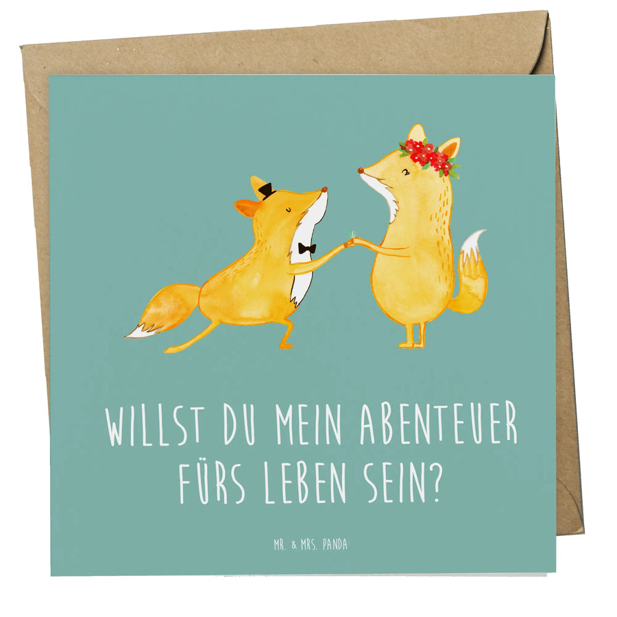 Die Karte gehört zu unserer zauberhaften Hochzeitskollektion von Mr. & Mrs. Panda, die extra für jeden Anlass rund um die Hochzeit entworfen wurde. Mit ihren Maßen von 140 mm x 140 mm passt sie wunderbar in jede Handtasche oder Geldbörse und ist immer griffbereit, wenn der richtige Moment kommt, um um die Hand der geliebten Person anzuhalten.
