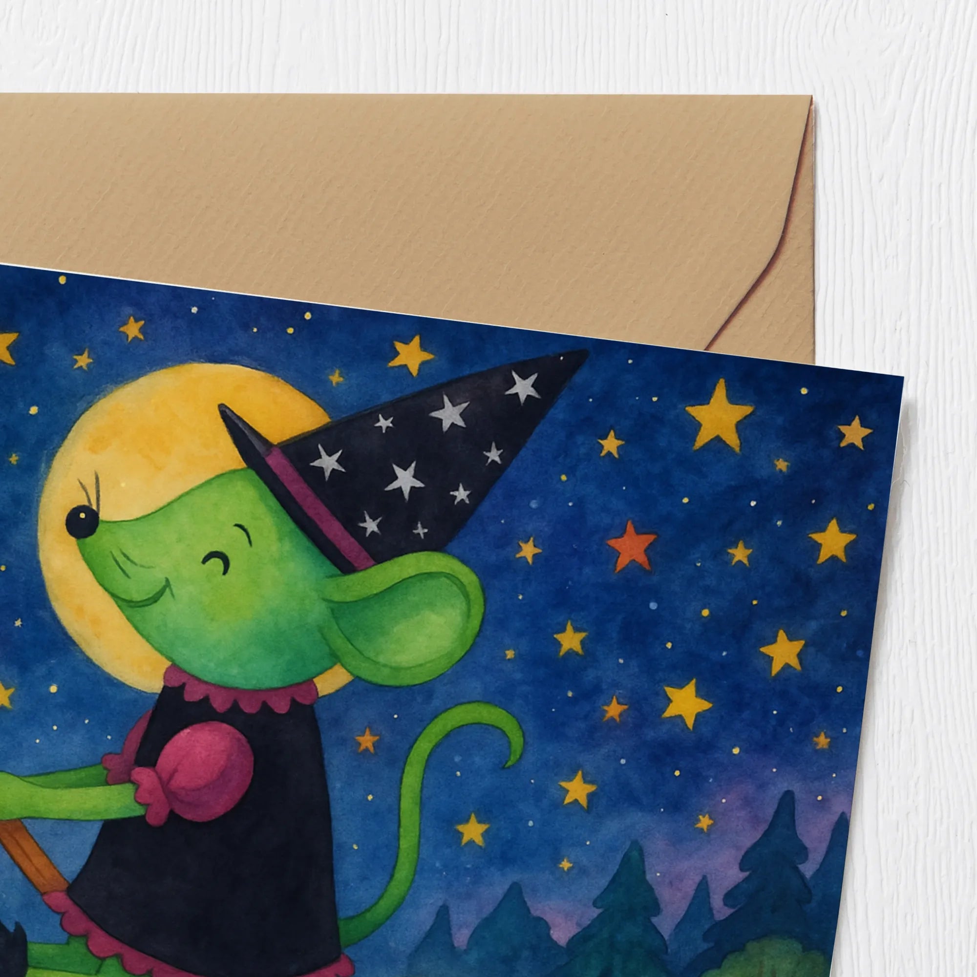 Die kleine Maus fliegt — und mit jedem Flügelschlag ihres Besens scheint ein Funke Neugier in die Welt zu fliegen. Dieses Motiv feiert das Gefühl des Schwebens: ein leichter Moment, der das Herz öffnet und die Gedanken wandern lässt. Die Darstellung ist voller Bewegung und Lebensfreude; die Maus schaut nach vorn, bereit für neue Geschichten, Begegnungen und kleine Wunder. 'Fliegen' steht hier für Träume, die man einfach ausprobiert, und für die Leichtigkeit, mit der man manchmal durchs Leben gehen sollte.