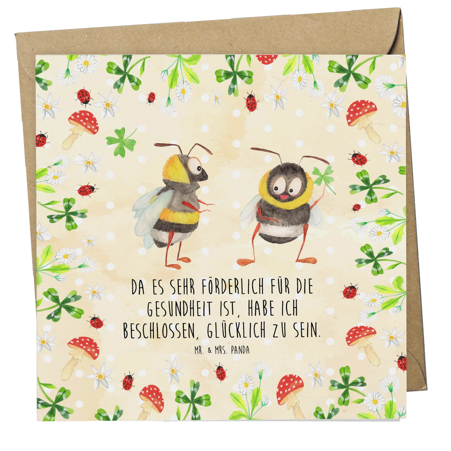 Die Deluxe Karte mit dem bezaubernden Motiv Hummeln mit Kleeblatt aus der kleinen Welt Kollektion von Mr. & Mrs. Panda ist der perfekte Begleiter für viele besondere Anlässe. Diese wunderschöne quadratische Grußkarte wird aus hochwertigem 300 Gramm Karton hergestellt und beeindruckt durch ihre glanzvolle Vorderseite sowie die matte Innenseite, die ideal zum individuellen Beschriften geeignet ist.