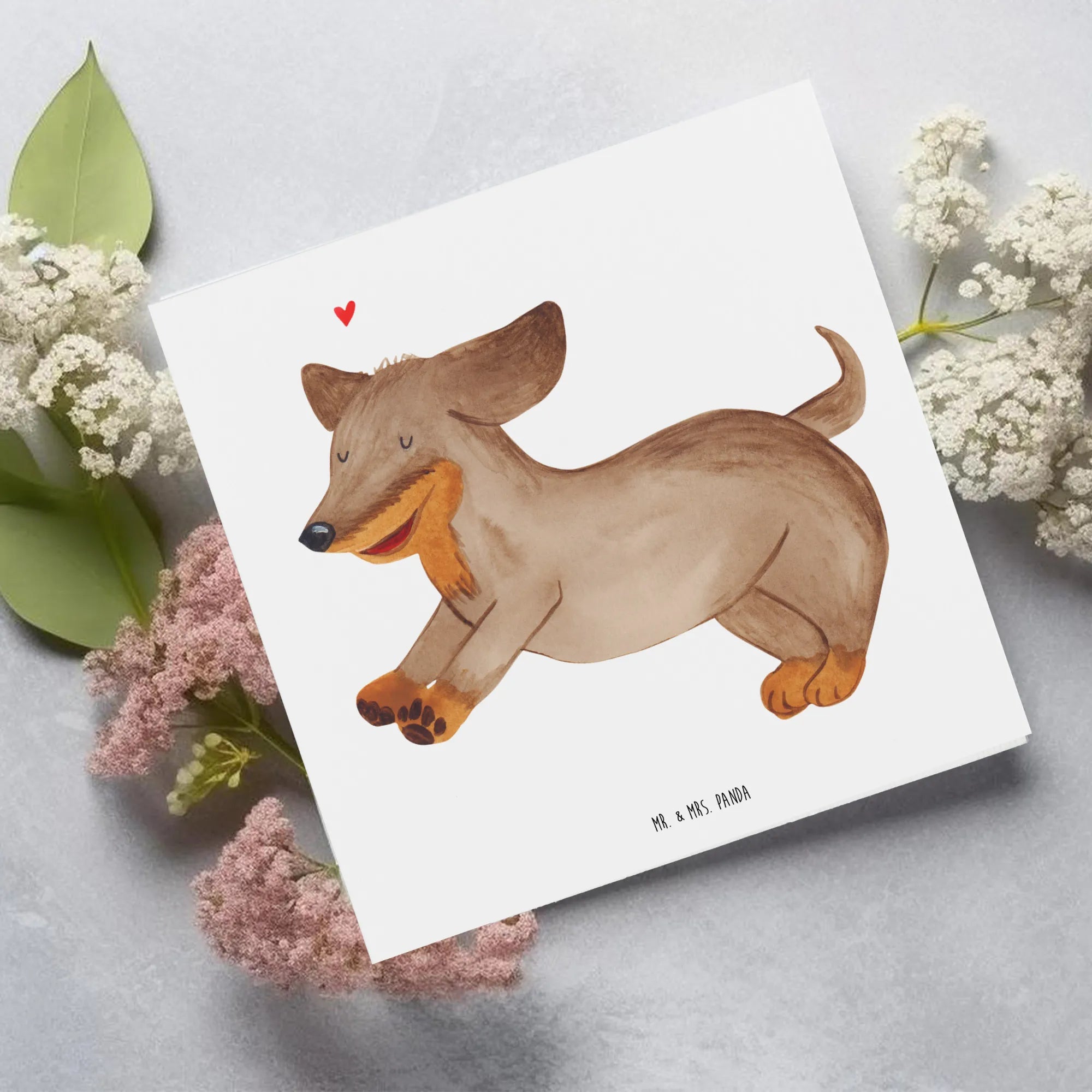 Deine Deluxe Karte „Hund Dackel fröhlich“ aus der bezaubernden Hunde Kollektion von Mr. & Mrs. Panda ist die perfekte Grußkarte für alle Hundeliebhaber. 🐾 Ein fröhlicher Dackel springt über die Vorderseite und zaubert sofort ein Lächeln ins Gesicht – ideal als Geburtstagskarte, Hochzeitskarte oder Einladungskarte.