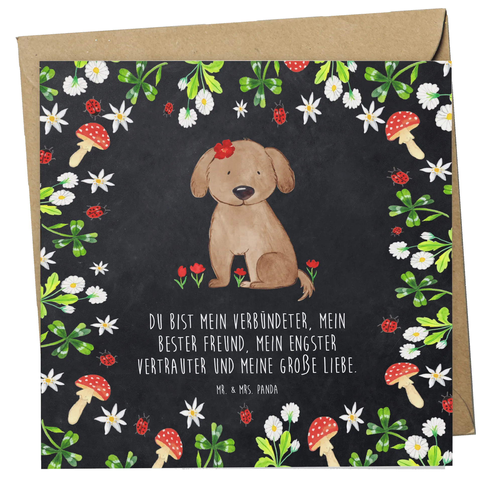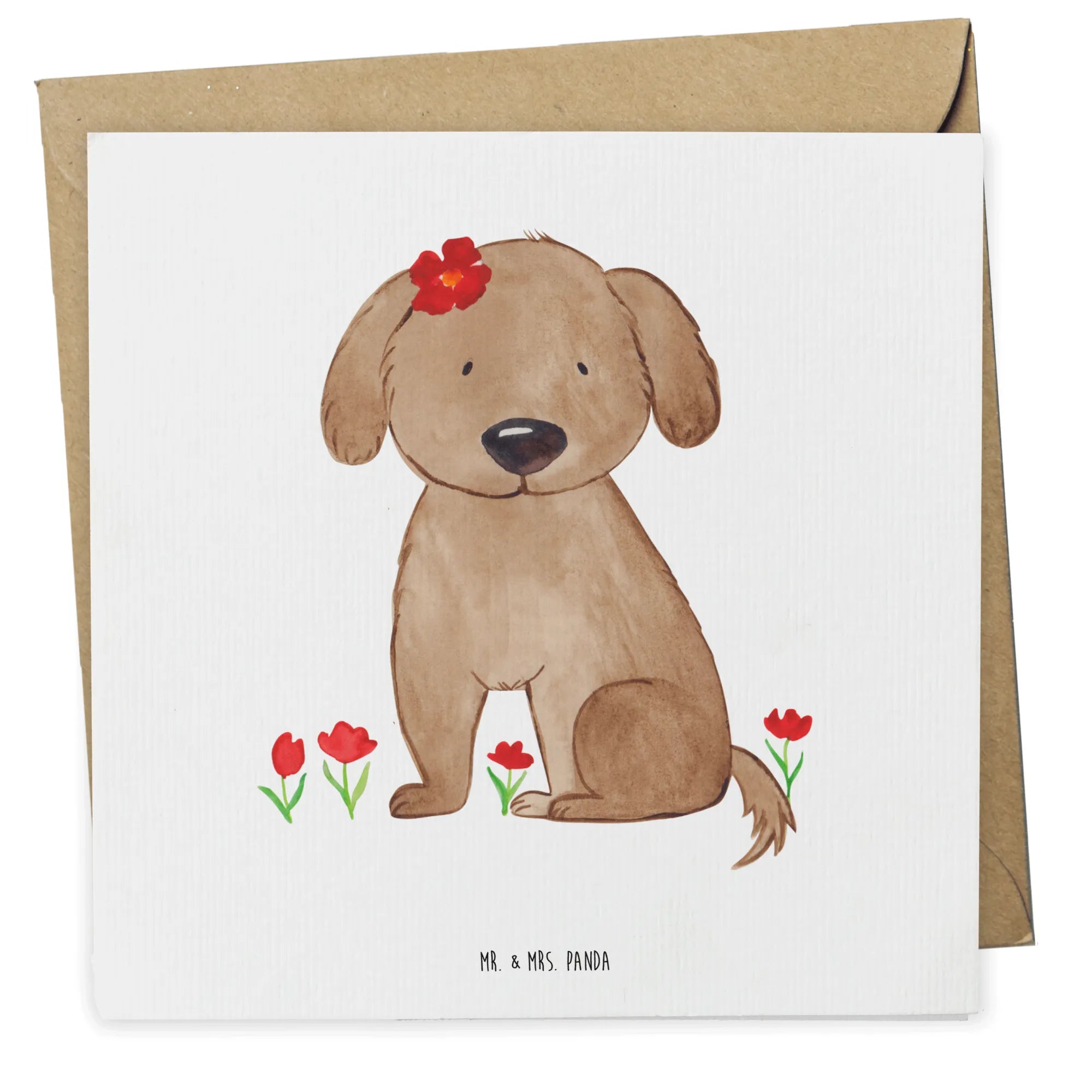 Diese liebevoll gestaltete Grußkarte zeigt eine niedliche Hundedame mit einer Blume auf dem Kopf, die sofort gute Laune verbreitet. Die besonders hochwertige quadratische Karte hat die Maße von 140 mm x 140 mm und wird aus edlem 300 Gramm Karton gefertigt. Ihre Hochglanz-Optik verleiht ihr einen eleganten Look, während die matte Innenseite dir genug Platz bietet, um persönliche Botschaften zu hinterlassen.