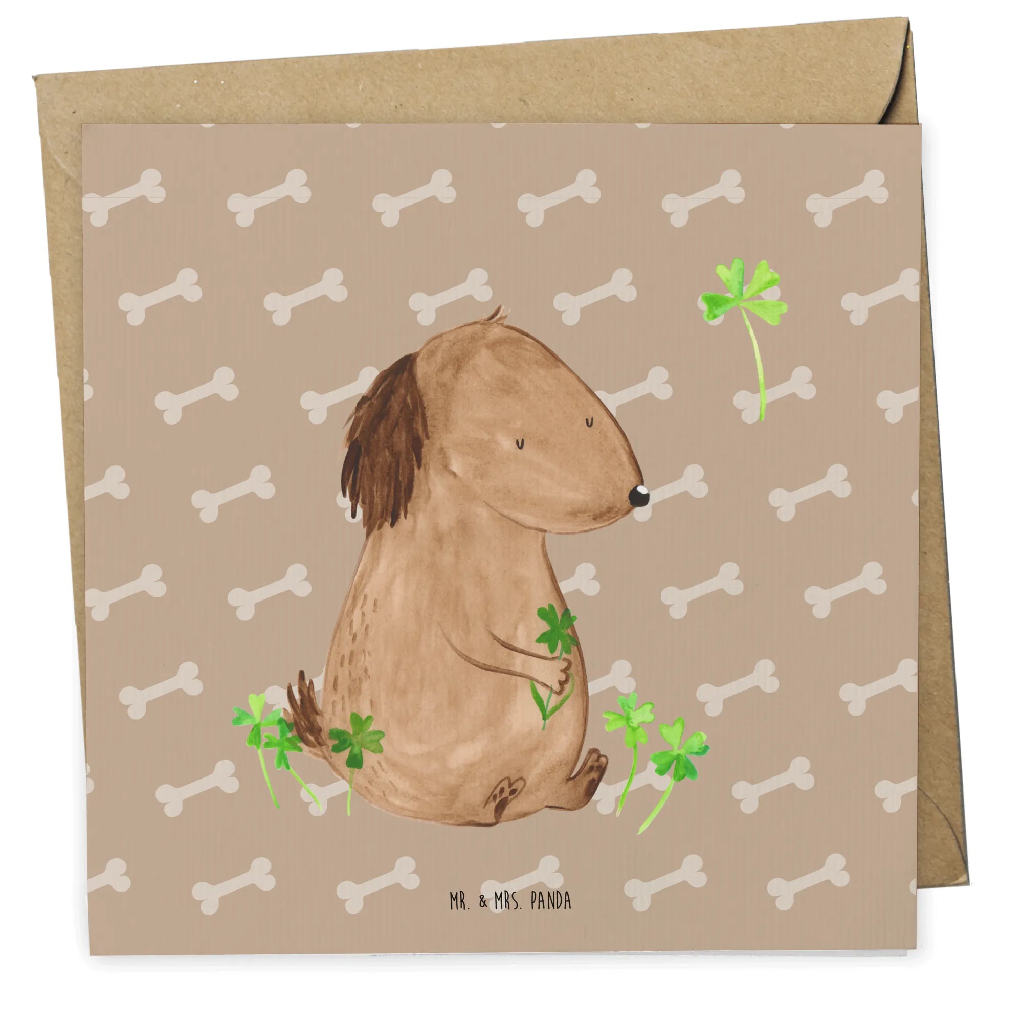 Die Deluxe Karte "Hund Kleeblatt" aus der Hunde Kollektion von Mr. & Mrs. Panda ist das perfekte Geschenk für jeden Tierliebhaber, der gute Laune und Glück verbreiten möchte. Diese wunderschöne und besonders hochwertige quadratische Karte hat die Maße 140 mm x 140 mm und ist aus hochwertigem Karton gefertigt.