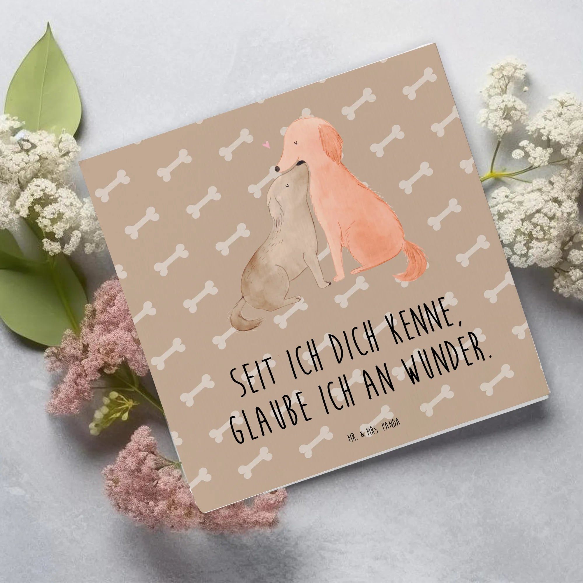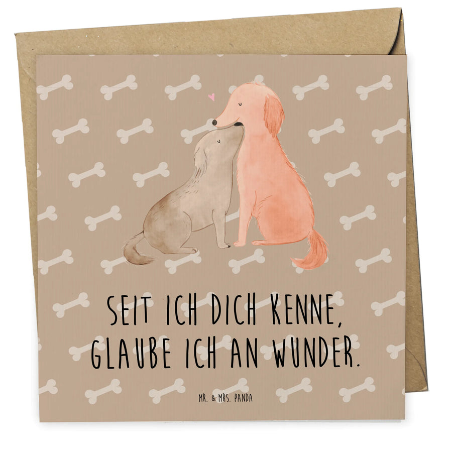 Die Vorderseite der Karte ist mit einem herzlichen Motiv von zwei niedlichen Hunden, die sich liebevoll umarmen, bedruckt. Die Botschaft "Seit ich dich kenne, glaube ich an Wunder." spricht aus, was viele Hundebesitzer empfinden – die erstaunlichen Wunder, die unsere treuen Vierbeiner in unser Leben bringen.