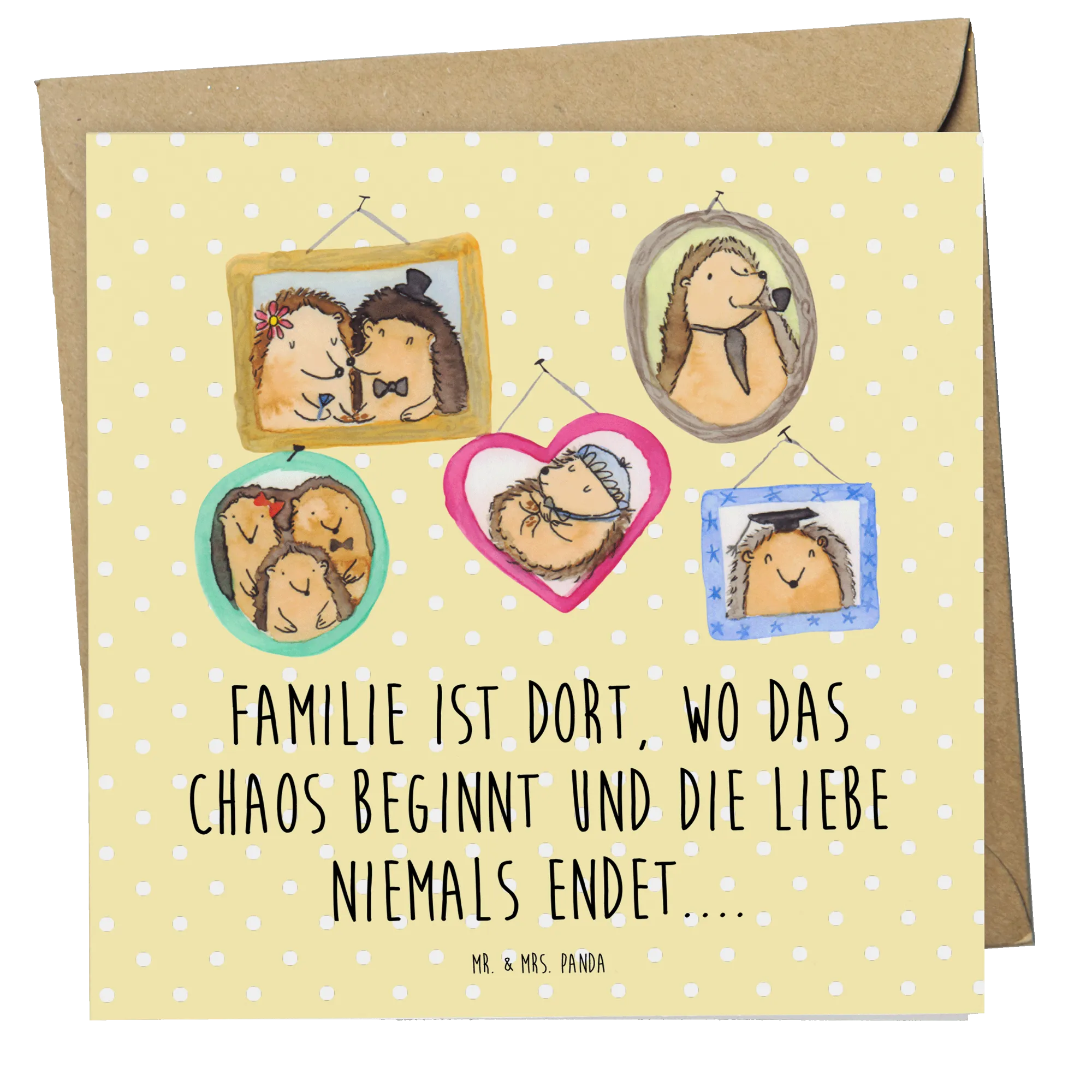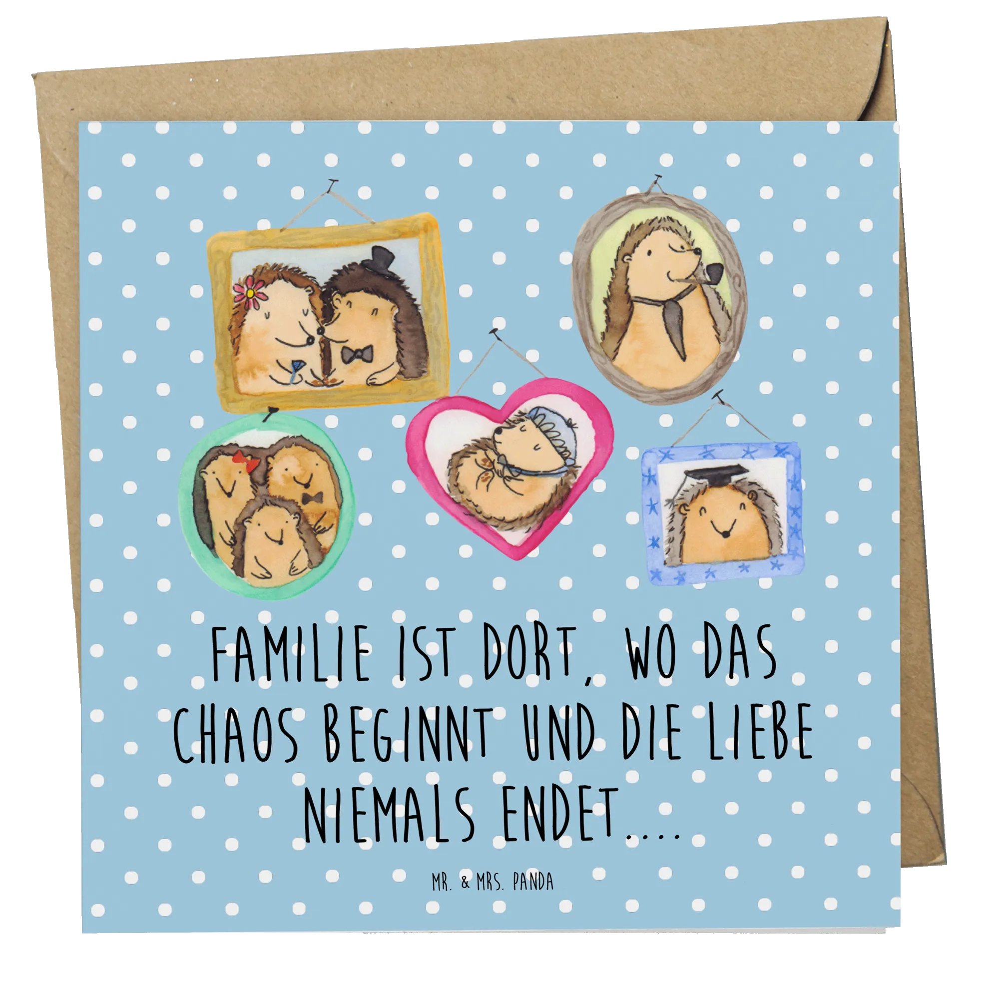 Das liebevoll gestaltete Motiv zeigt eine charmante Collage aus verschiedenen Szenen der Igelfamilie, die bedeutende Momente des Zusammenhalts und der Liebe festhält. Diese herzlichen Darstellungen sind nicht nur schön anzusehen, sie erzählen auch eine Geschichte: Von Hochzeiten im Igel-Stil bis hin zu Kuschel-Momenten. Der wunderbare Slogan auf der Karte – "Familie ist dort, wo das Chaos beginnt und die Liebe niemals endet...." – fasst alles zusammen, was Familie bedeutet. Hier wird Chaos zum Abenteuer und Liebe zu einem ewigen Band.