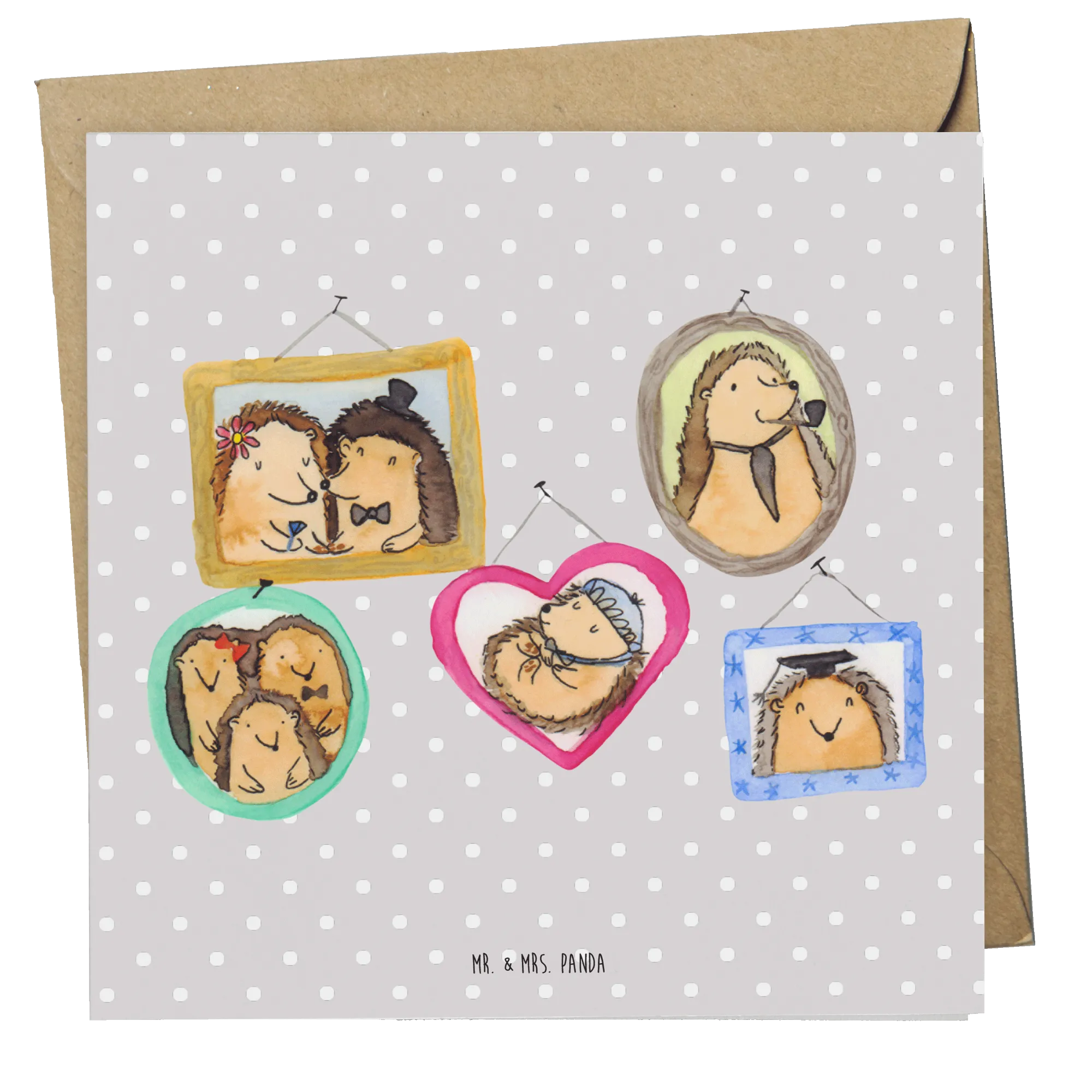 Das liebevoll gestaltete Motiv zeigt eine entzückende Collage von Igeln, die verschiedene familiäre Situationen darstellen - von einem Paar in Hochzeitskleidung bis hin zu einer kuschelnden Familie. Jeder Igel auf der Karte strahlt Wärme und Zuneigung aus.