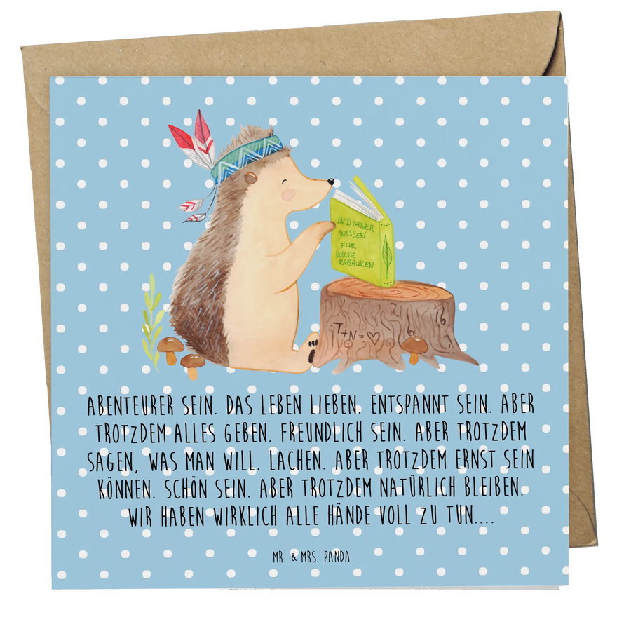 \nOb als Zusendung zum Geburtstag, als Einladung zu einem Abenteuer oder einfach nur als kreative Geste - diese Karte ist immer eine gute Wahl. Lass dich von der Magie der Waldtiere Kollektion inspirieren und bring etwas Freude in das Leben der Menschen, die dir am Herzen liegen! Am Ende des Tages reflektiert die "Igel Indianer" Karte die wichtige Botschaft: Sei ein Abenteurer, liebe das Leben, entspanne dich und sei freundlich – aber vergiss nicht, auch ehrlich deine Meinung zu sagen. Diese Kombination aus ihrer warmen Botschaft und dem niedlichen Design macht die Deluxe Karte von Mr. & Mrs. Panda zu einem unvergesslichen Geschenk für jeden Anlass!