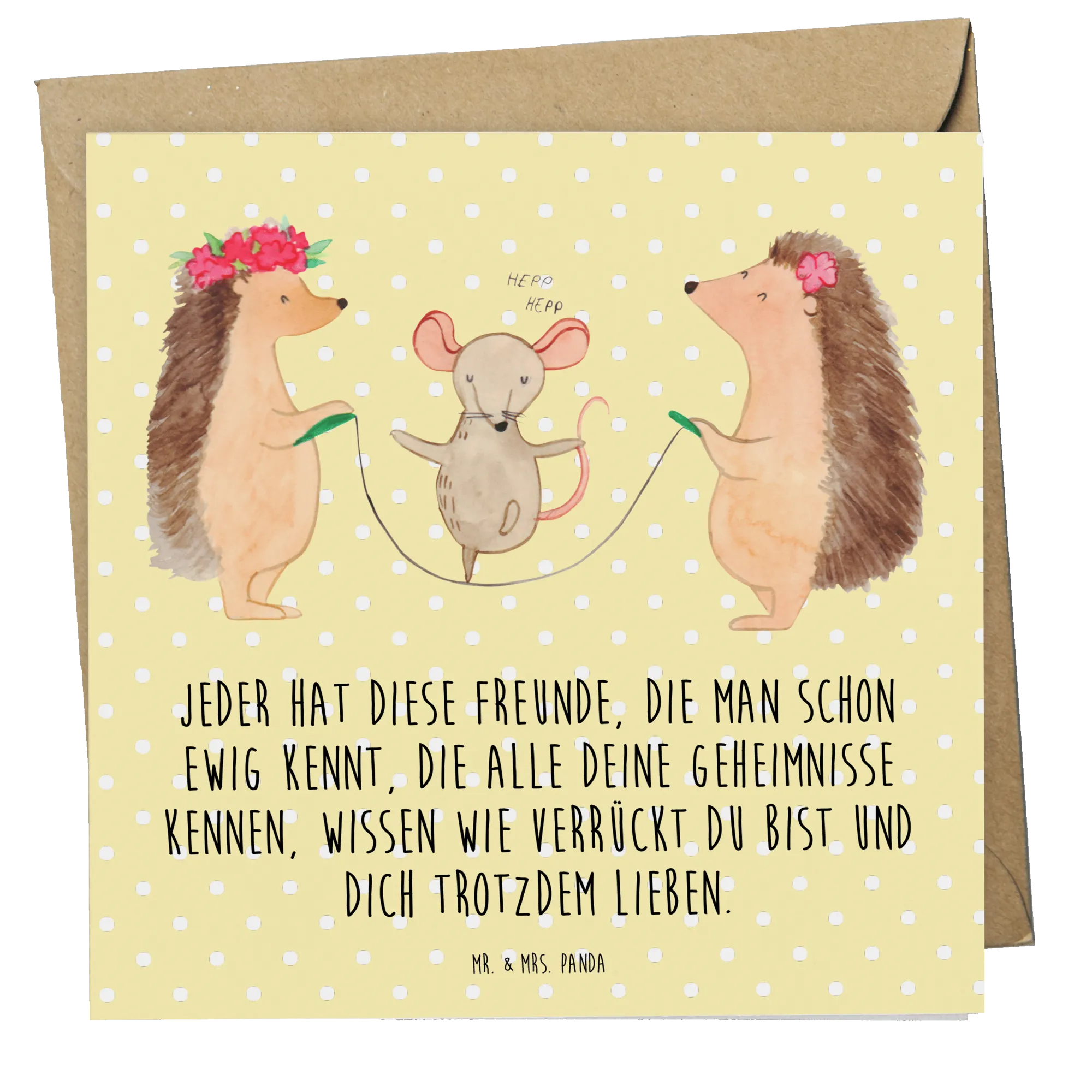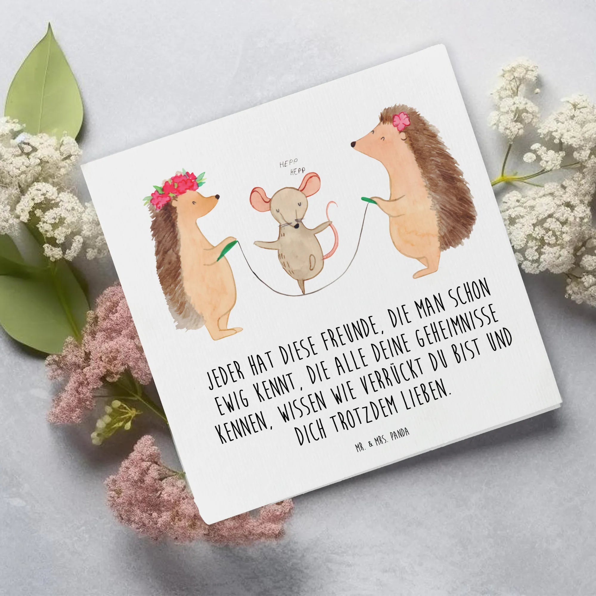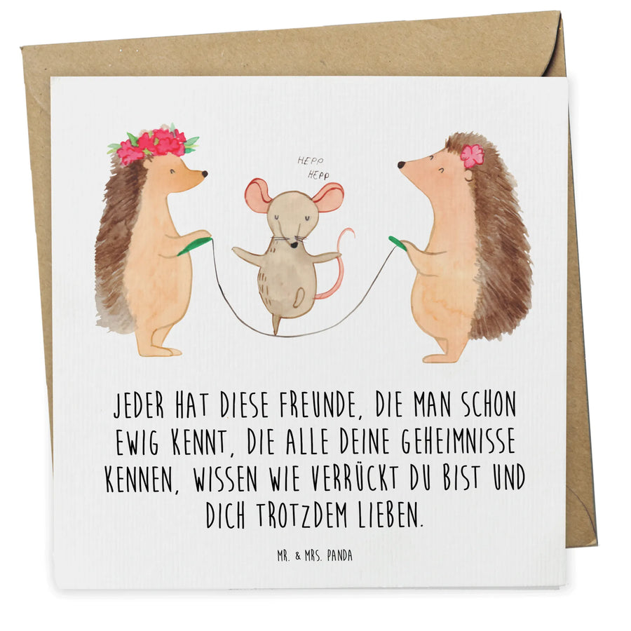Diese hochwertige quadratische Karte besticht nicht nur durch ihr zauberhaftes Design mit den niedlichen Igeln und der fröhlichen Maus, die gemeinsam Seil springen, sondern auch durch die liebevoll gestaltete Botschaft auf der Vorderseite. Der Slogan "Jeder hat diese Freunde, die man schon ewig kennt, die alle deine Geheimnisse kennen, wissen wie verrückt du bist und dich trotzdem lieben" spricht die Herzen aller Freundschaftsliebhaber an und macht sie zu einem perfekten Geschenk für jeden Anlass.