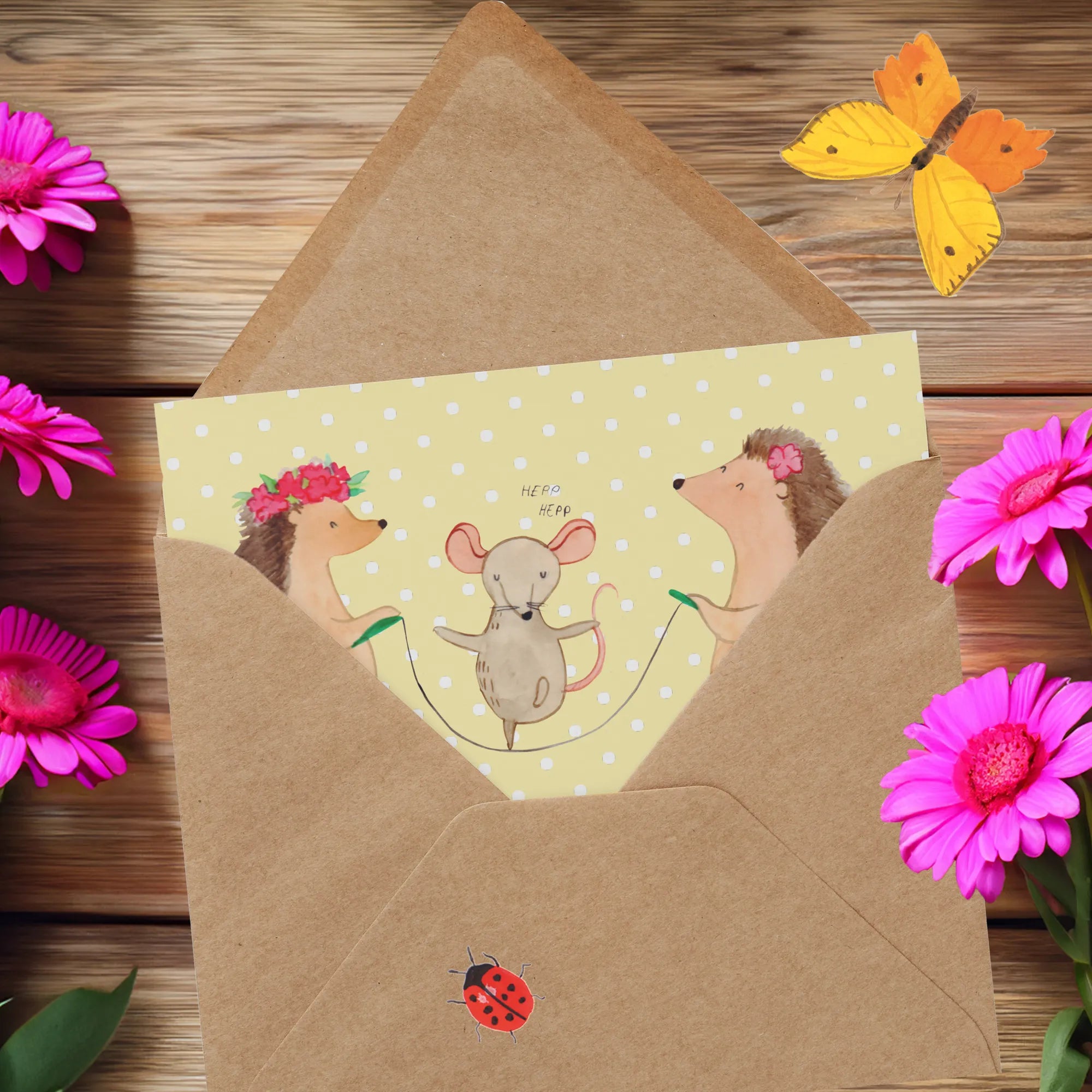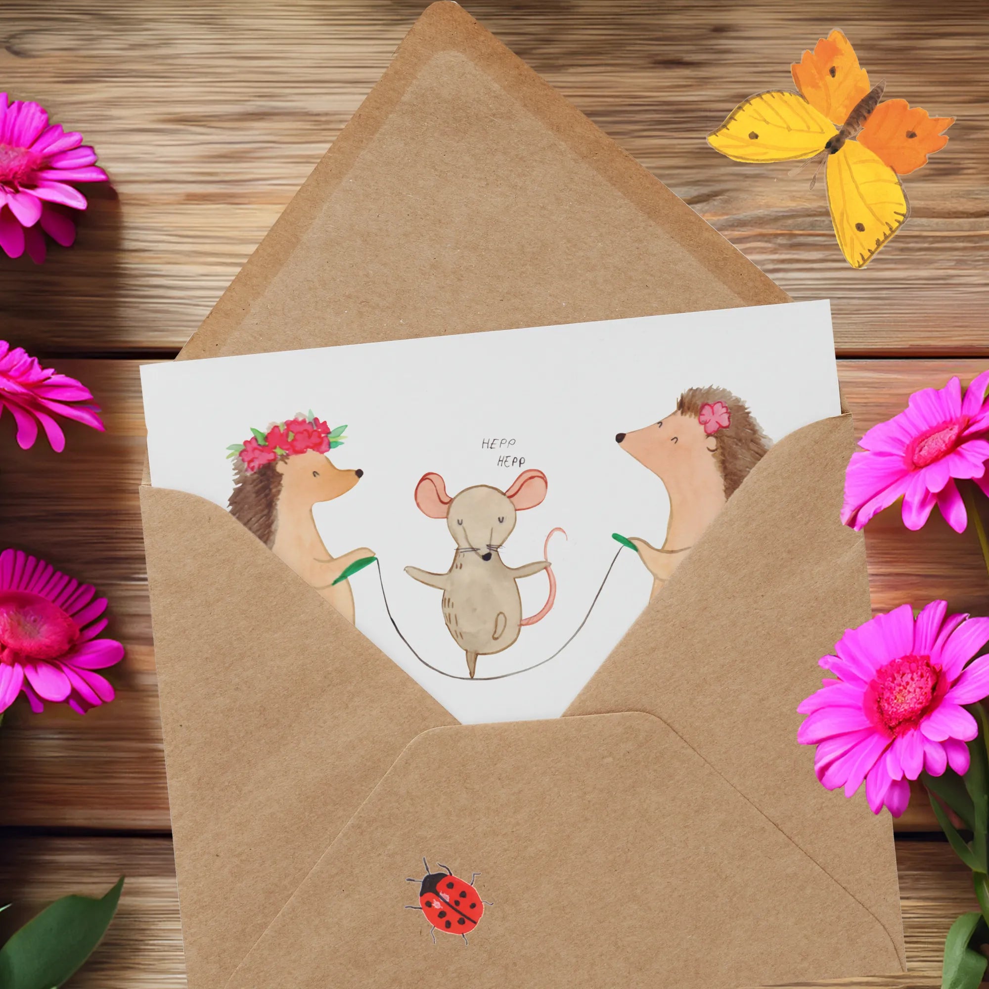 Diese Karte eignet sich hervorragend für Kinder und Familien und ist ein Highlight in jedem Kinderzimmer. Verpackt in einem edlen Umschlag, wird sie nicht nur als Grußkarte, sondern als kleines Kunstwerk wahrgenommen. Lass die kleine Maus und die zwei Igel in dein Leben und bringe ein Stück „Gute Laune“ zu dir und deinen Liebsten!