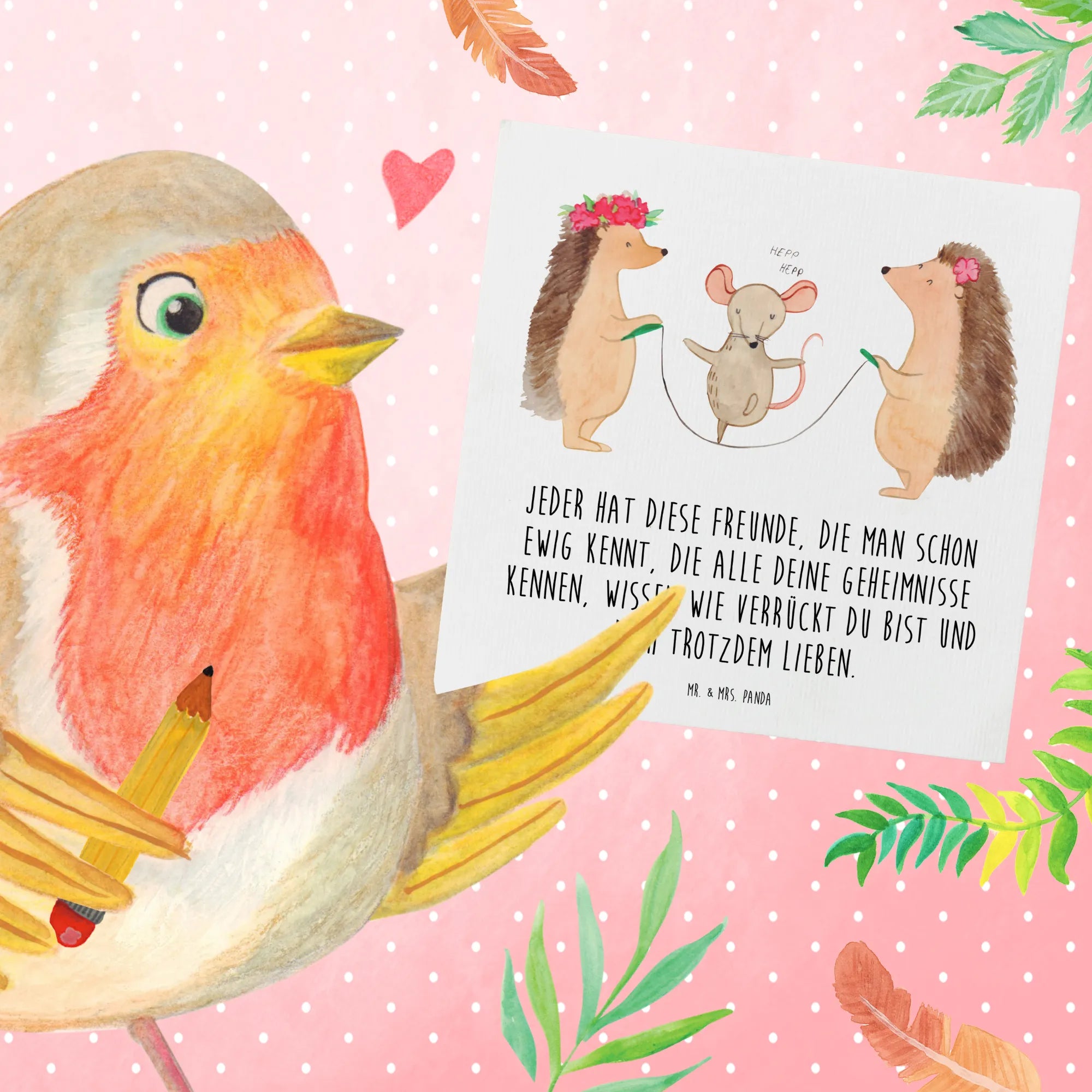 Die süßen Igel, die fröhlich seilhüpfend mit einer Maus um die Wette springen, sind nicht nur entzückende Motive, die sofort ein Lächeln ins Gesicht zaubern, sie laden auch dazu ein, gemeinsame Erinnerungen zu schätzen. Der Slogan 'Jeder hat diese Freunde, die man schon ewig kennt, die alle deine Geheimnisse kennen, wissen wie verrückt du bist und dich trotzdem lieben.' bringt die Botschaft von Freundschaft und Zusammenhalt perfekt zum Ausdruck.
