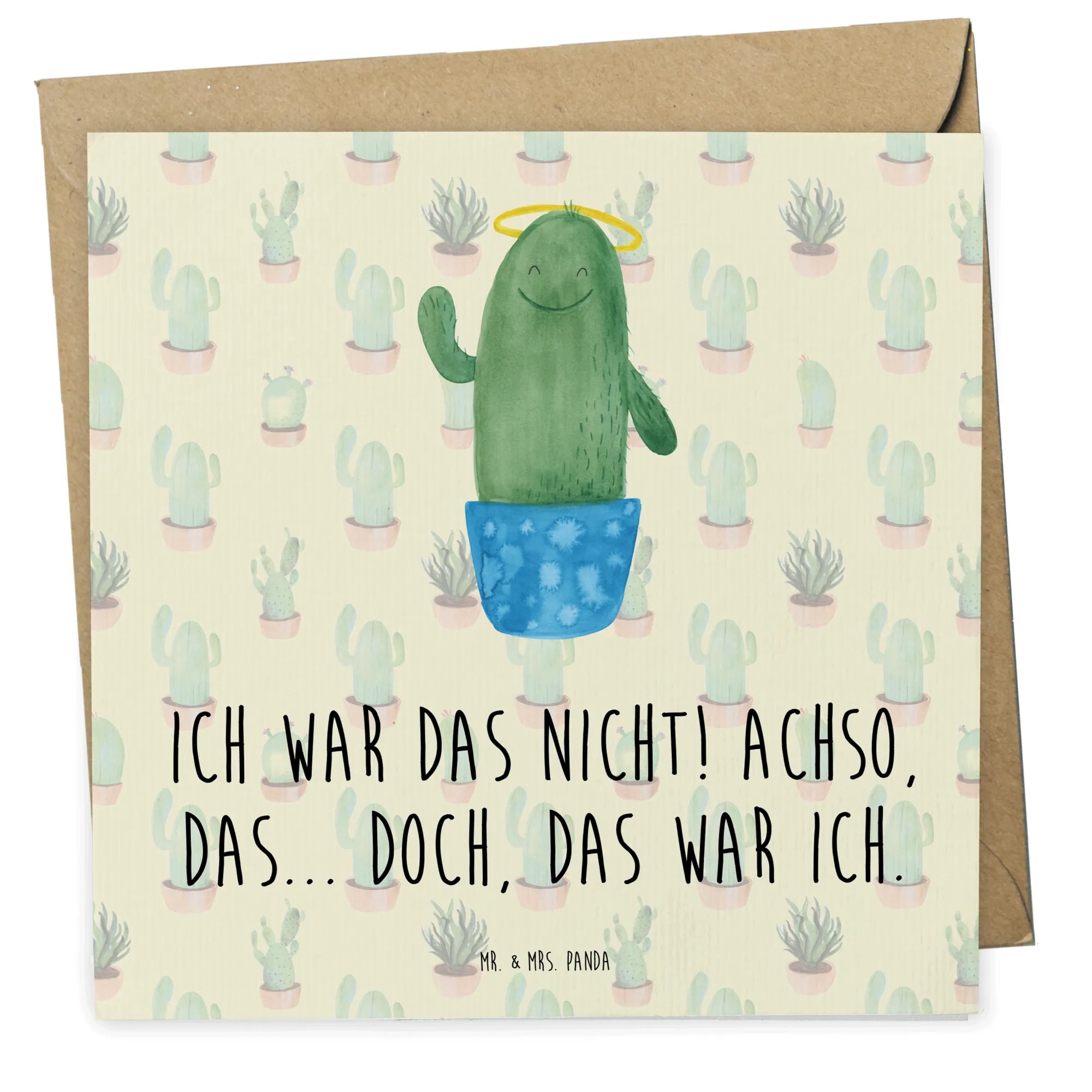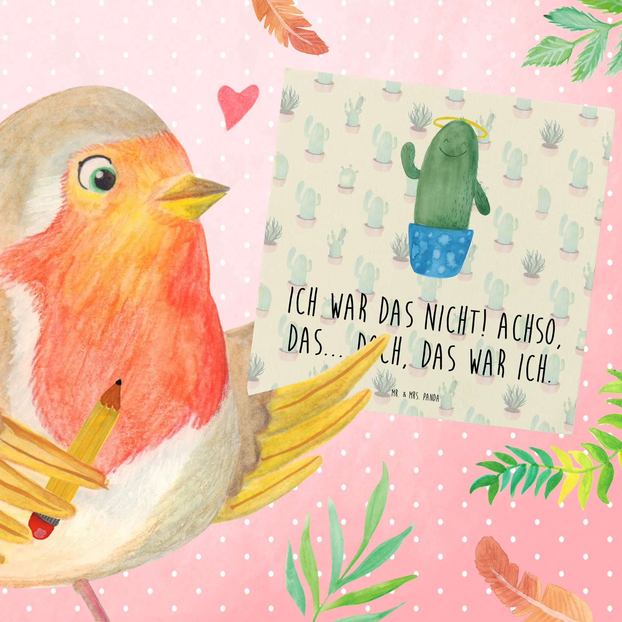 Die hochwertige Klappkarte misst 140 mm x 140 mm und ist aus edlem 300 Gramm Karton gefertigt. Sie hat eine hochglänzend veredelte Vorderseite mit dem liebevoll gestalteten Motiv eines fröhlichen Kaktus, der mit einem Heiligenschein in seinem Blumentopf steht. Mrs. Panda hat diesen kleinen Freund mit Aquarellfarben gezaubert, und niemand kann widerstehen, wenn dieser süße Kaktus in Erscheinung tritt!
