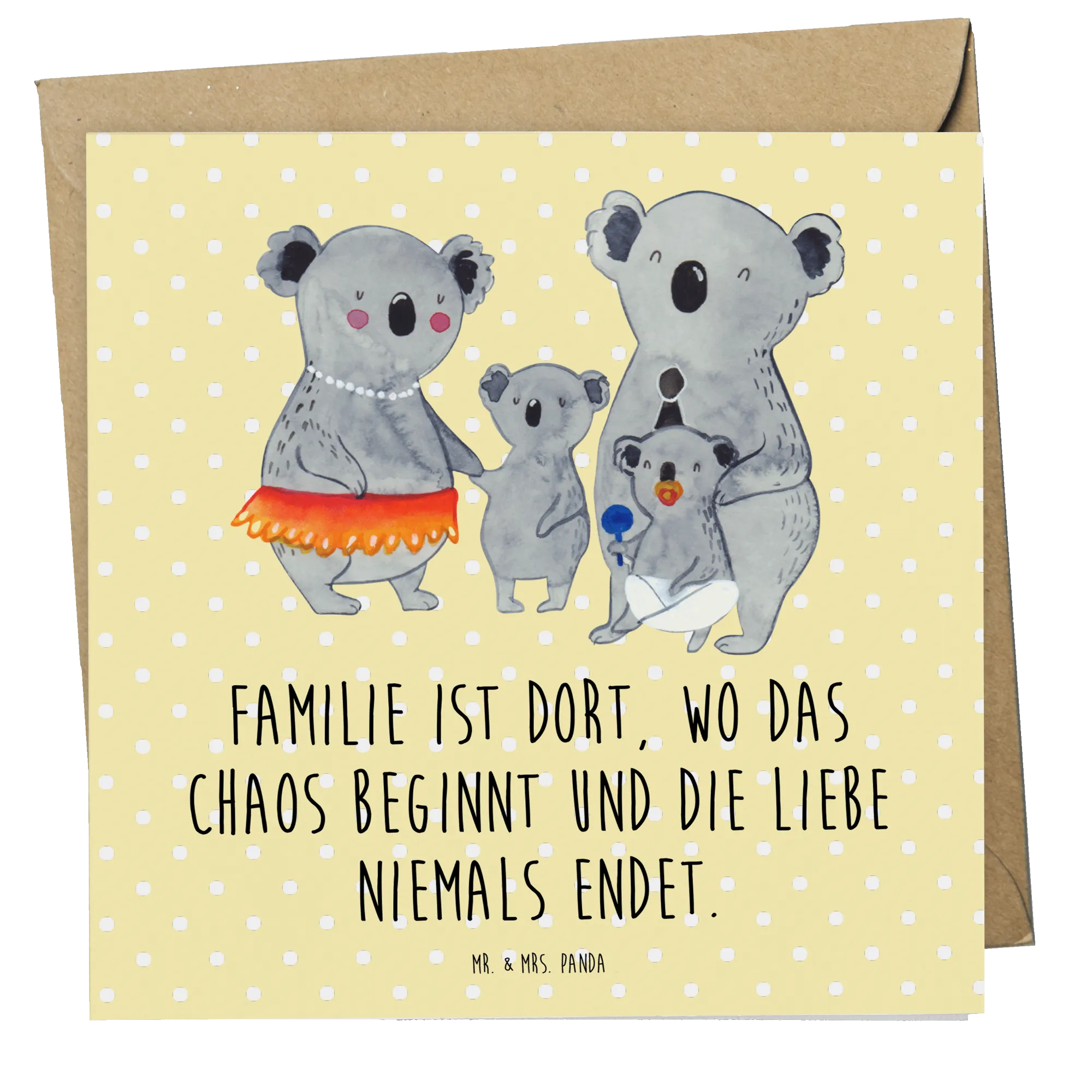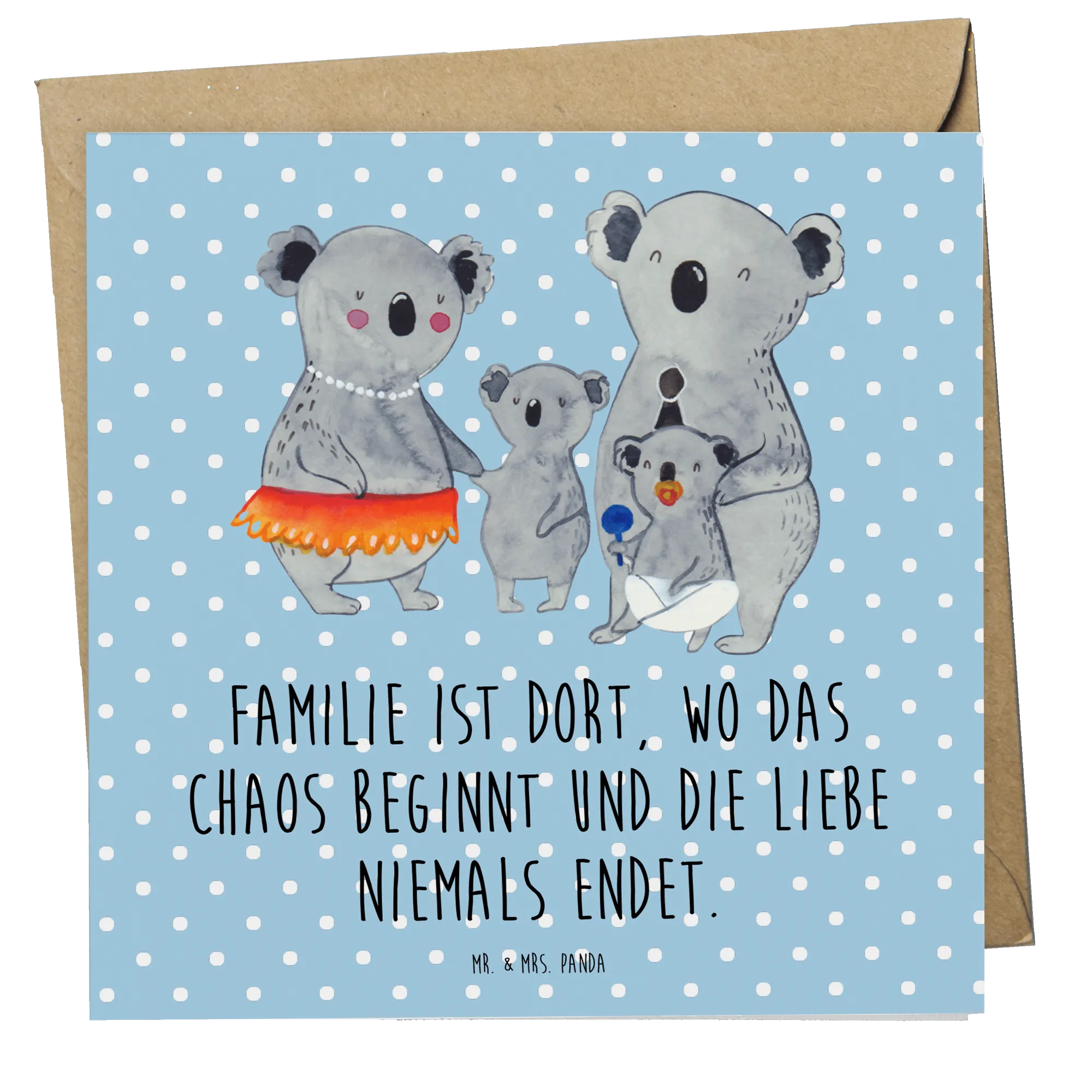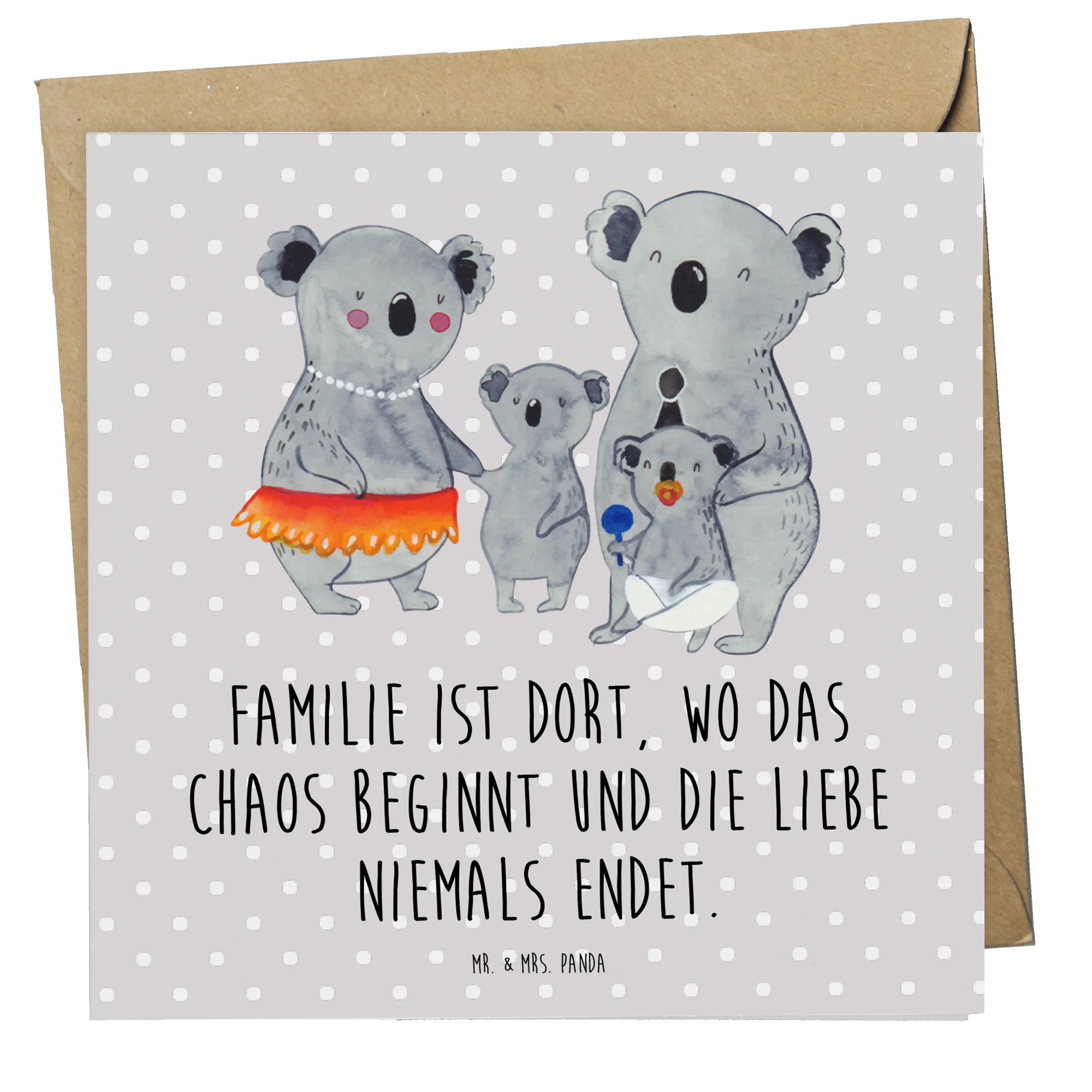 Das bezaubernde Motiv zeigt zwei größere Koalas in Menschenkleidung sowie zwei kleinere Koalas, die fröhlich nebeneinander stehen. Die größeren Koalas tragen einen Partyhut und eine Perlenkette, was die herzliche Stimmung unterstreicht. Familien sind das Herzstück in unserem Leben, und diese Karte vermittelt perfekt, wie wertvoll Familie ist - „Familie ist dort, wo das Chaos beginnt und die Liebe niemals endet“. Dieser Spruch ist ideal, um das Chaos und die Liebe, die mit einer Familie einhergehen, auf den Punkt zu bringen.