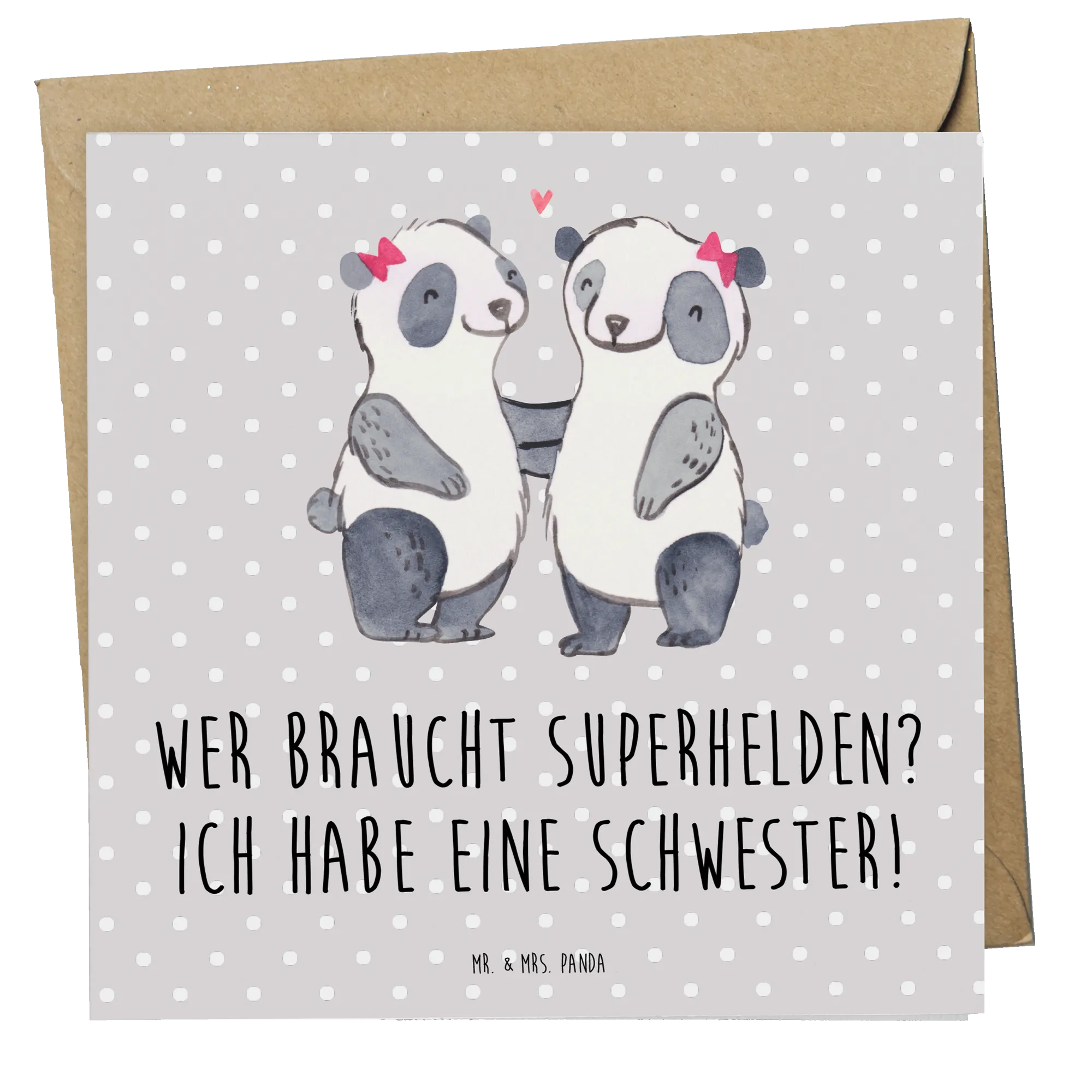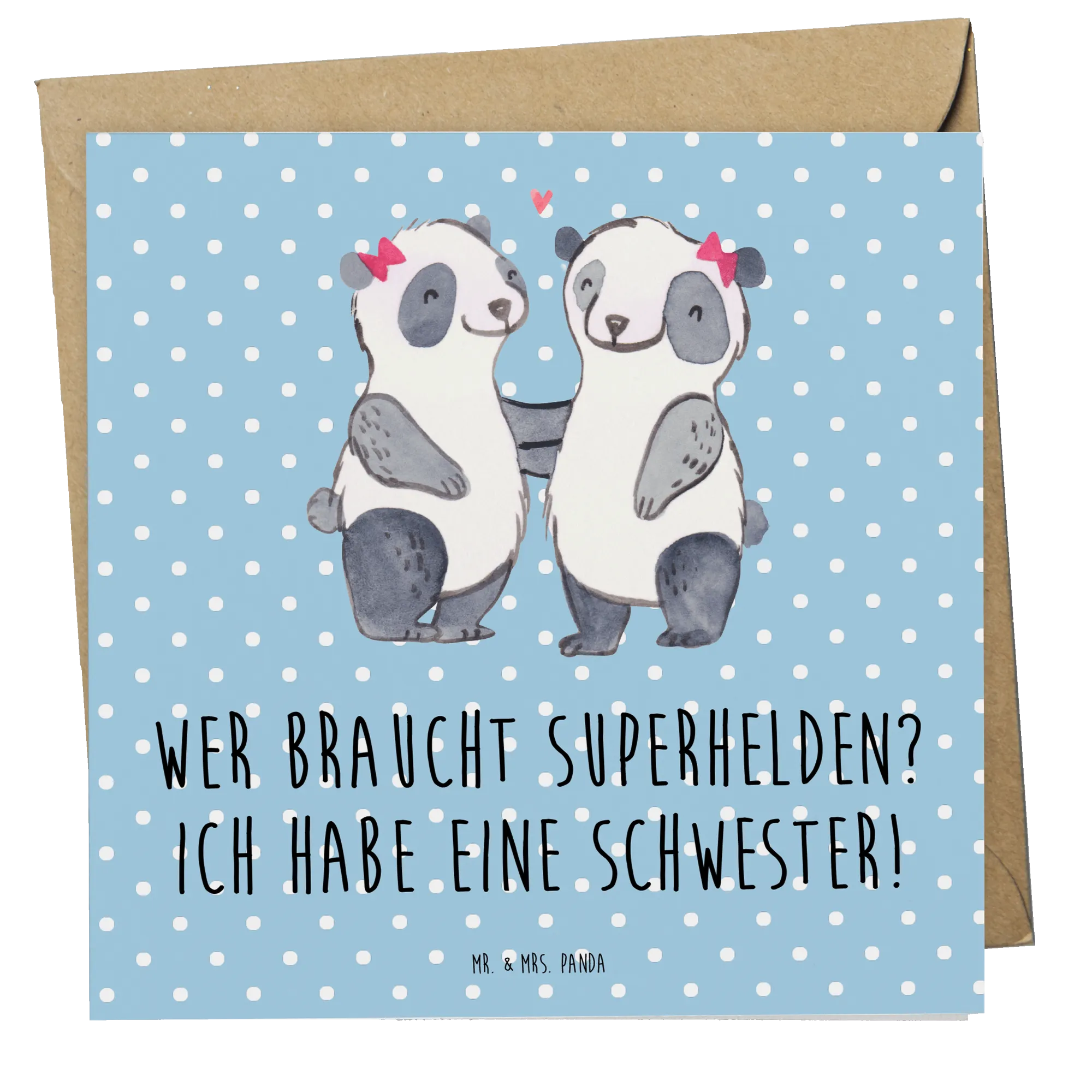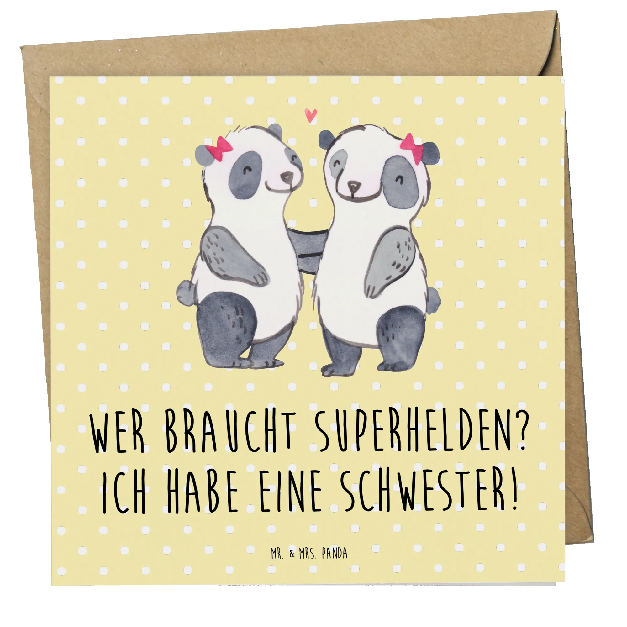 Die Deluxe Karte "Schwester" von Mr. & Mrs. Panda ist das ideale Geschenk für Geschwisterliebe und besondere Anlässe. Diese wunderschöne und besonders hochwertige quadratische Karte misst 140 mm x 140 mm und besteht aus edlem 300 Gramm Karton, der sowohl matt- als auch hochglänzend veredelt ist. Der Spruch "Wer braucht Superhelden? Ich habe eine Schwester!" fängt die einzigartige Verbindung zwischen Schwestern ein und zaubert jedem Empfänger ein Lächeln ins Gesicht.