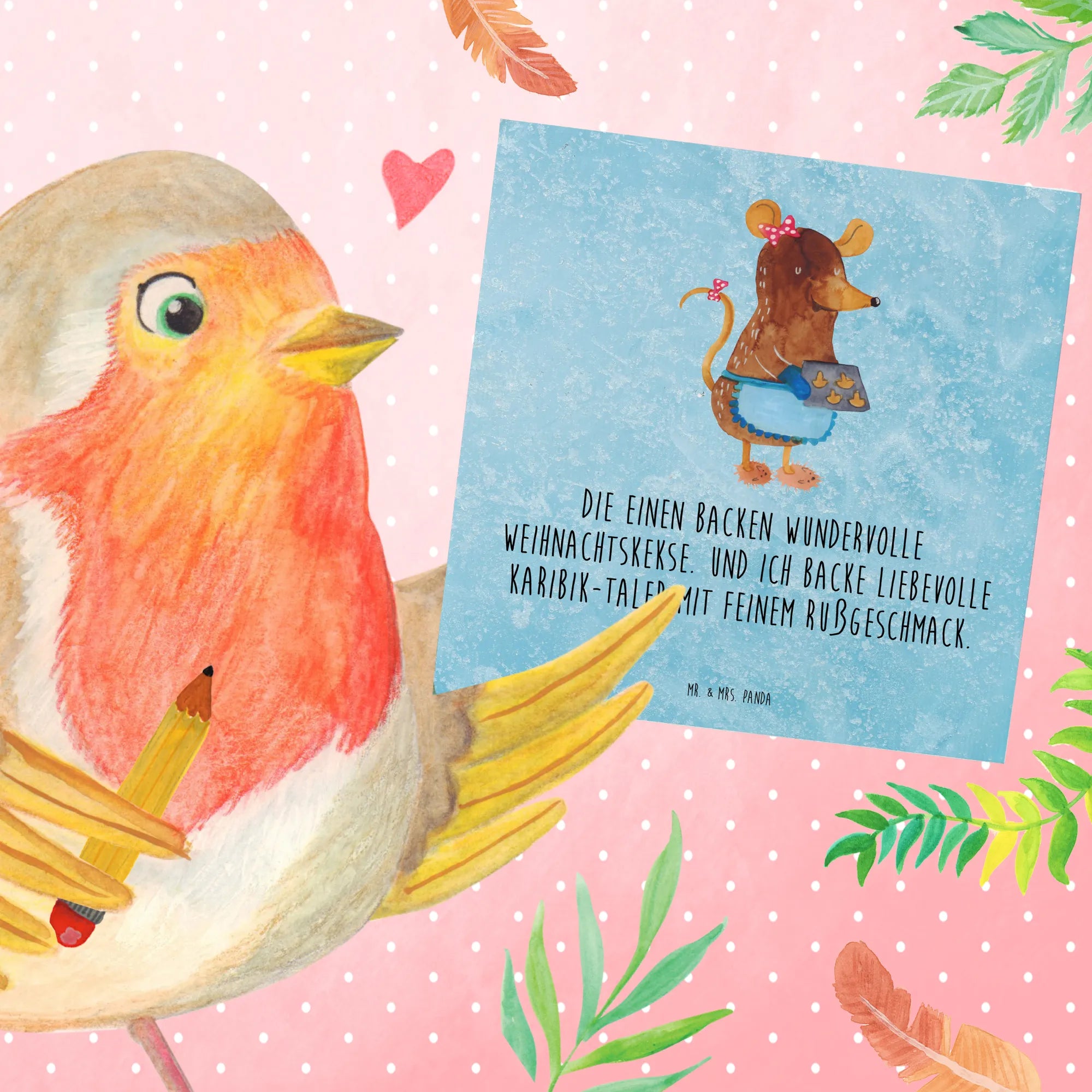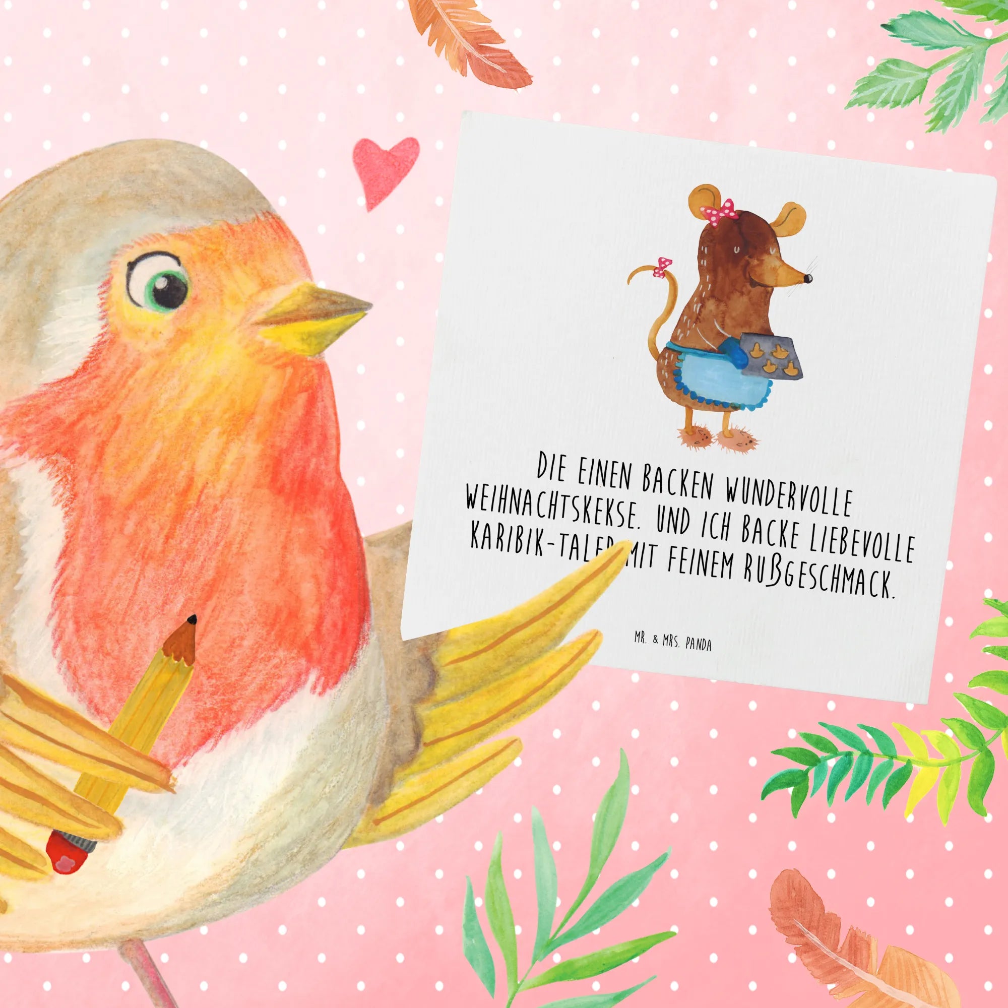 Egal, ob du sie zu Weihnachten, zum Geburtstag oder für eine Hochzeit verschickst – diese Karte bringt garantiert Freude und lädt zum Schmunzeln ein. Auf der Vorderseite der Karte prangt das entzückende Motiv einer kleinen Maus, die fröhlich beim Kekse backen ist. Der dazugehörige Spruch 'Die einen backen wundervolle Weihnachtskekse. Und ich backe liebevolle Karibik-Taler mit feinem Rußgeschmack.' sorgt dafür, dass dein Gruß sofort ein Lächeln auf die Lippen zaubert.