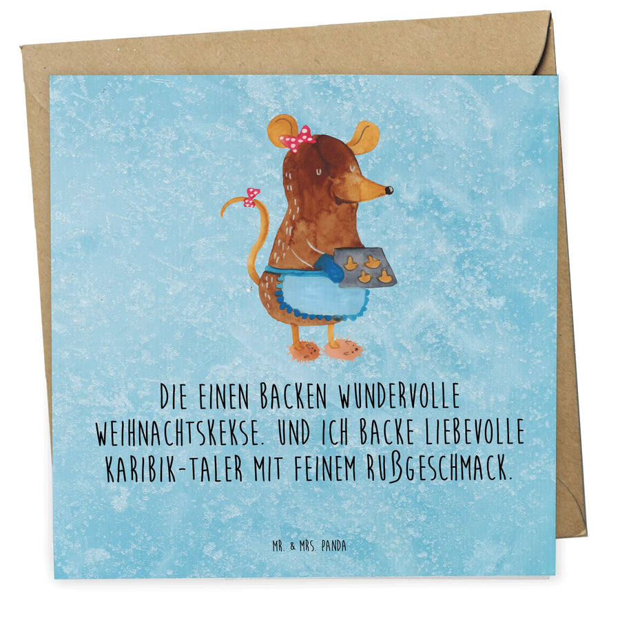 Egal, ob du sie zu Weihnachten, zum Geburtstag oder für eine Hochzeit verschickst – diese Karte bringt garantiert Freude und lädt zum Schmunzeln ein. Auf der Vorderseite der Karte prangt das entzückende Motiv einer kleinen Maus, die fröhlich beim Kekse backen ist. Der dazugehörige Spruch 'Die einen backen wundervolle Weihnachtskekse. Und ich backe liebevolle Karibik-Taler mit feinem Rußgeschmack.' sorgt dafür, dass dein Gruß sofort ein Lächeln auf die Lippen zaubert.