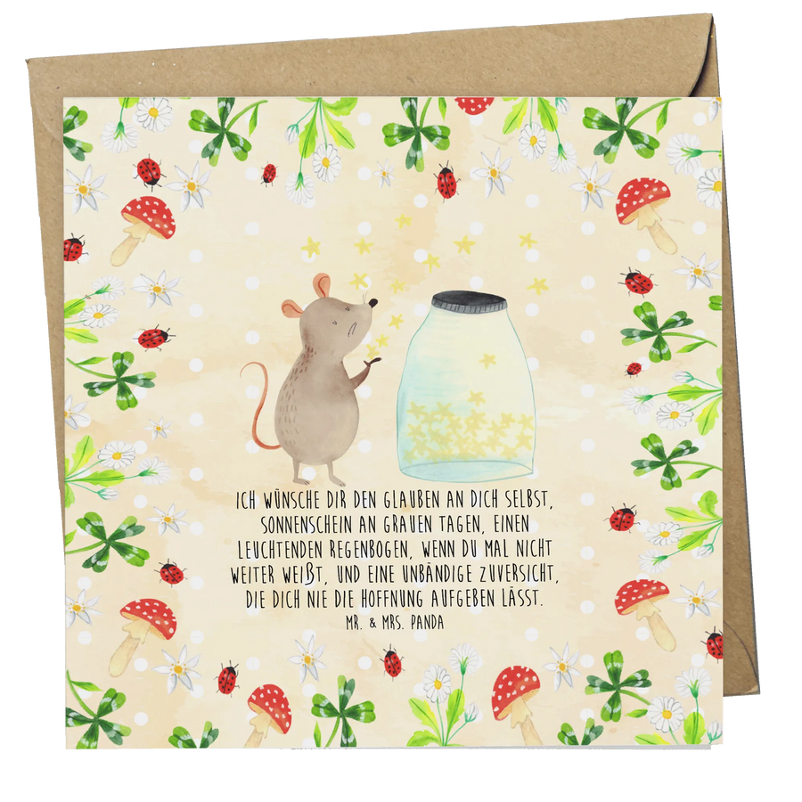 Die fröhliche Maus, die vor einem Glas mit strahlenden Sternen sitzt, symbolisiert Wünsche und Träume. Mit dem Spruch 'Ich wünsche dir den Glauben an dich selbst, Sonnenschein an grauen Tagen, einen leuchtenden Regenbogen, wenn du mal nicht weiter weißt, und eine unbändige Zuversicht, die dich nie die Hoffnung aufgeben lässt.' vermittelt diese Karte eine ganz besondere Botschaft der Hoffnung und des Optimismus.
