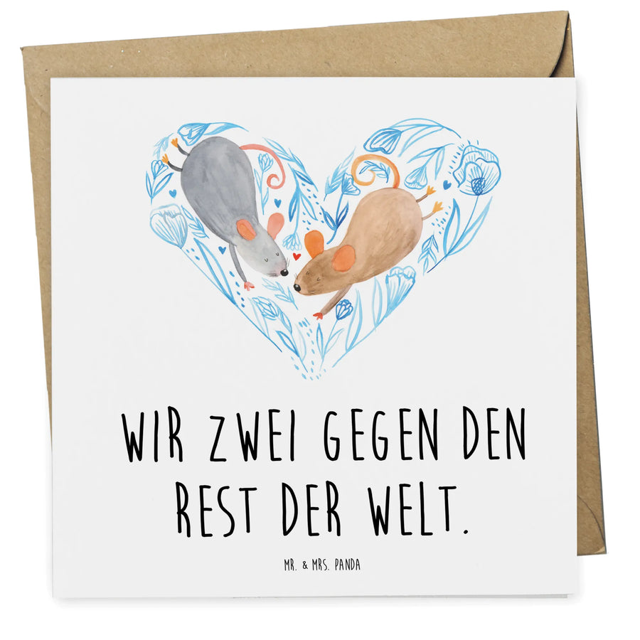 Auf der Vorderseite siehst du zwei süße Mäuse, die liebevoll ein Herz formen, und der Spruch "Wir zwei gegen den Rest der Welt" rundet das Ganze ab. Der edle Karton und die sanften Aquarellfarben verleihen der Karte eine ganz besondere Eleganz. Mit einem Maß von 140 mm x 140 mm passt sie perfekt in den included Umschlag.