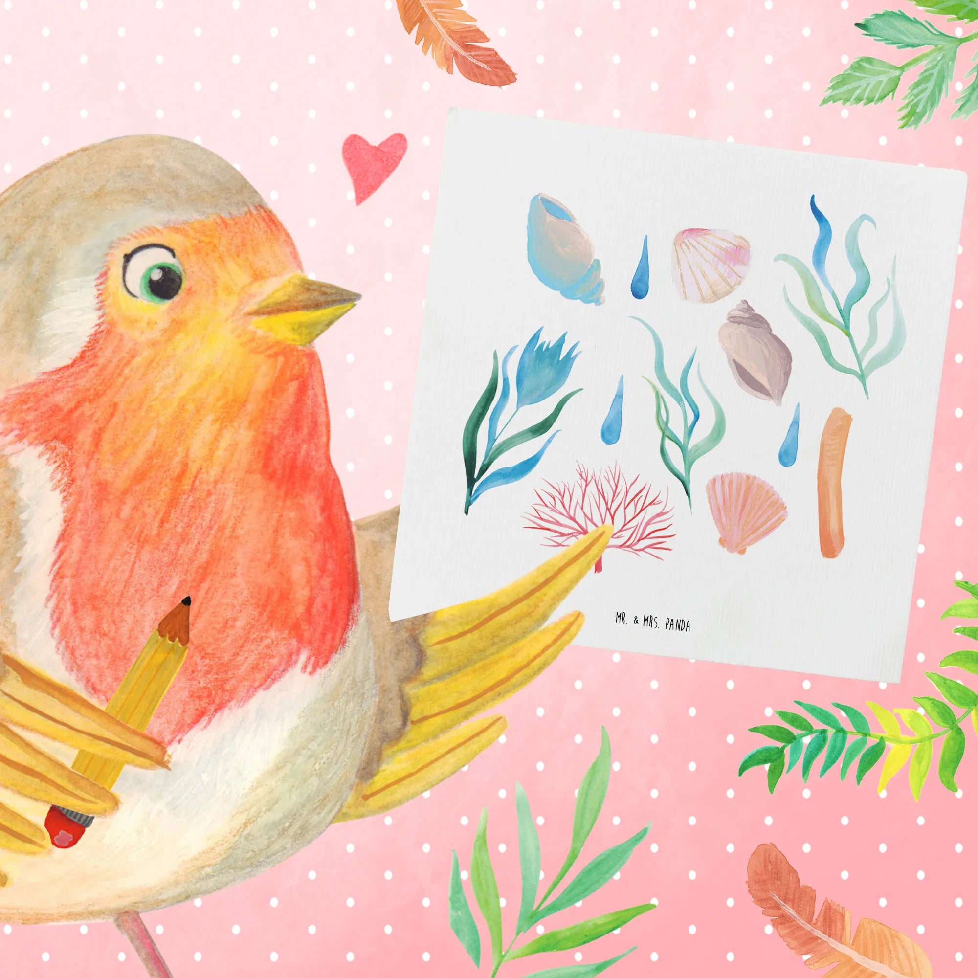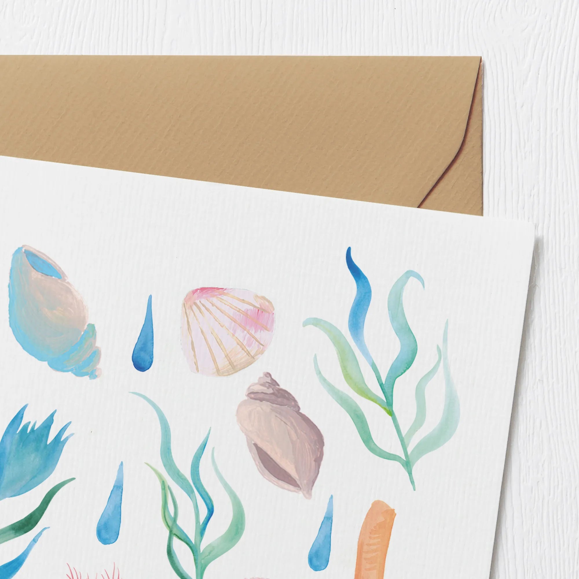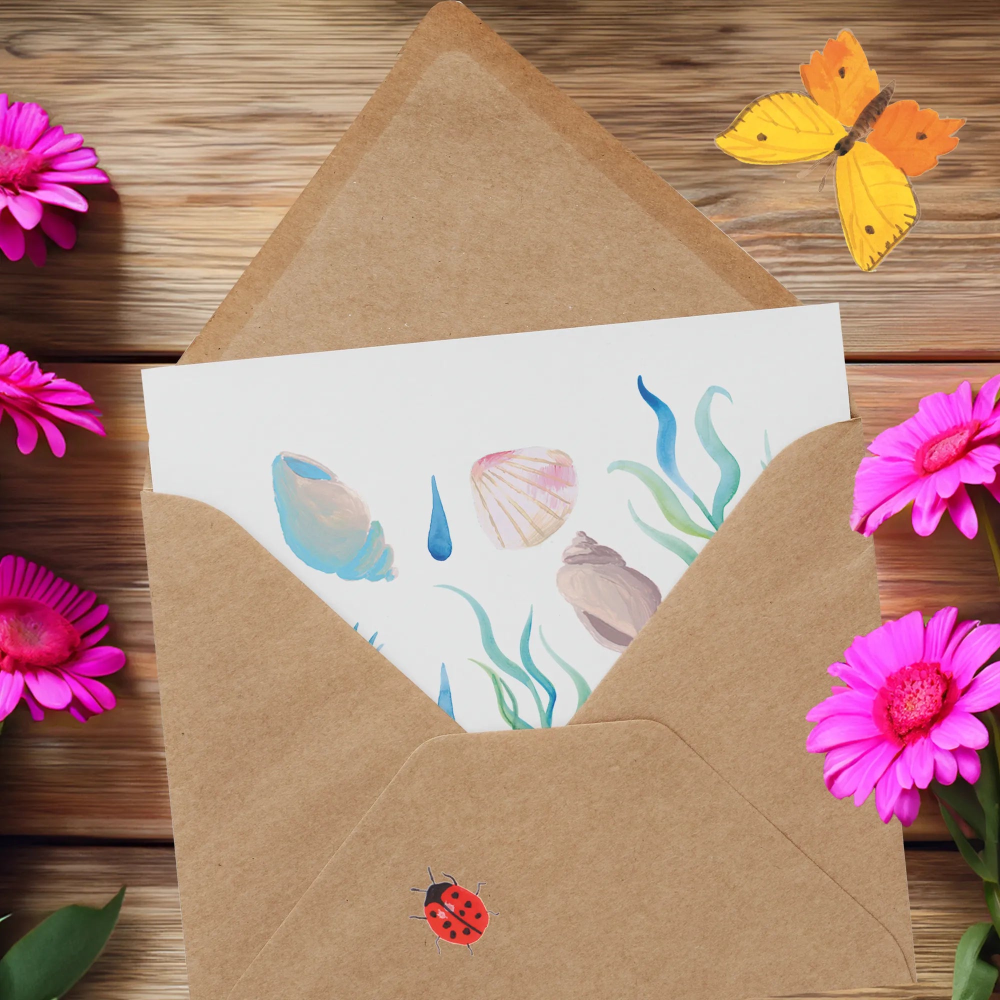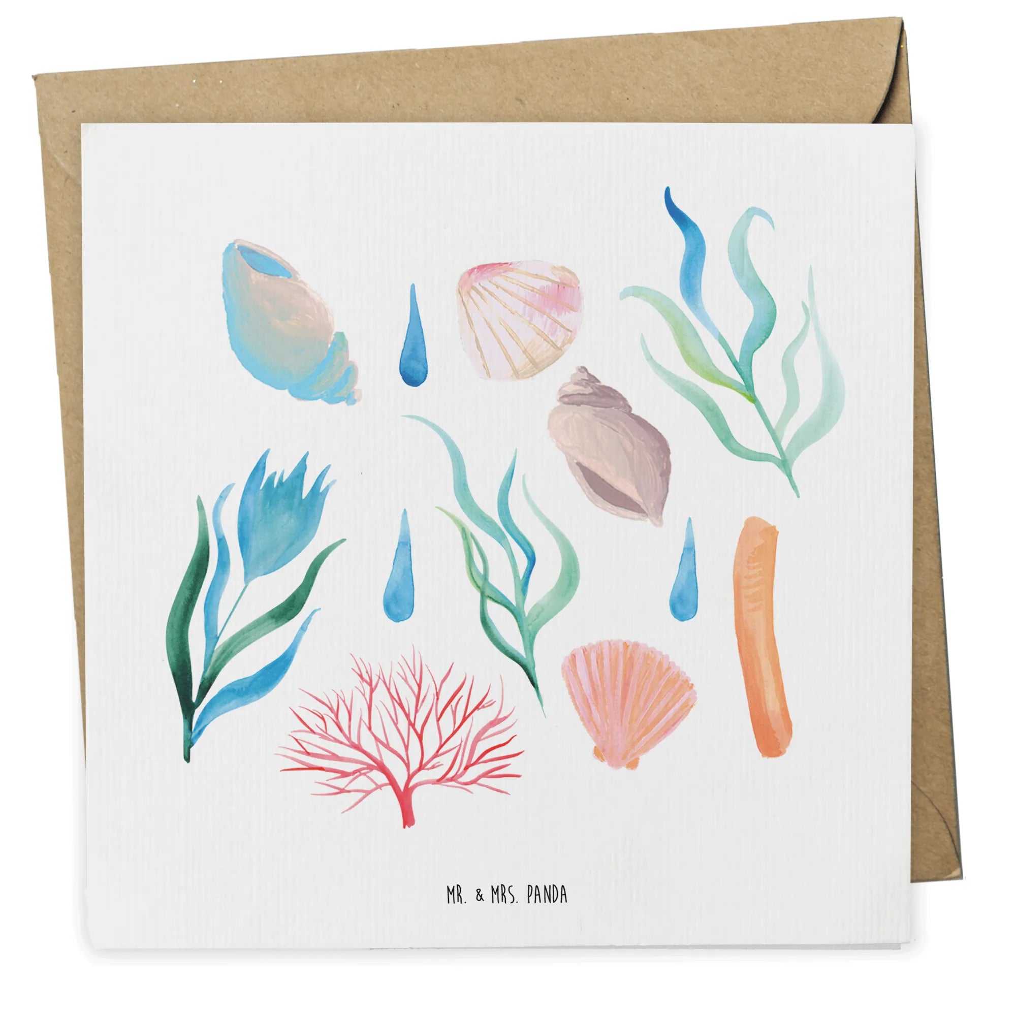 Das Meeresrauschen Design bringt den Zauber des Strandes direkt zu dir nach Hause. Mit liebevoll handgezeichneten Motiven von Muscheln, Korallen und zarten Wassertropfen in beruhigenden Aquarellfarben zaubert diese Karte ein Gefühl von Freiheit und Entspannung in jedes Zuhause. Die zarten Blau- und Grüntöne kombiniert mit sanftem Rosa und Orange schaffen eine harmonische, beruhigende Komposition, die das sanfte Rauschen des Meeres widerspiegelt.