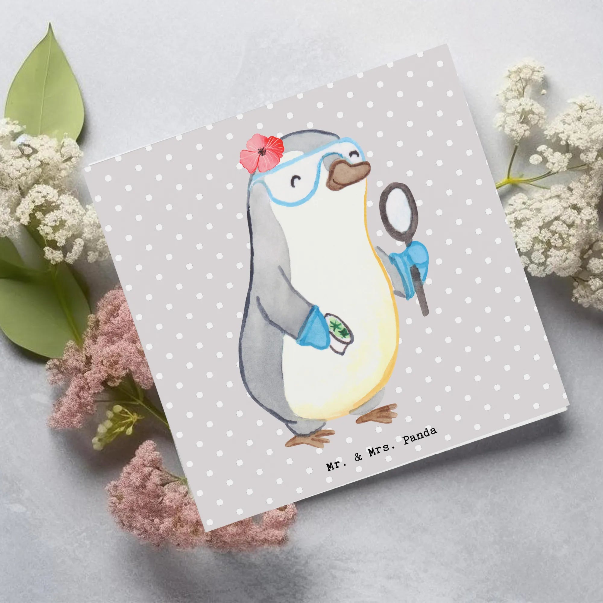 Lass dich von der niedlichen Pinguindame inspirieren, die als Mikrobiologin Mikroorganismen wie Viren und Bakterien erforscht. Diese Karte ist mit viel Liebe und Fantasie handgezeichnet und zeigt einen süßen Pinguin mit Handschuhen und Schutzbrille, der ein Reagenzglas in der Hand hält.