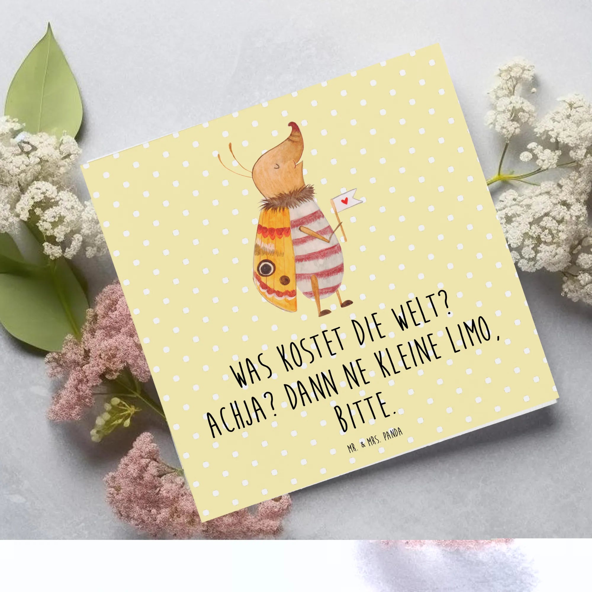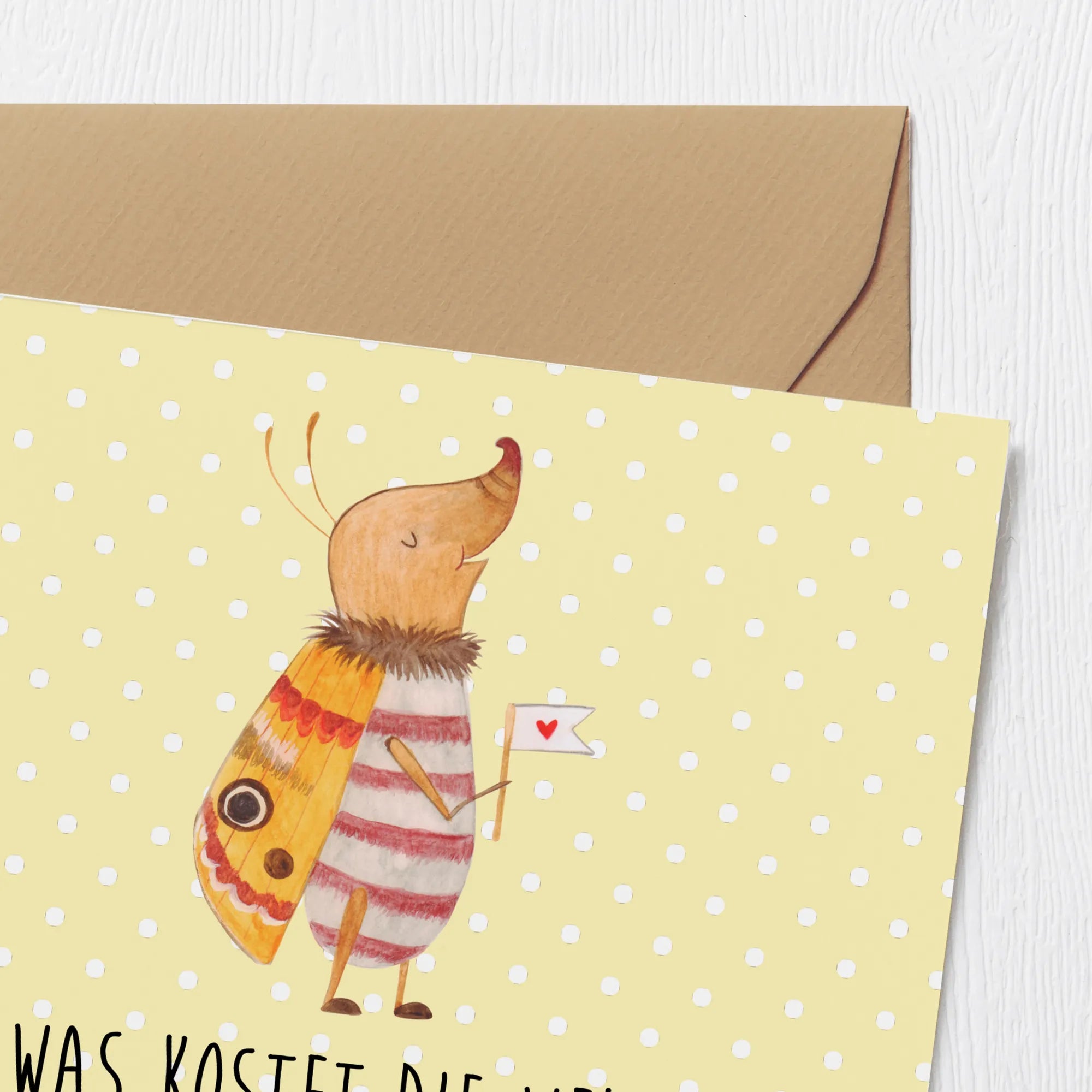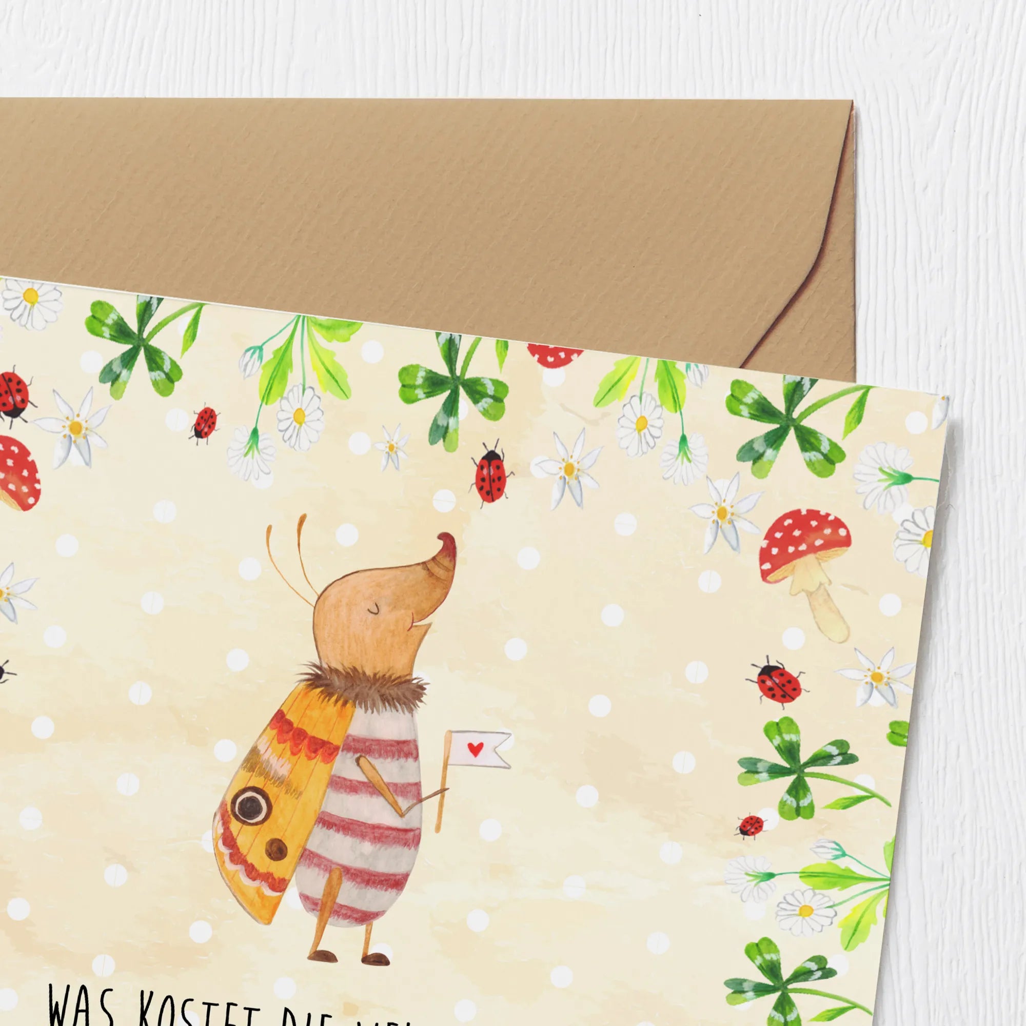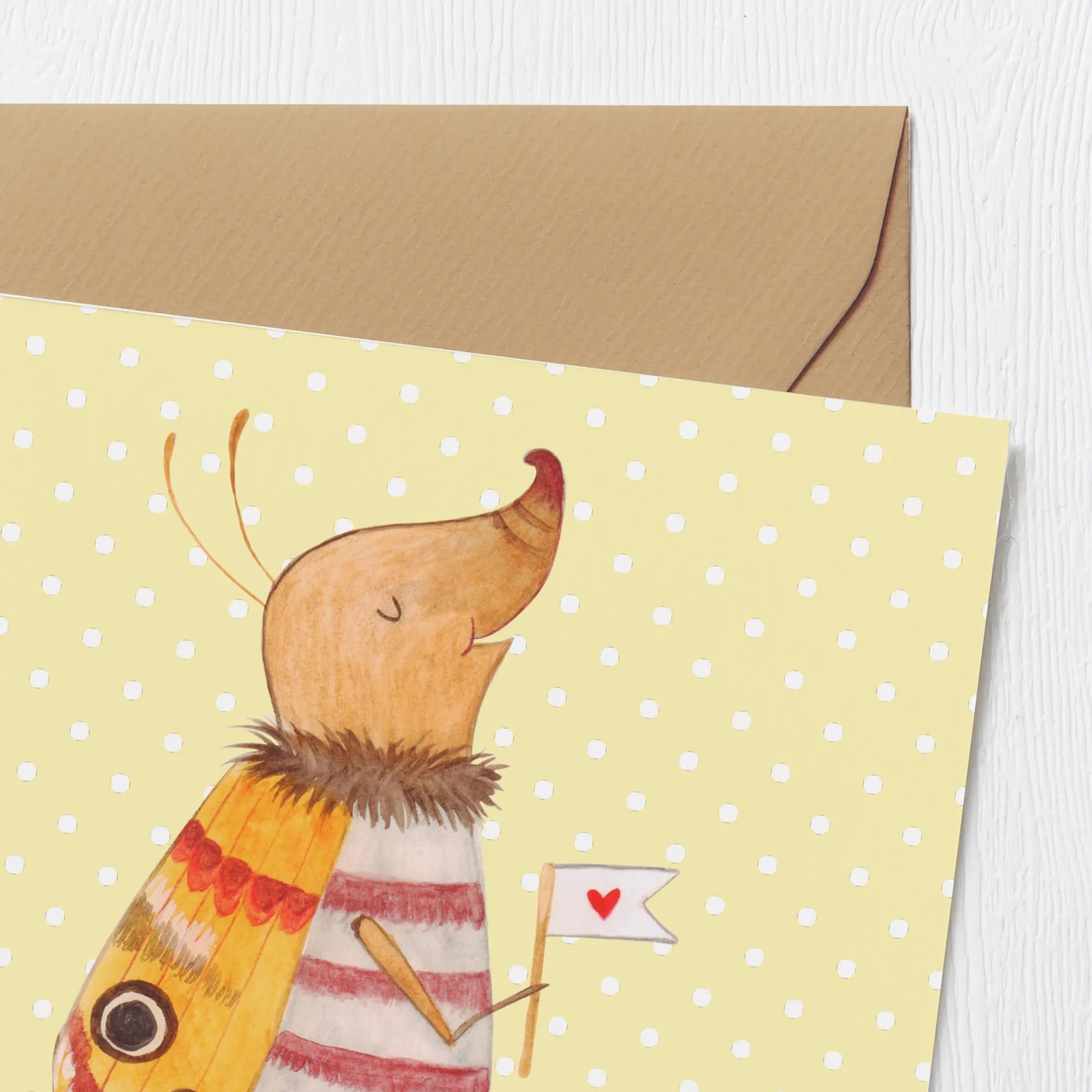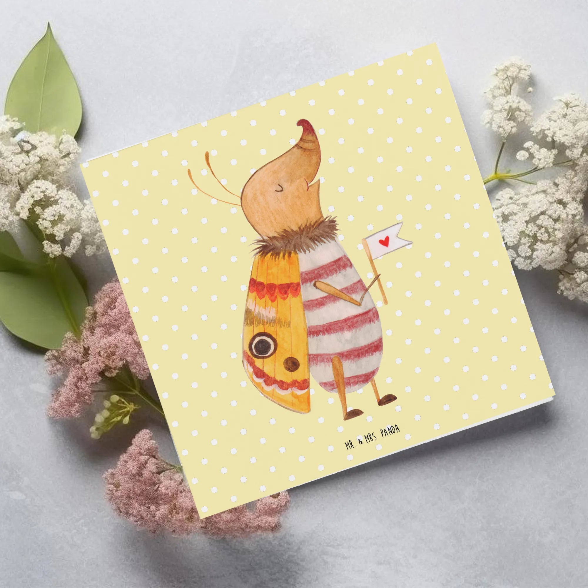Diese hochwertige Grußkarte von Mr. & Mrs. Panda misst 140 mm x 140 mm und wird aus edlem 300 Gramm Karton hergestellt. Mit einem Motiv, das einen kleinen, glücklichen Nachtfalter zeigt, der eine herzförmige Fahne trägt, bereit für neue Abenteuer, bringt sie Freude und positive Energie in jede Botschaft!