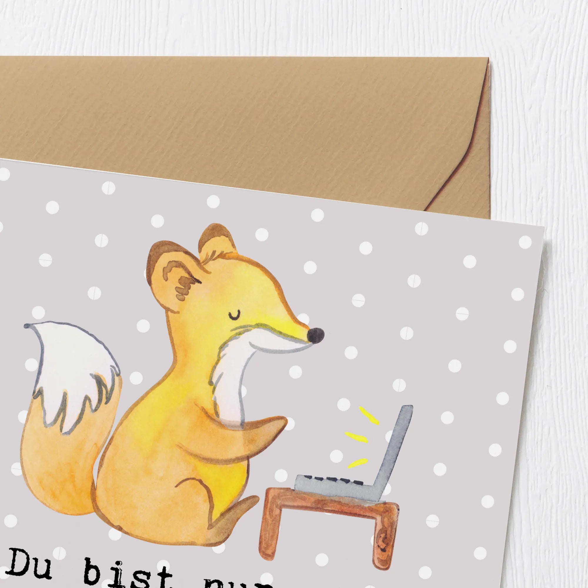 Diese hochwertige Klappkarte hat die perfekte Größe von 140 mm x 140 mm und wird aus edlem 300 Gramm Karton gefertigt, was ihr eine sehr ansprechende und hochwertige Optik verleiht. Auf der Vorderseite der Karte befindet sich ein bezauberndes Motiv: ein süßer Fuchs, der an einer Schreibmaschine tippt – ein klares Zeichen für die Kreativität und Passion einer Online Redakteurin. Auf der Karte steht der witzige Text: "Du bist nur ein halber Mensch, wenn du keine Online Redakteurin bist."