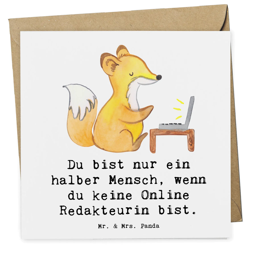 Die Deluxe Karte "Online Redakteurin mit Herz" aus der einzigartigen Berufe-Kollektion von Mr. & Mrs. Panda ist das perfekte Geschenk für all jene kreativen Köpfe, die mit Leidenschaft als Online Redakteurinnen arbeiten. Diese wunderschöne, quadratische Karte ist nicht nur hochwertig gefertigt aus edlem 300 Gramm Karton, sondern begeistert auch durch ihre liebevoll handgezeichnete Illustration eines süßen Fuchses, der emsig an einer Schreibmaschine tippt.