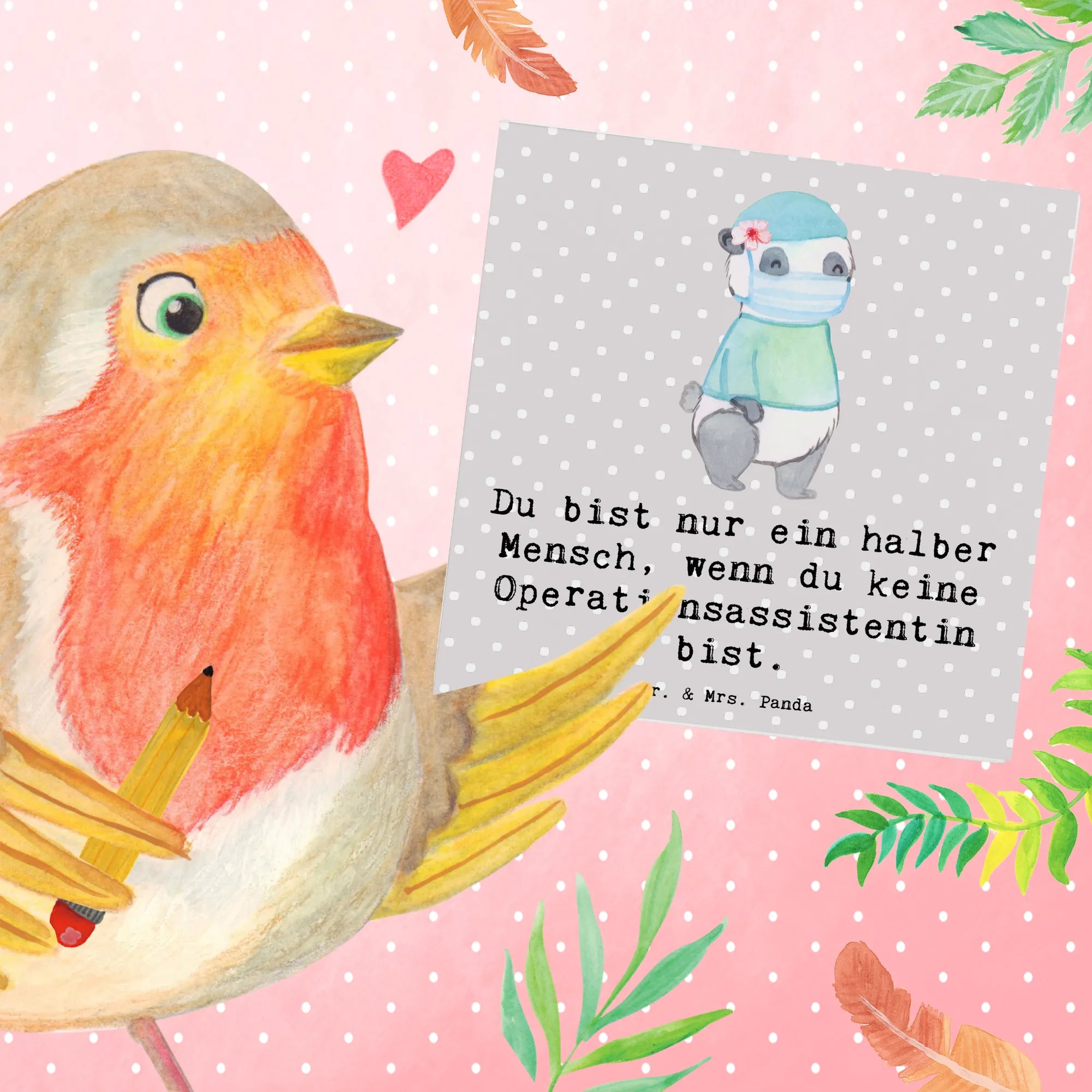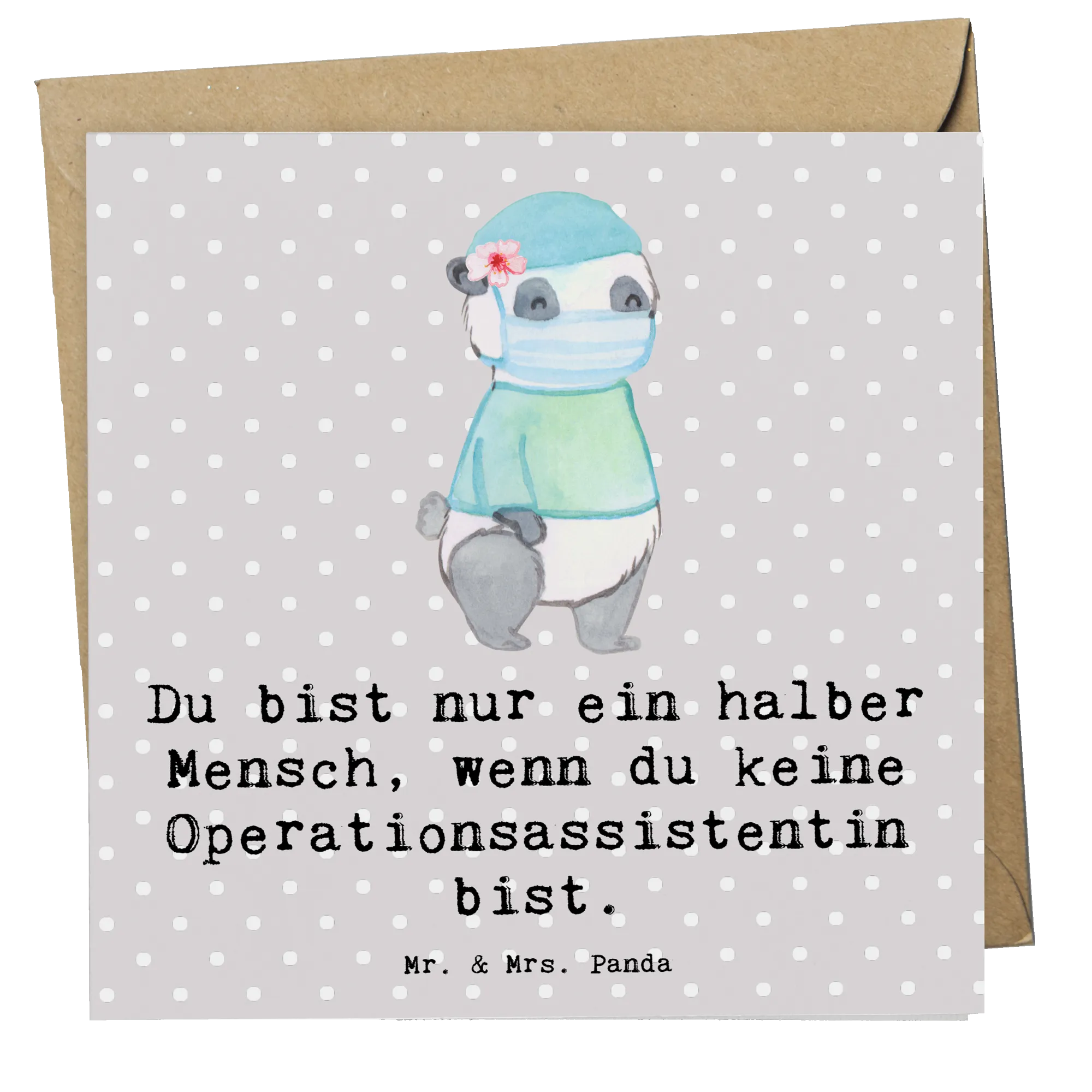 Die Karte überzeugt durch ein liebevolles Design: Unsere charmante Pandadame trägt stolz ihren blauen Kittel und Mundschutz und strahlt Freude an ihrem Beruf aus. Neben dem lustigen Slogan "Du bist nur ein halber Mensch, wenn du keine Operationsassistentin bist!" bringt sie ein Lächeln in den Alltag und zeigt, wie wichtig und wertvoll die Arbeit in der Operationsassistenz ist.