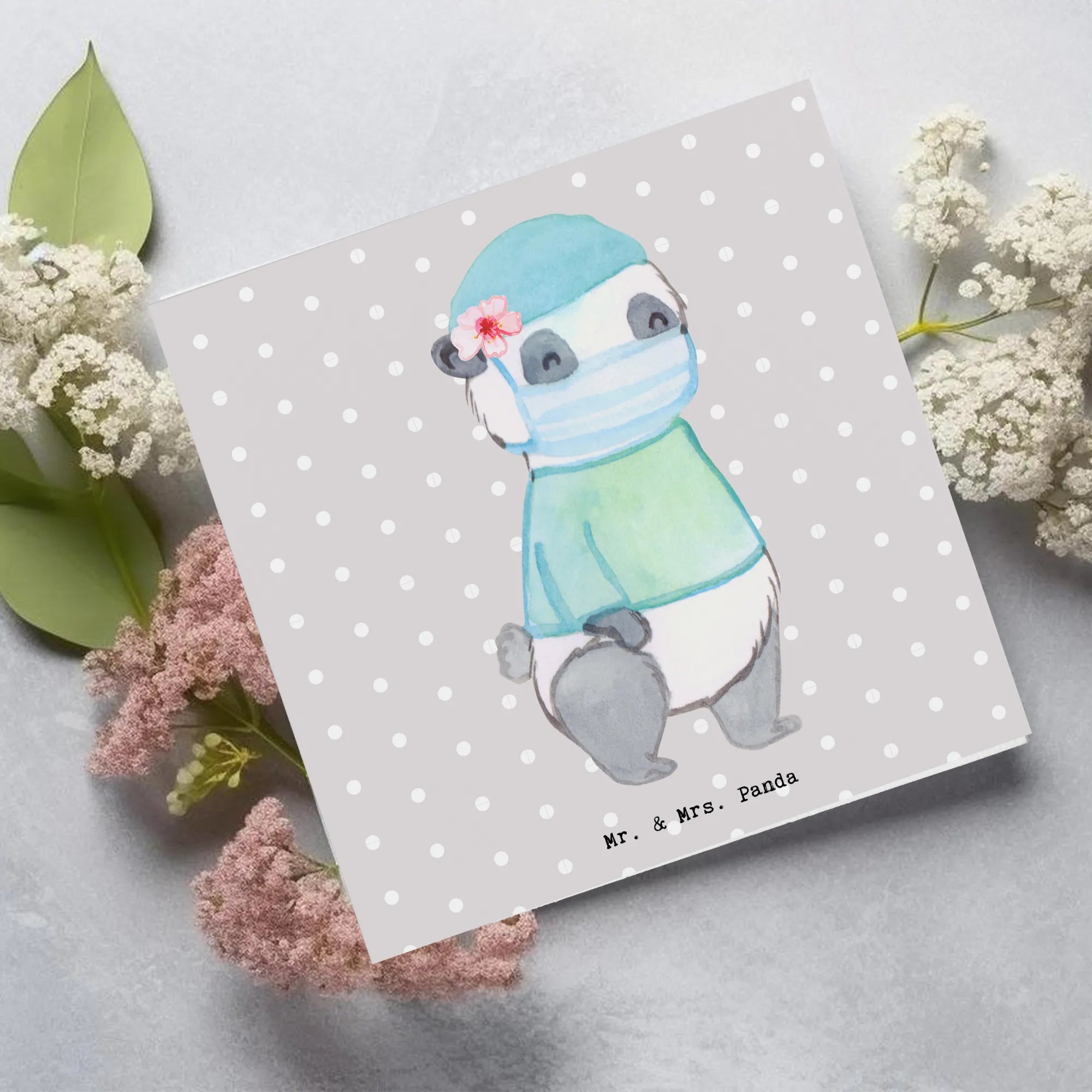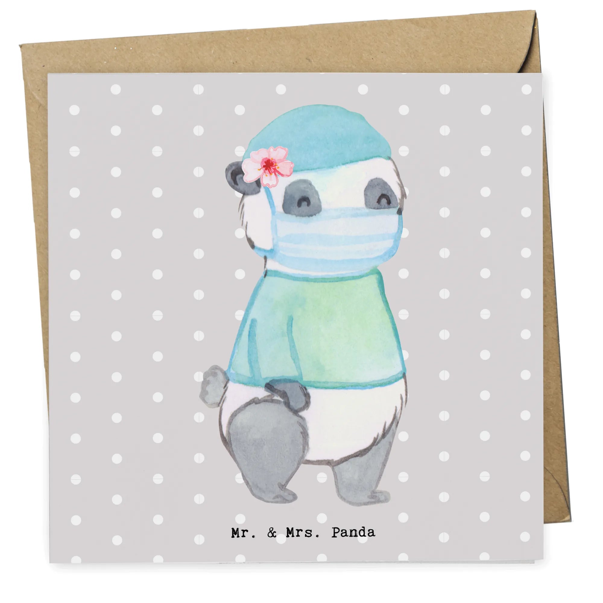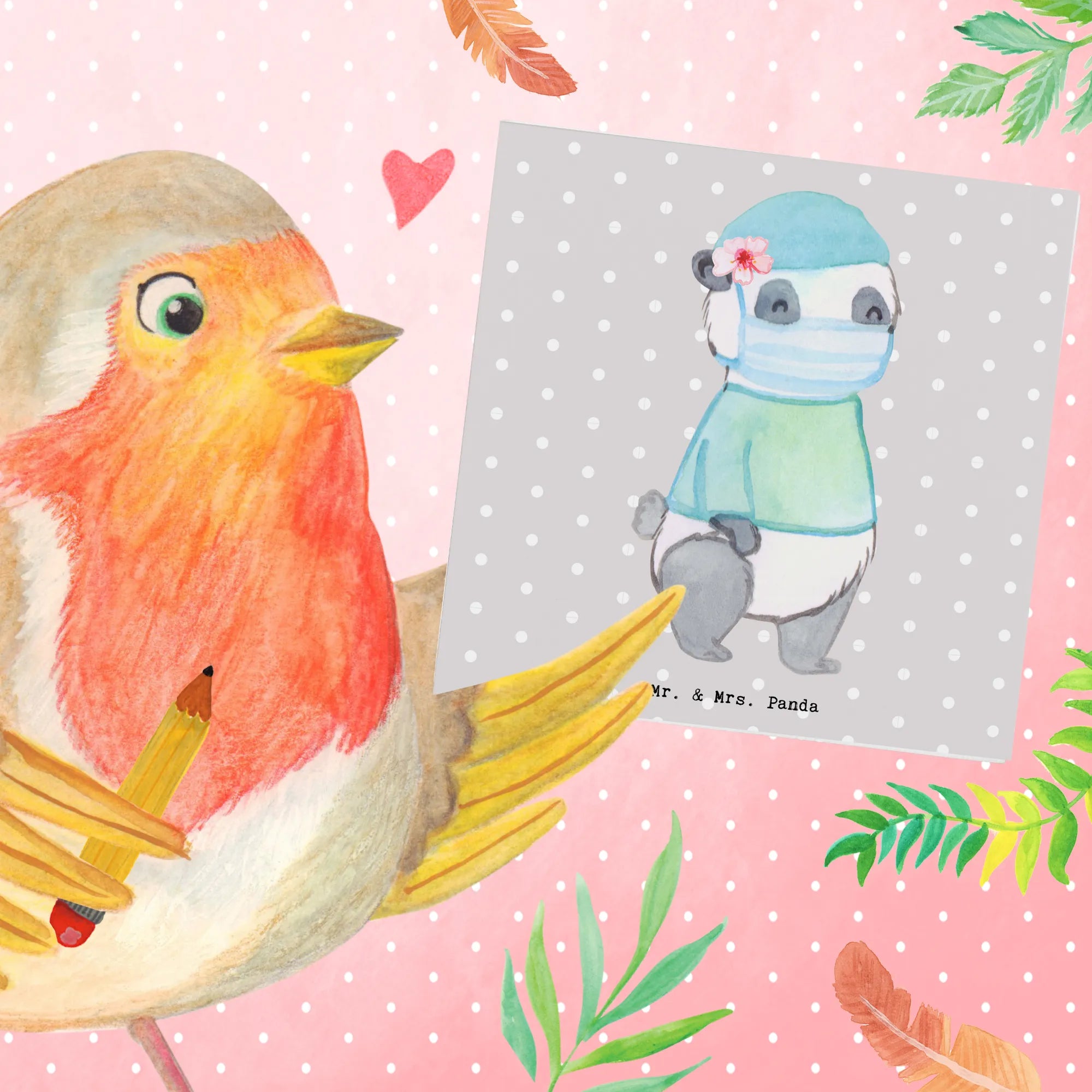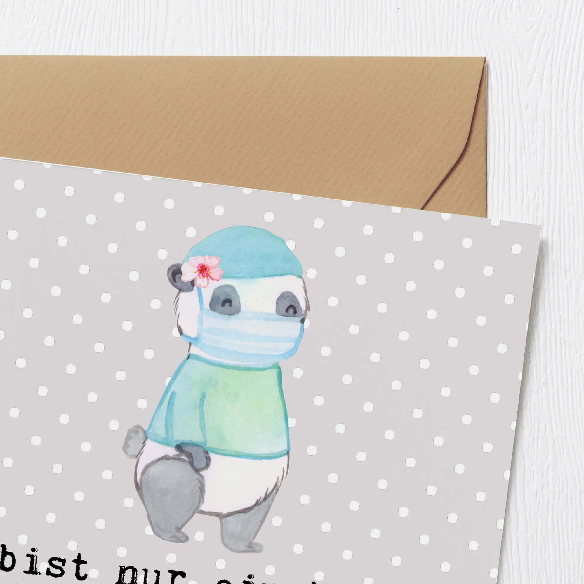 Die hochwertige 140 mm x 140 mm Karte besteht aus edlem 300 Gramm Karton und besticht durch ihre hochglänzende Vorderseite mit einem zauberhaften Motiv: einem niedlichen Panda in blauem Kittel, ausgestattet mit Mundschutz. Das Herz-Symbol unterstreicht die Liebe zu diesem Beruf.