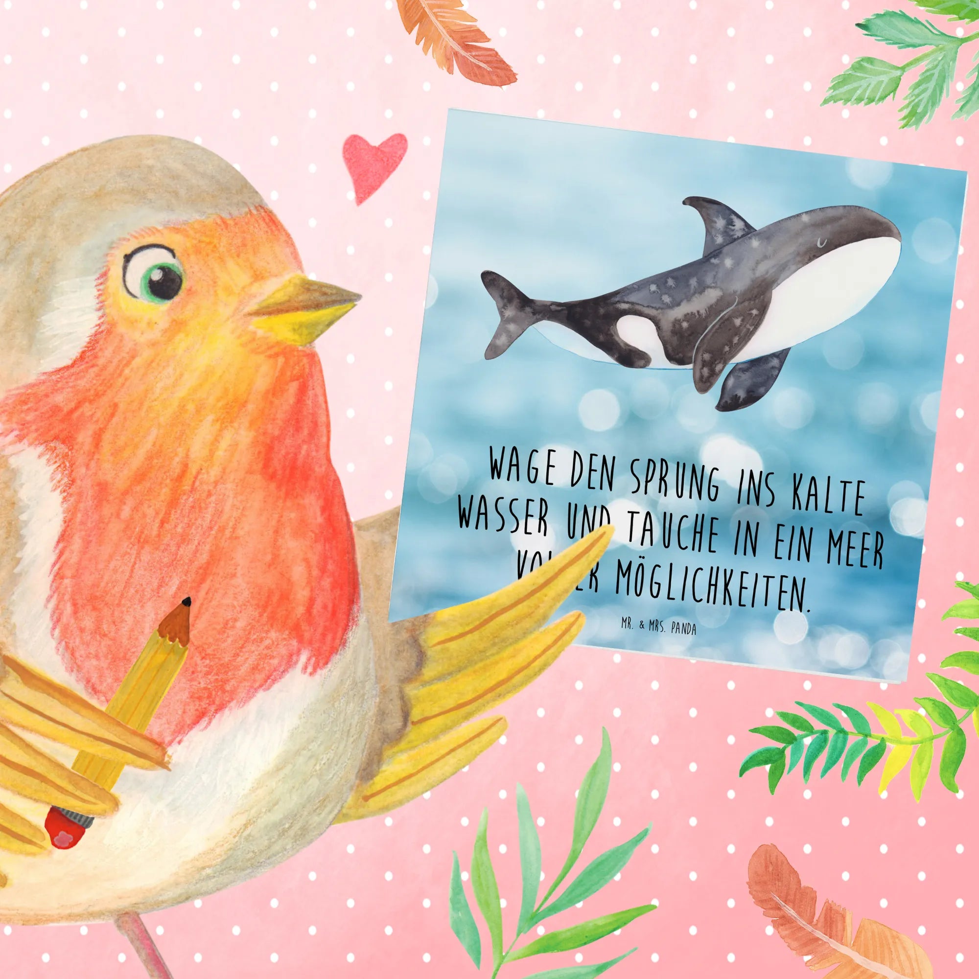 Unsere Deluxe Karte Orca aus der Meerestiere-Kollektion von Mr. & Mrs. Panda ist eine liebevolle, hochwertige Klappkarte für besondere Momente. Auf der quadratischen Karte findest Du ein freundliches Orca-Motiv im Aquarell-Stil – zarte Blau- und Grautöne, die das Meergefühl einfangen. Dazu der inspirierende Spruch: „Wage den Sprung ins kalte Wasser und tauche in ein Meer voller Möglichkeiten.“