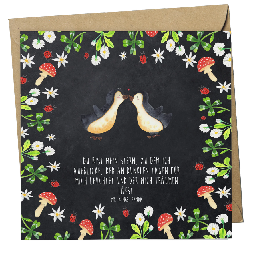 Unsere zauberhafte quadratische Grußkarte aus der Liebe-Kollektion von Mr. & Mrs. Panda zeigt zwei kuschelnde Pinguine, die sich sanft an den Schnäbeln berühren. Ein kleines Herz über ihnen symbolisiert die zärtliche Verbundenheit – perfekt als Hochzeitskarte, Verlobungskarte oder als Geschenk zum Jahrestag. 🐧❤️