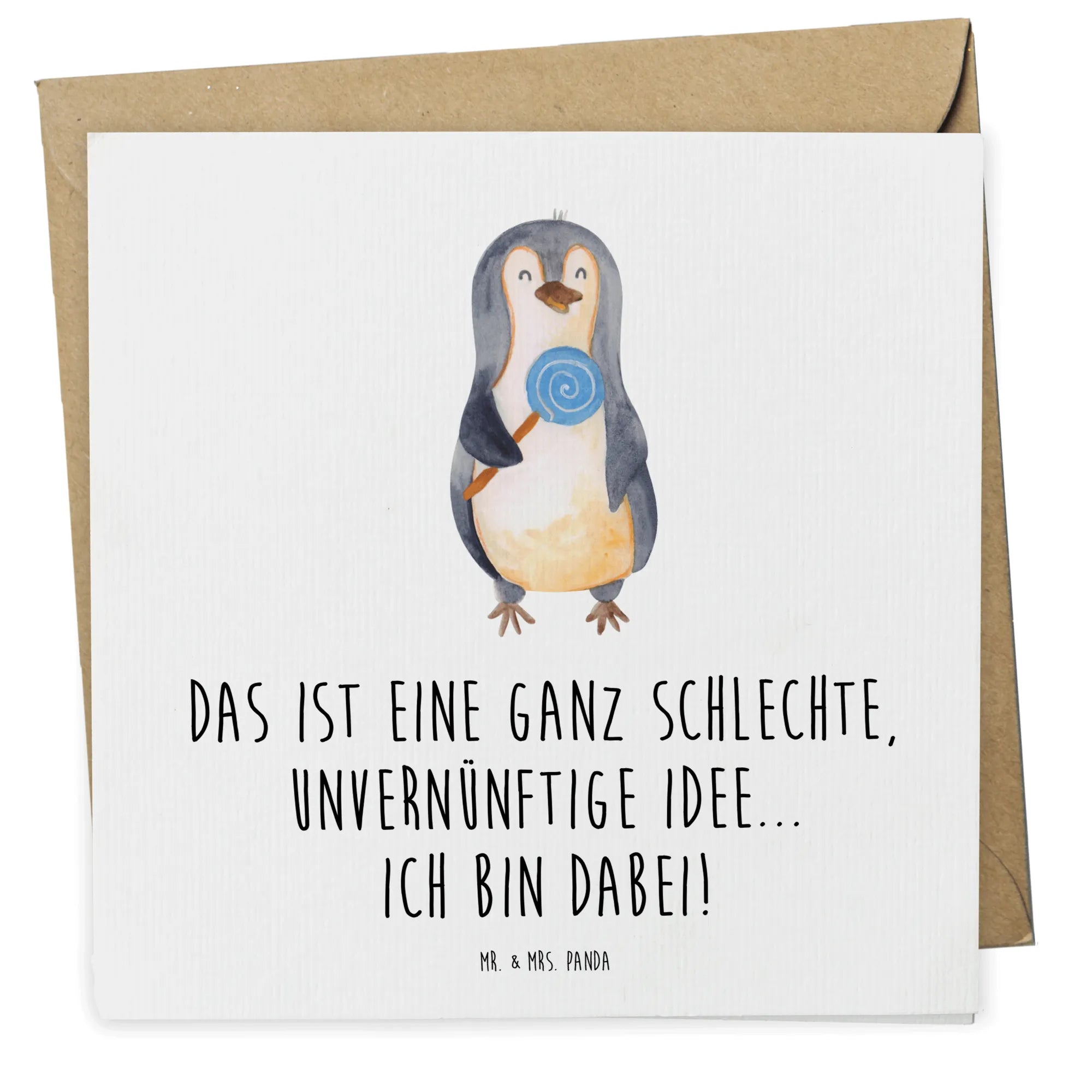 Die witzige Botschaft "Das ist eine ganz schlechte, unvernünftige Idee... Ich bin dabei!" sowie das handgezeichnete Design des kleinen Pinguins machen die Karte zu etwas ganz Besonderem. Sie ist ideal für alle, die den kindlichen Unfug und die Unbeschwertheit im Leben lieben. Mit einem Maße von 140 mm x 140 mm ist sie perfekt, um dein individuelles Gefühl für den Anlass auszudrücken. Die hochwertige Karte aus 300 Gramm Karton ist nicht nur stabil, sondern hat auch eine hochglänzend veredelte Vorder- und Rückseite, die sie besonders edel und einzigartig macht.