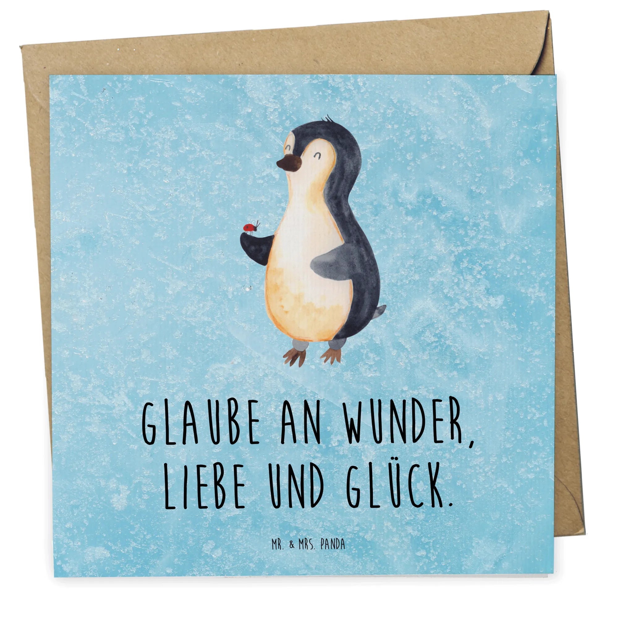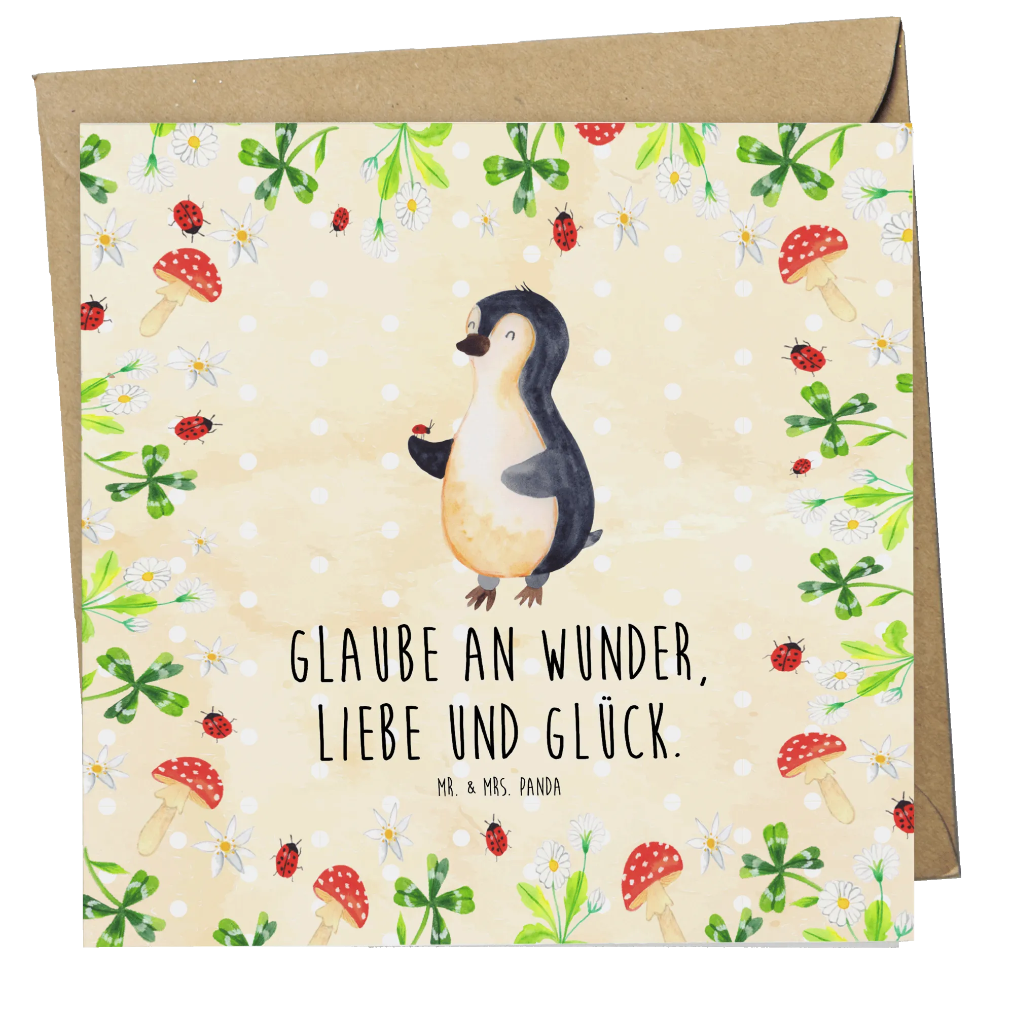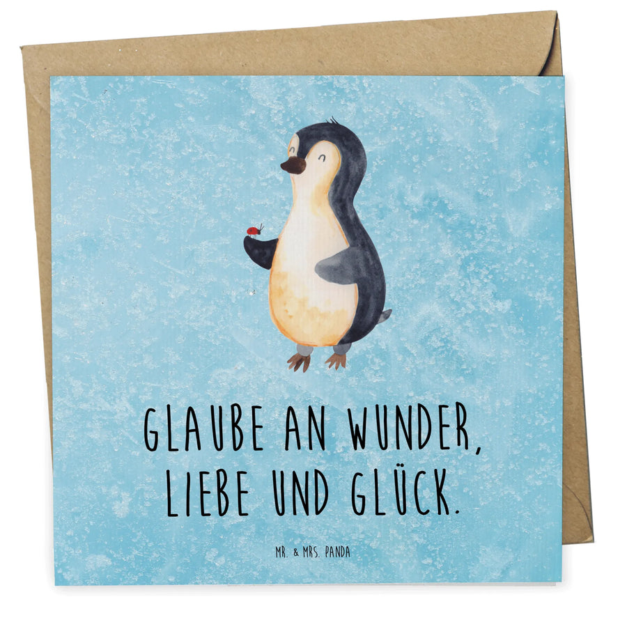 Hergestellt aus hochwertigem 300 Gramm Karton, überzeugt die Karte durch ihre edle Optik und die besonderen Details wie die hochglänzend veredelte Vorderseite. Der süße Pinguin, der einen fröhlichen Marienkäfer auf seiner Flosse hält, wird dich und deine Lieben verzaubern. Er steht für die Botschaft: 'Glaube an Wunder, Liebe und Glück'. Diese positive Einstellung spiegelt sich in jedem Design von Mr. & Mrs. Panda wider und sorgt nicht nur für eine tolle Optik, sondern vermittelt auch eine wunderbare Botschaft.