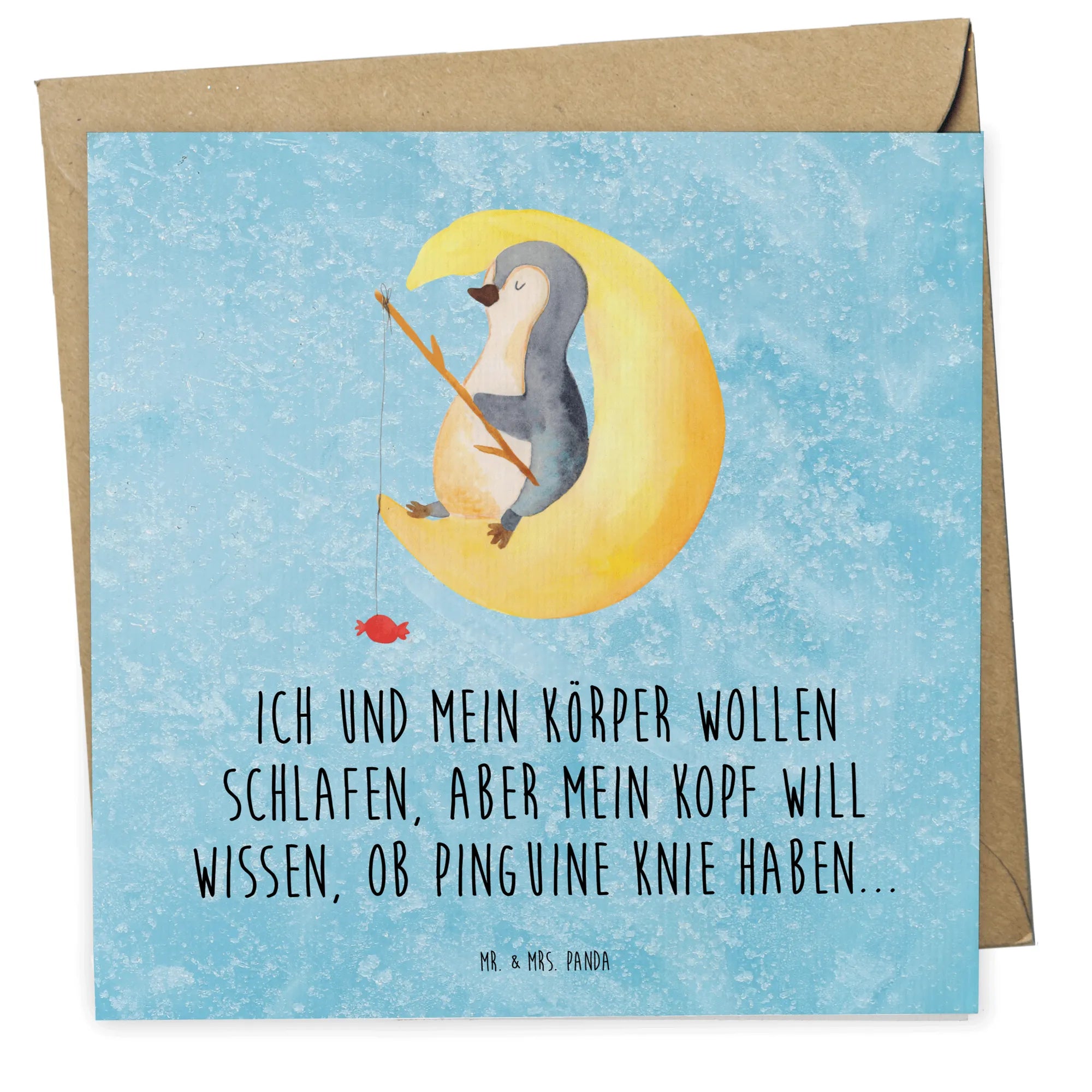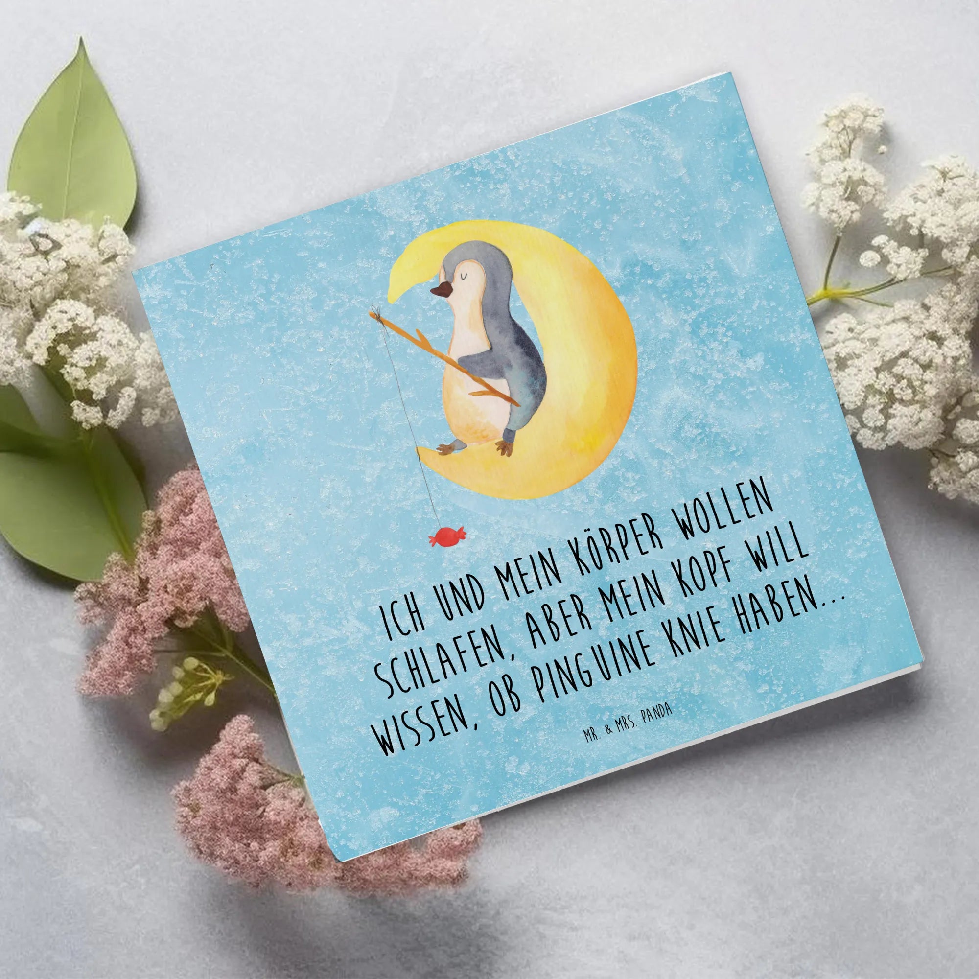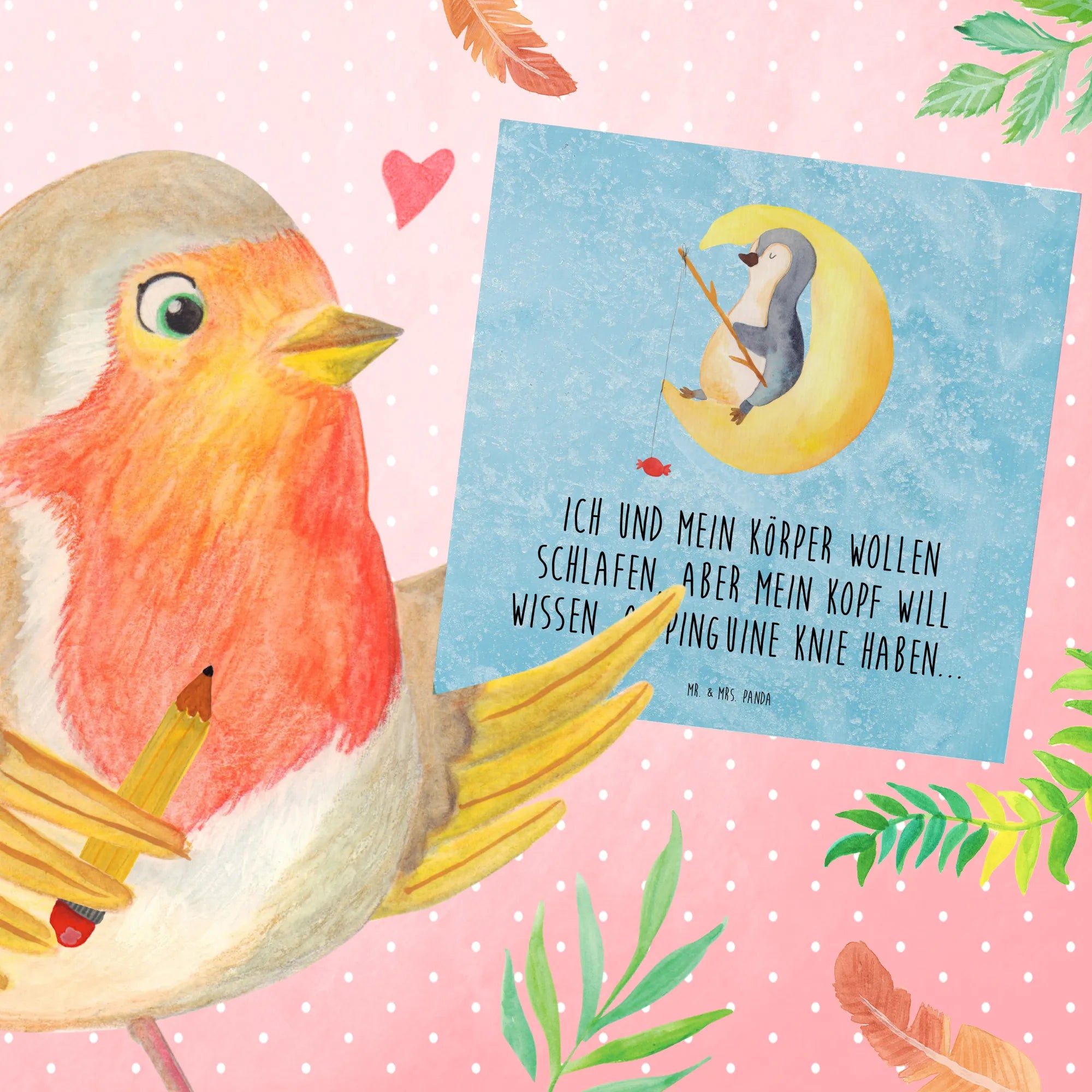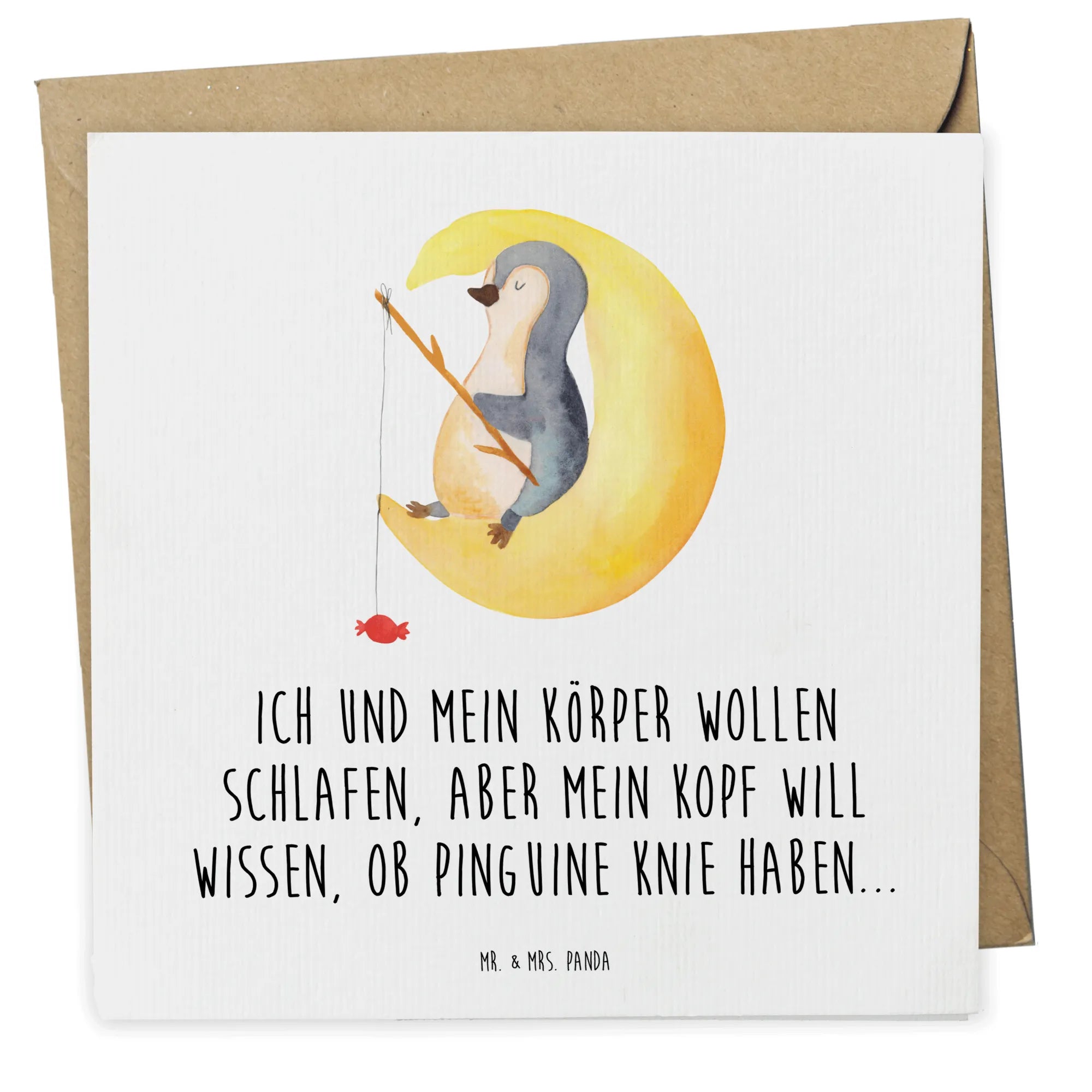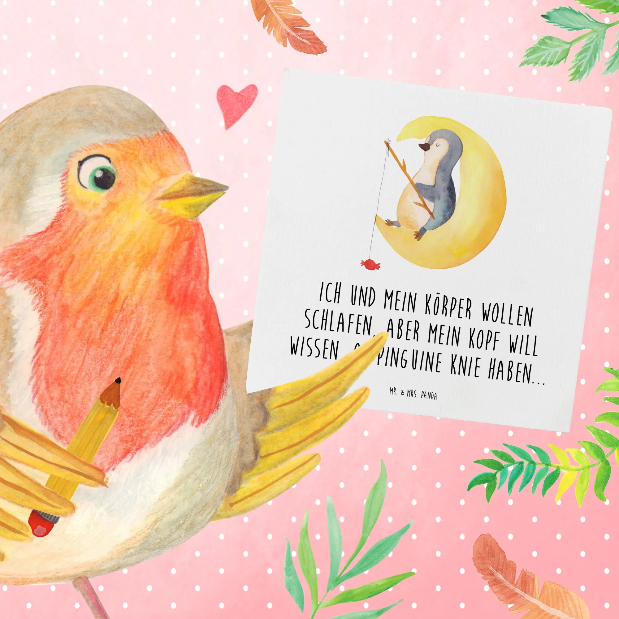 Besonders schön an dieser Karte ist der witzige Spruch: "Ich und mein Körper wollen schlafen, aber mein Kopf will wissen, ob Pinguine Knie haben..." Dieser kreative Text macht die Karte nicht nur zu einem praktischen Gruß, sondern auch zu einem kleinen Lächeln im Alltag.