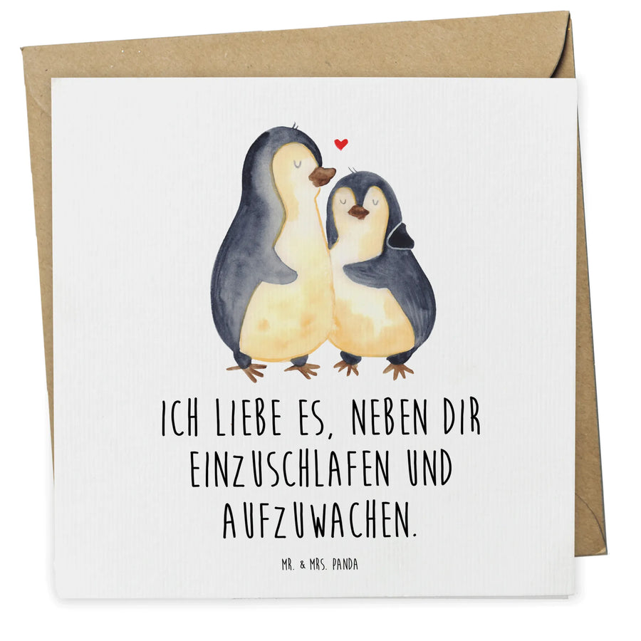 Deluxe Karte „Pinguine Einschlafen“ – ein kleiner, feiner Liebesgruß aus der Liebe-Kollektion von Mr. & Mrs. Panda. Auf der hochwertigen, quadratischen Karte kuscheln zwei liebe Pinguine in zarten Aquarelltönen, darüber schwebt ein rotes Herz. Der liebevolle Spruch „Ich liebe es, neben dir einzuschlafen und aufzuwachen.“ sagt genau das, was dein Herz fühlt. ❤️🐧