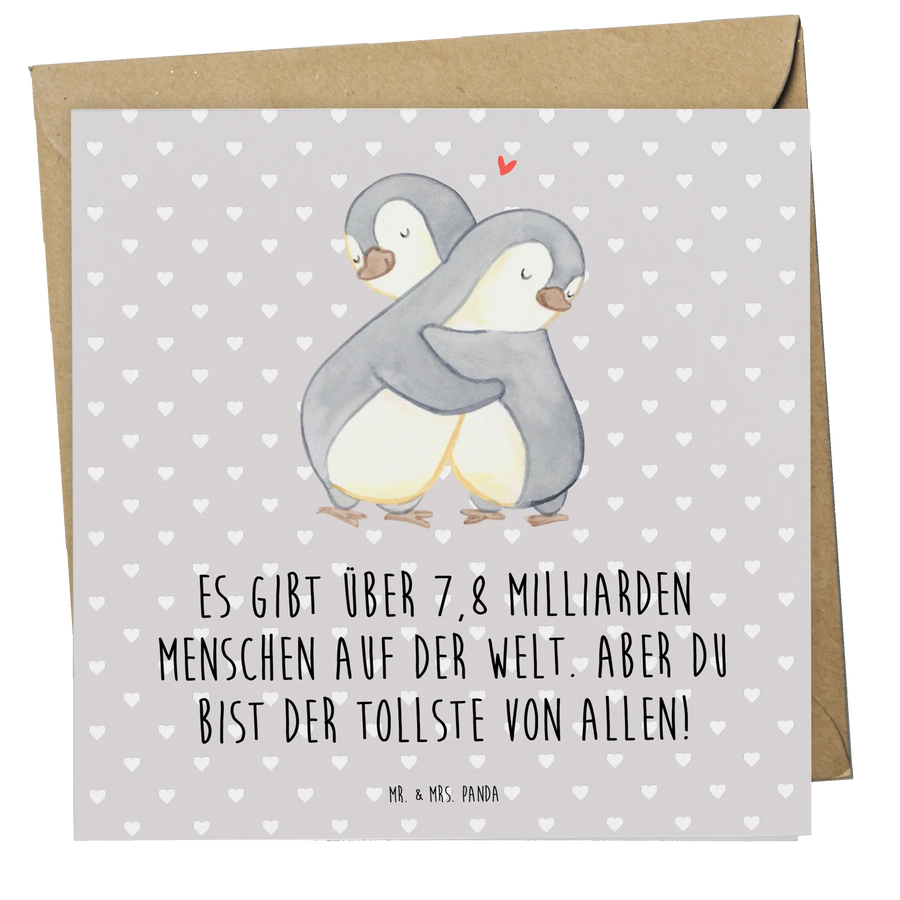 Unsere Deluxe Karte aus der Liebe-Kollektion von Mr. & Mrs. Panda zeigt zwei eng umschlungene Pinguine und trägt den schönen Spruch: „Es gibt über 7,8 Milliarden Menschen auf der Welt. Aber du bist der Tollste von allen!“ Dieses Motiv drückt Zuneigung und Geborgenheit aus und ist perfekt als Grußkarte für deinen Partner oder deine Partnerin.