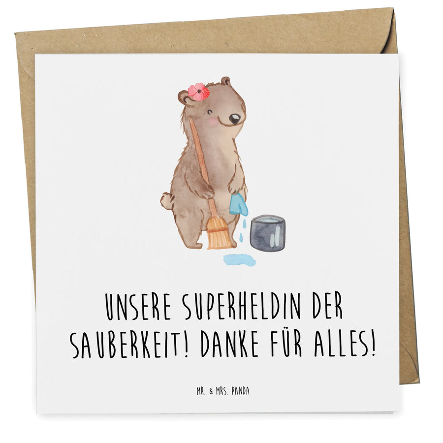 Die Karte misst 140 mm x 140 mm und besteht aus edlem, hochglänzend veredeltem Karton. Auf der Vorderseite prangt der süße Spruch "Unsere Superheldin der Sauberkeit! Danke für alles!" und auf der matte Innenseite hast du genug Platz, um deine individuellen Grüße zu hinterlassen. So wird diese Karte zu einem ganz persönlichen Dankeschön, das in Erinnerung bleibt!