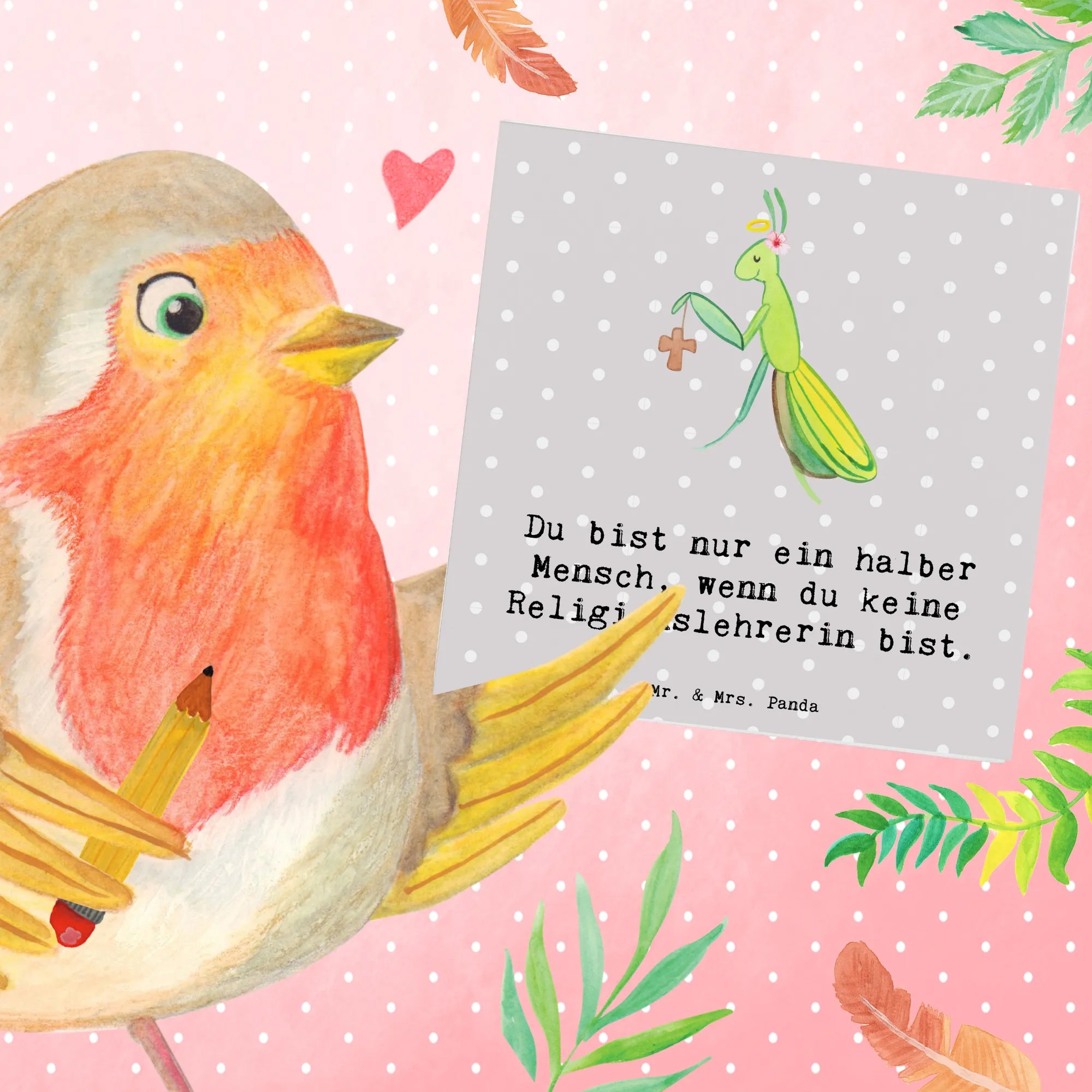 Das Motiv zeigt eine süße Gottesanbeterin mit einem Kreuz in der Hand, die liebevoll von Mrs. Panda gezeichnet wurde. "Du bist nur ein halber Mensch, wenn du keine Religionslehrerin bist" steht in einer kreativen Schrift auf der Vorderseite.