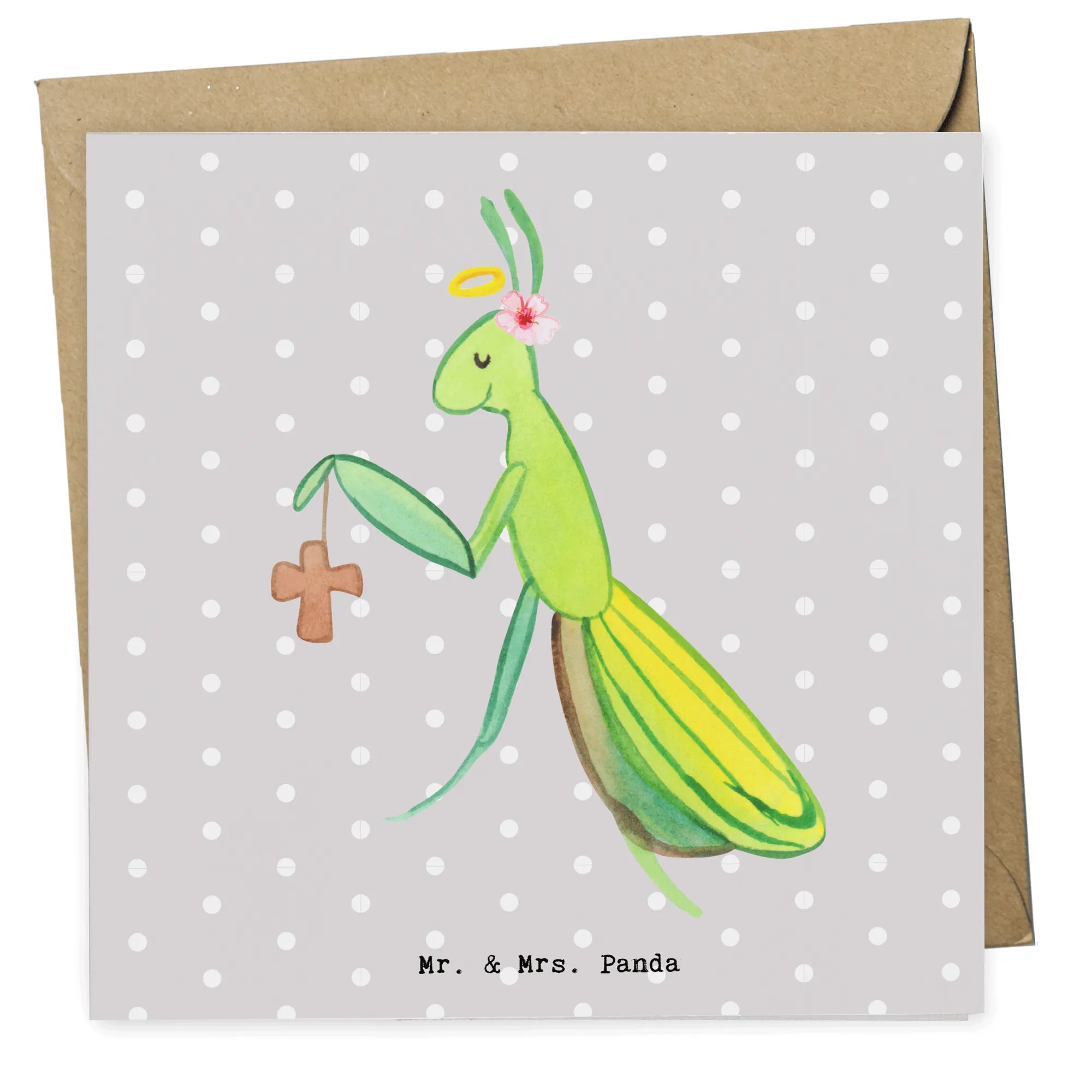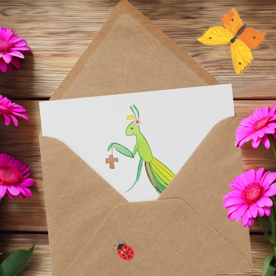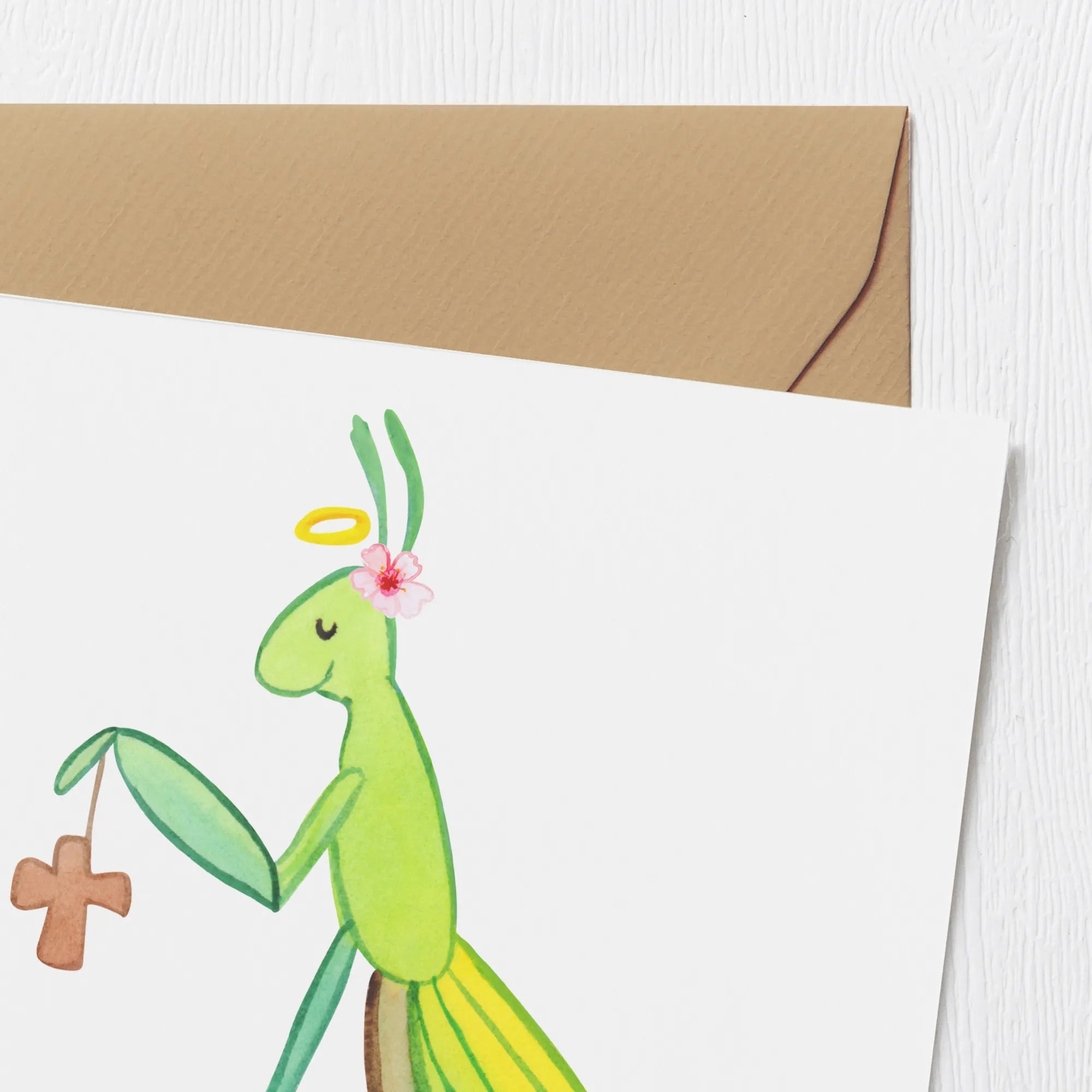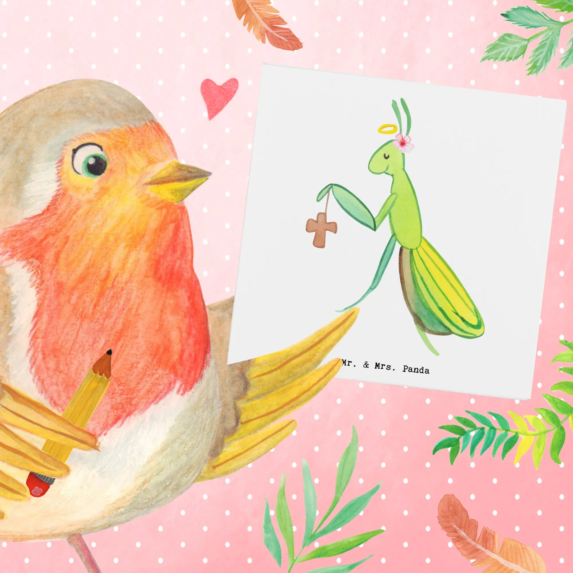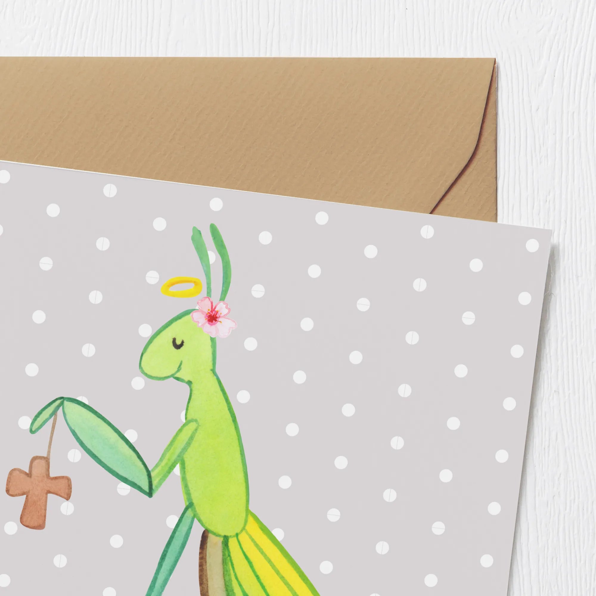 Diese hochwertige, quadratische Klappkarte hat die Maße 140 mm x 140 mm und ist aus einem edlen 300 Gramm Karton gefertigt. Die Vorderseite ziert ein süßes Motiv mit einer Gottesanbeterin, die ein Kreuz hält und einen Heiligenschein trägt, das von Mrs. Panda liebevoll handgezeichnet wurde. Ein ideales Geschenk, um Dankbarkeit auszudrücken – sei es zum Geburtstag, zur Verabschiedung oder einfach mal nur so zwischendurch!