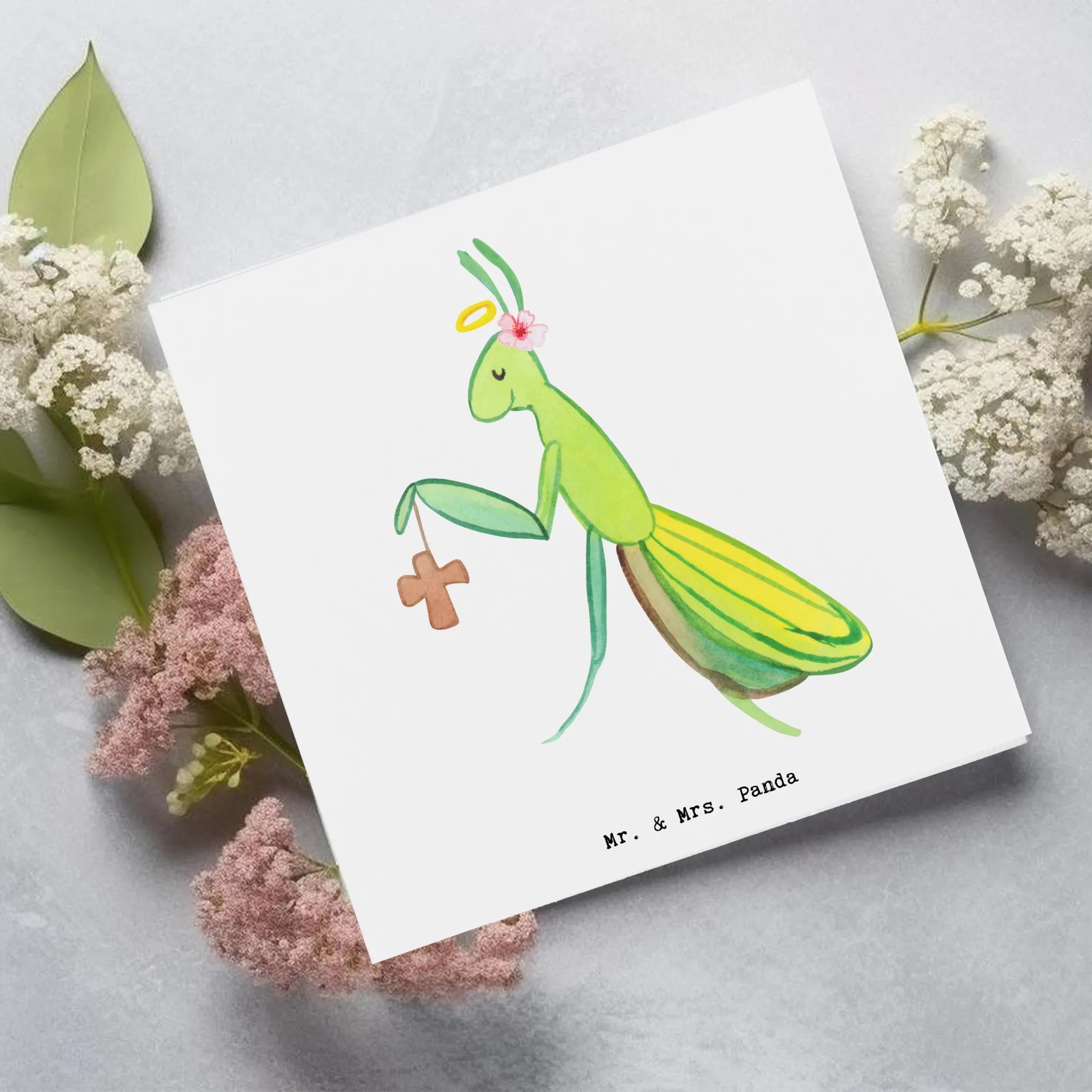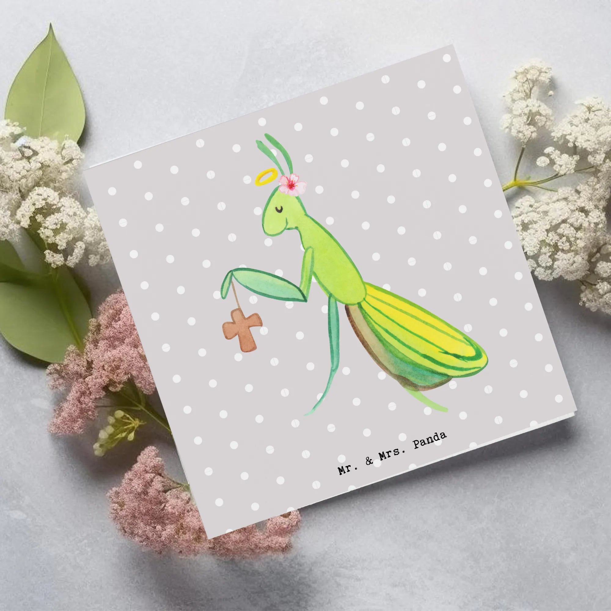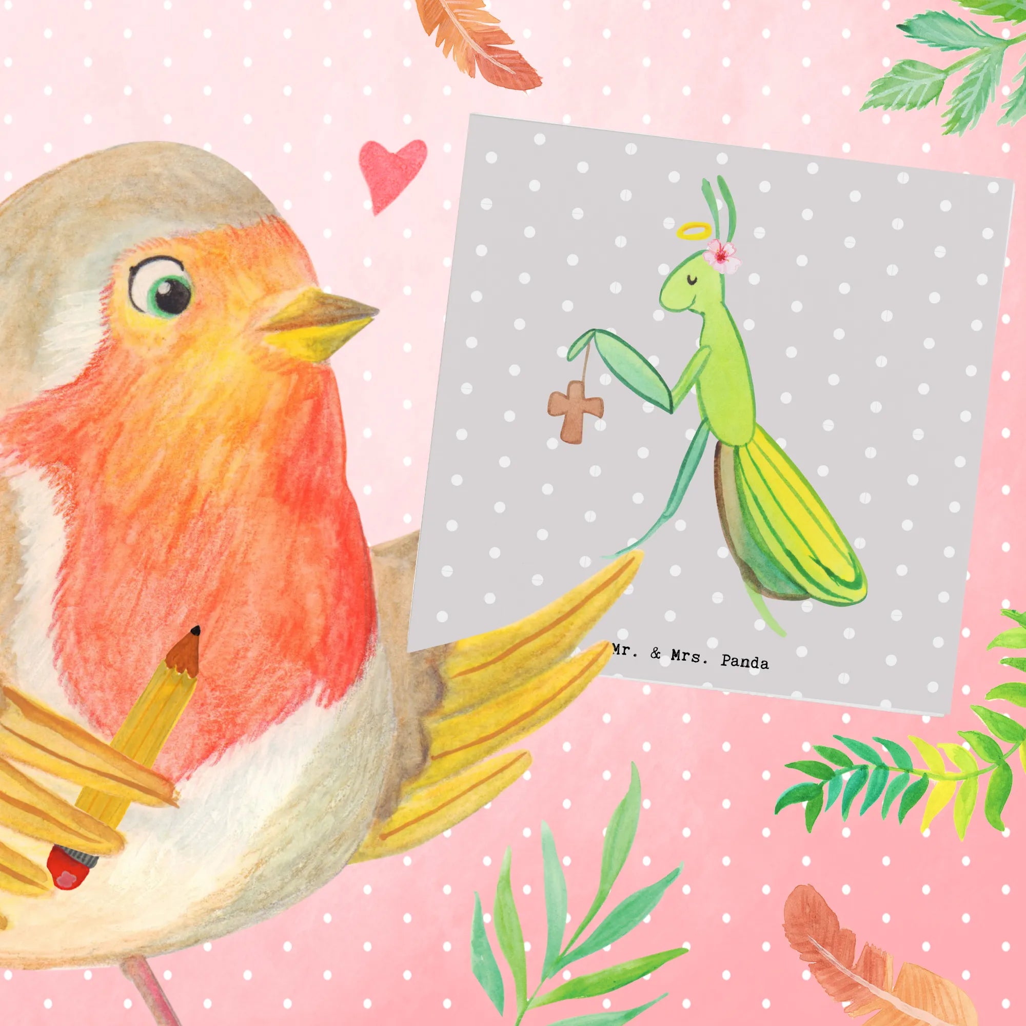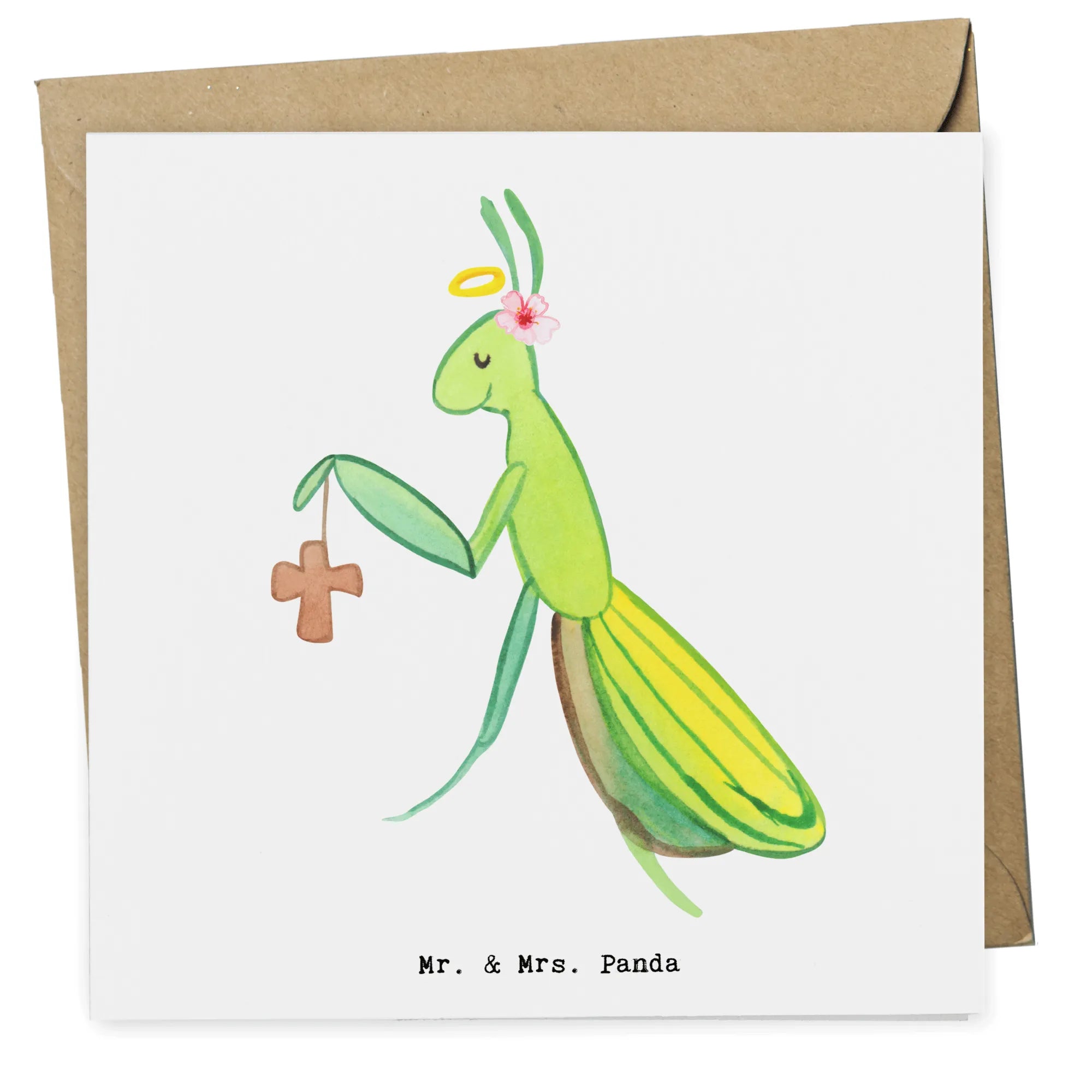 Diese hochwertige, quadratische Klappkarte hat die Maße 140 mm x 140 mm und ist aus einem edlen 300 Gramm Karton gefertigt. Die Vorderseite ziert ein süßes Motiv mit einer Gottesanbeterin, die ein Kreuz hält und einen Heiligenschein trägt, das von Mrs. Panda liebevoll handgezeichnet wurde. Ein ideales Geschenk, um Dankbarkeit auszudrücken – sei es zum Geburtstag, zur Verabschiedung oder einfach mal nur so zwischendurch!