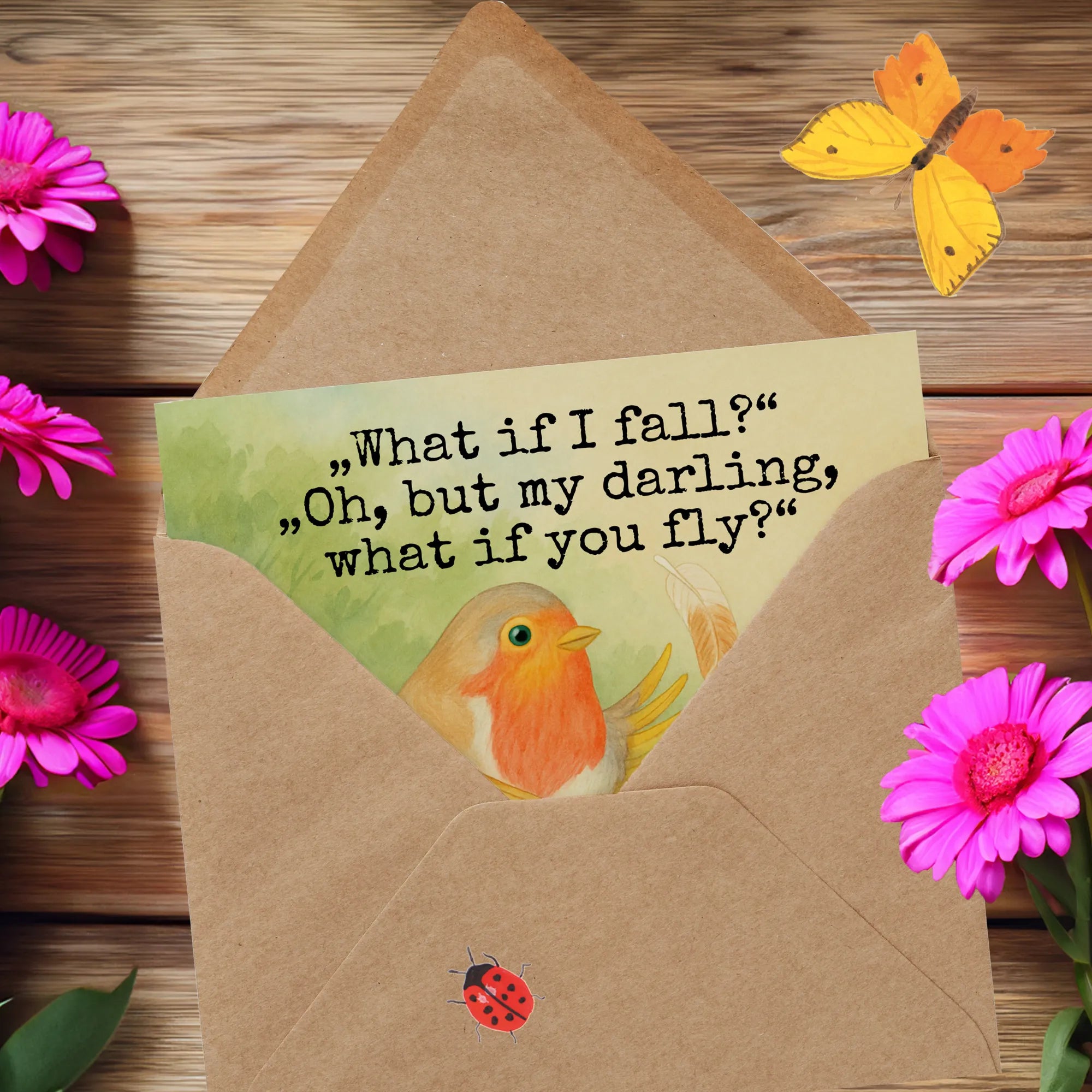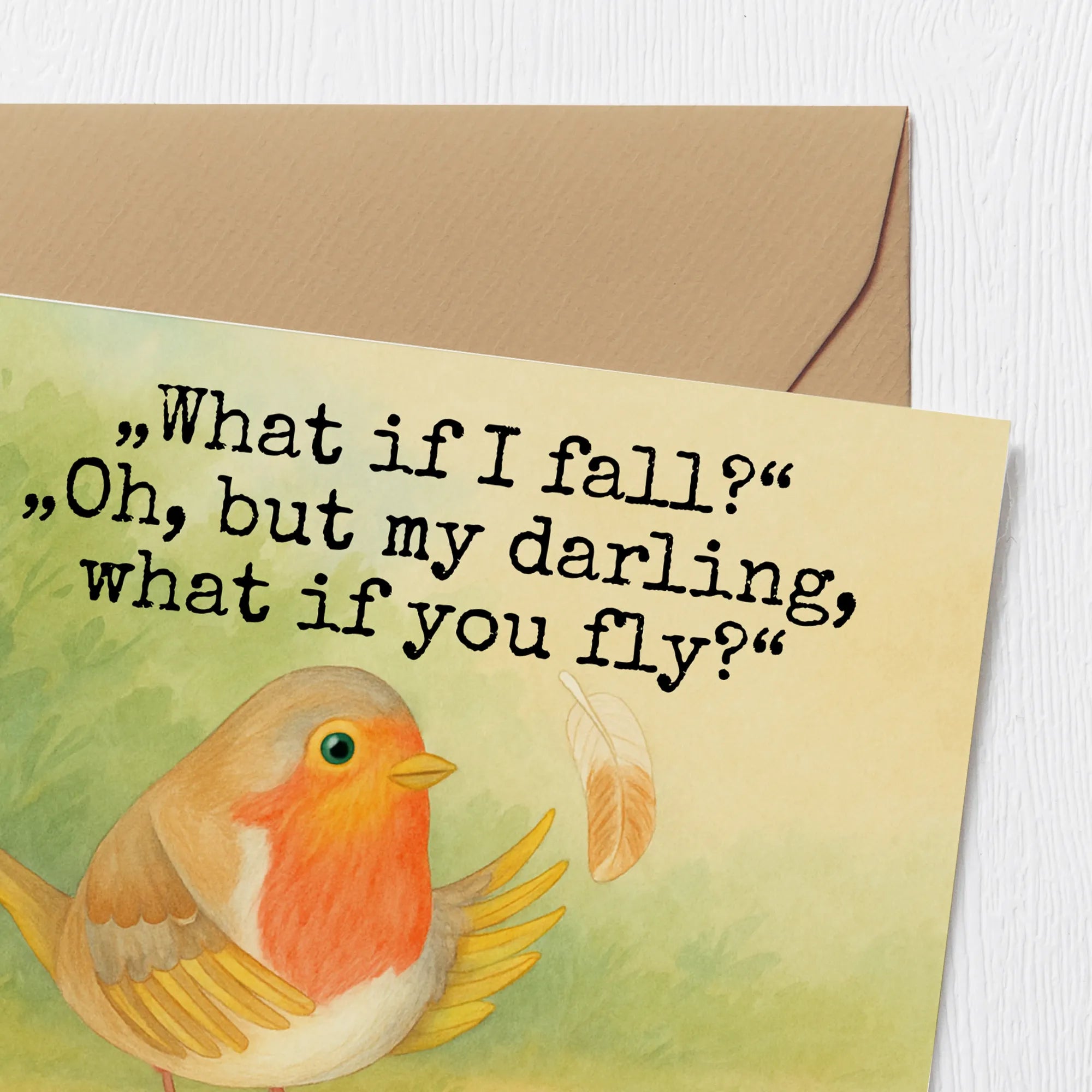 Mutiges Rotkehlchen mit inspirierendem Spruch 'What if I fall? Oh, but my darling, what if you fly?'