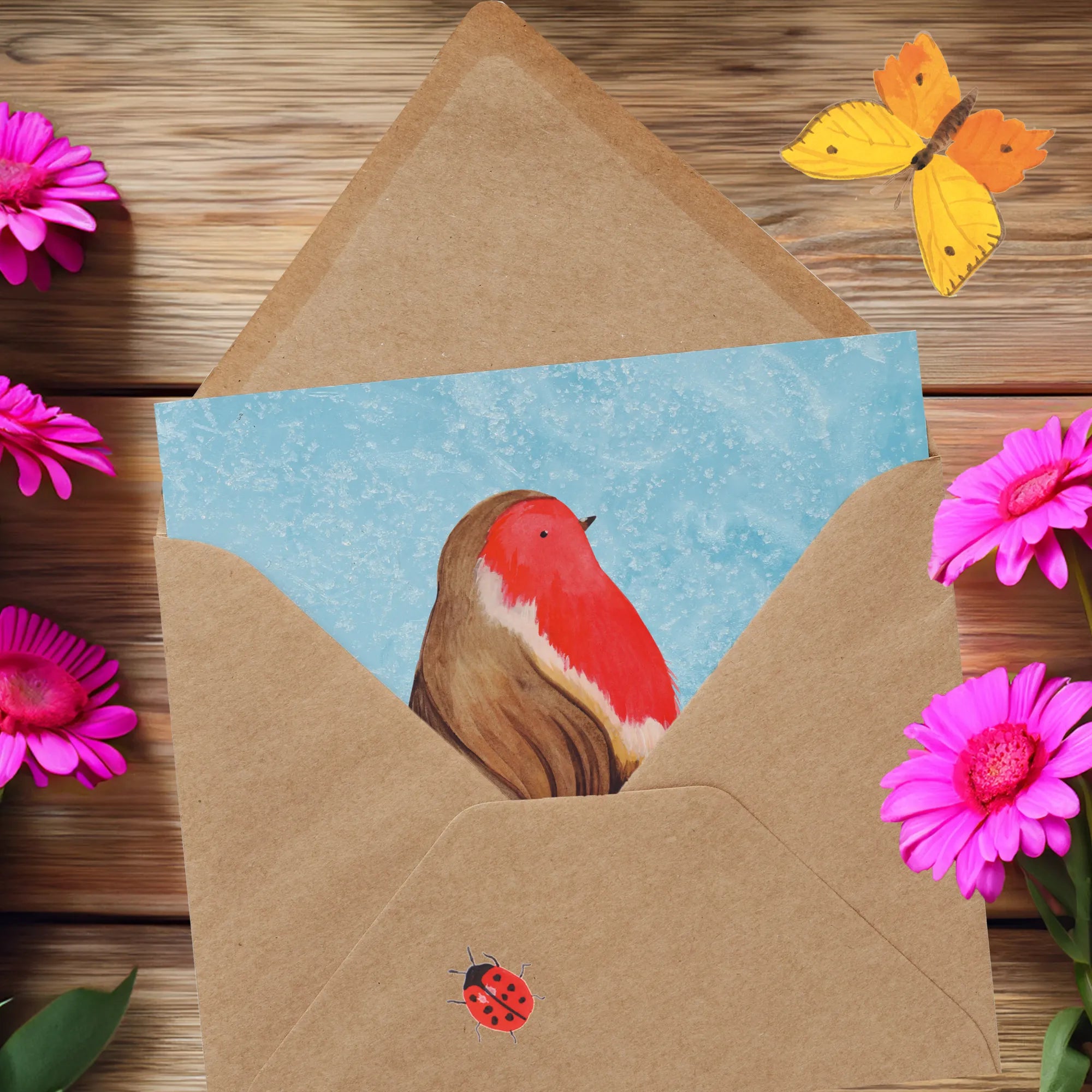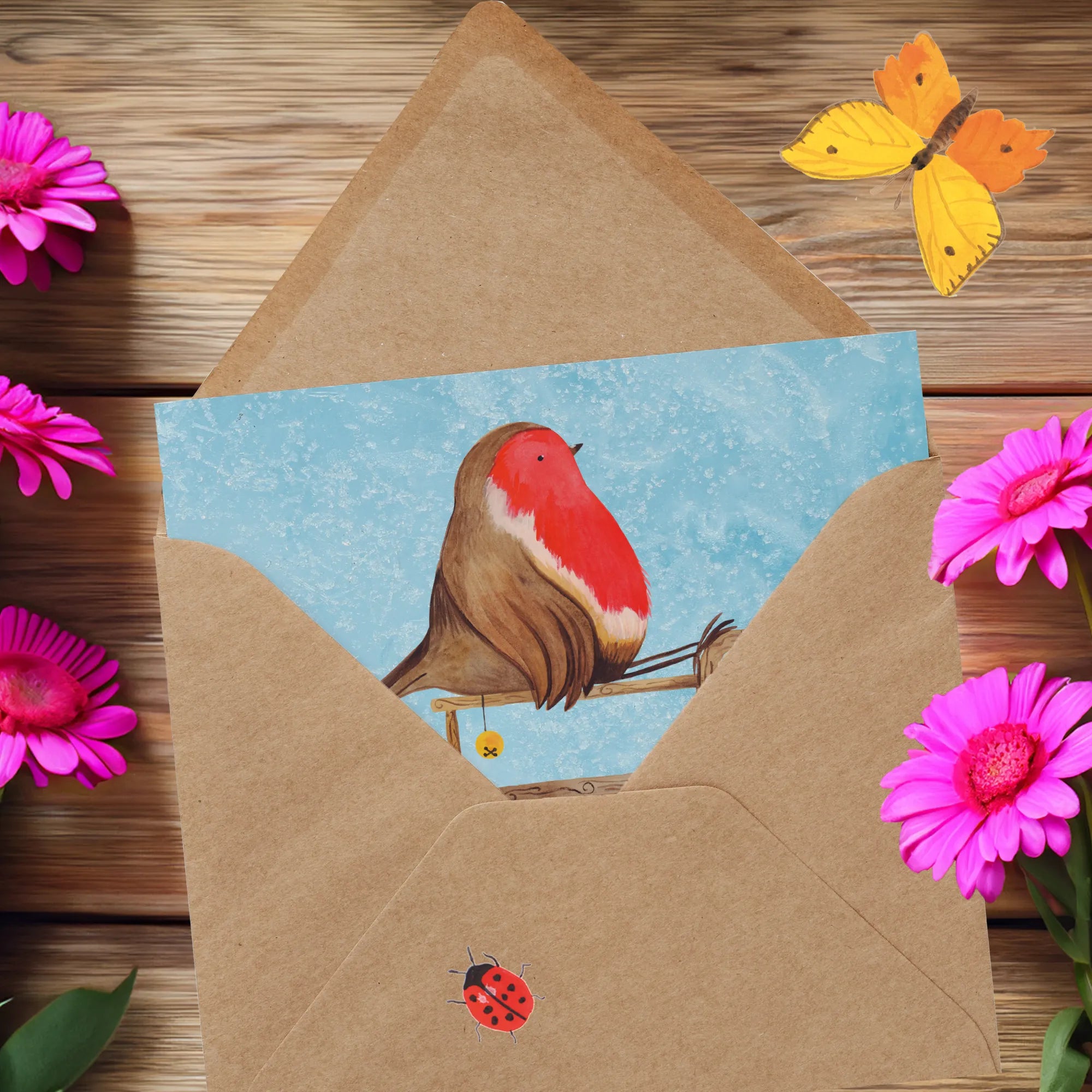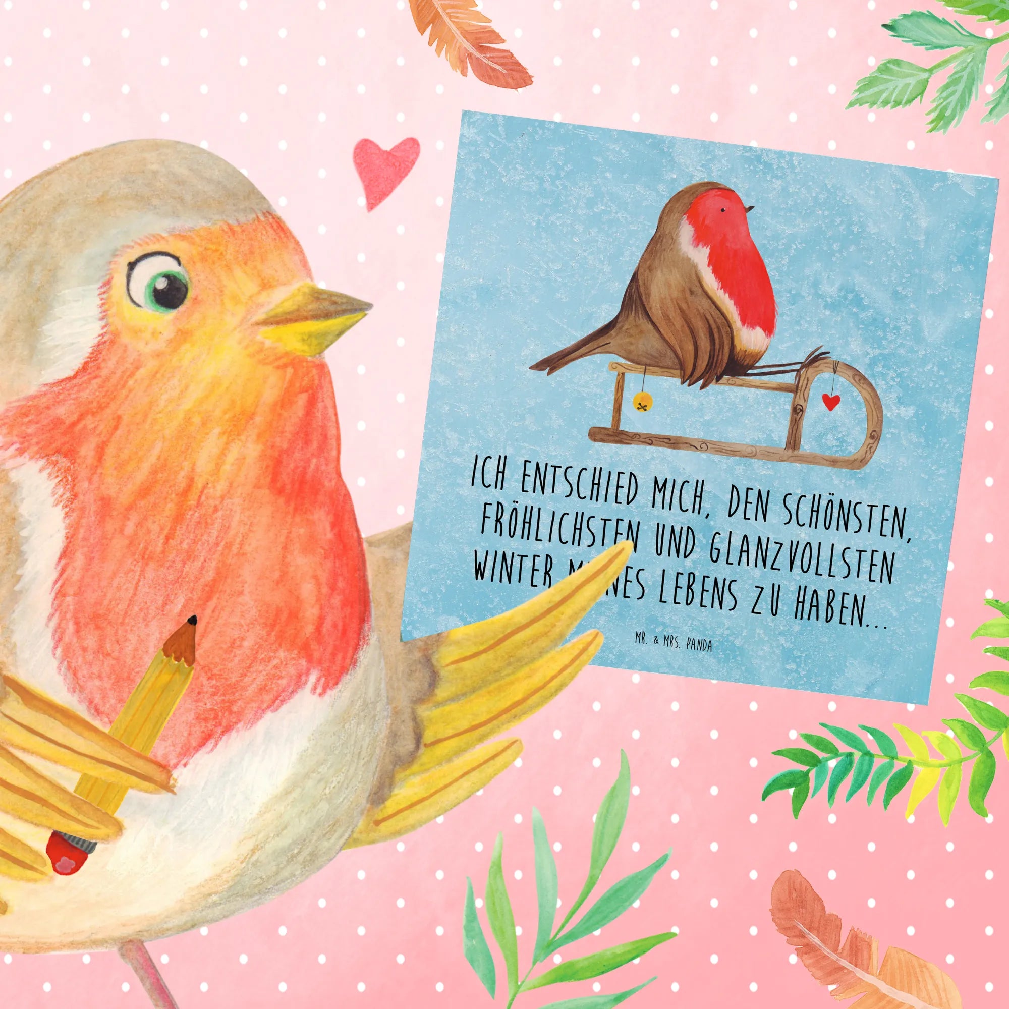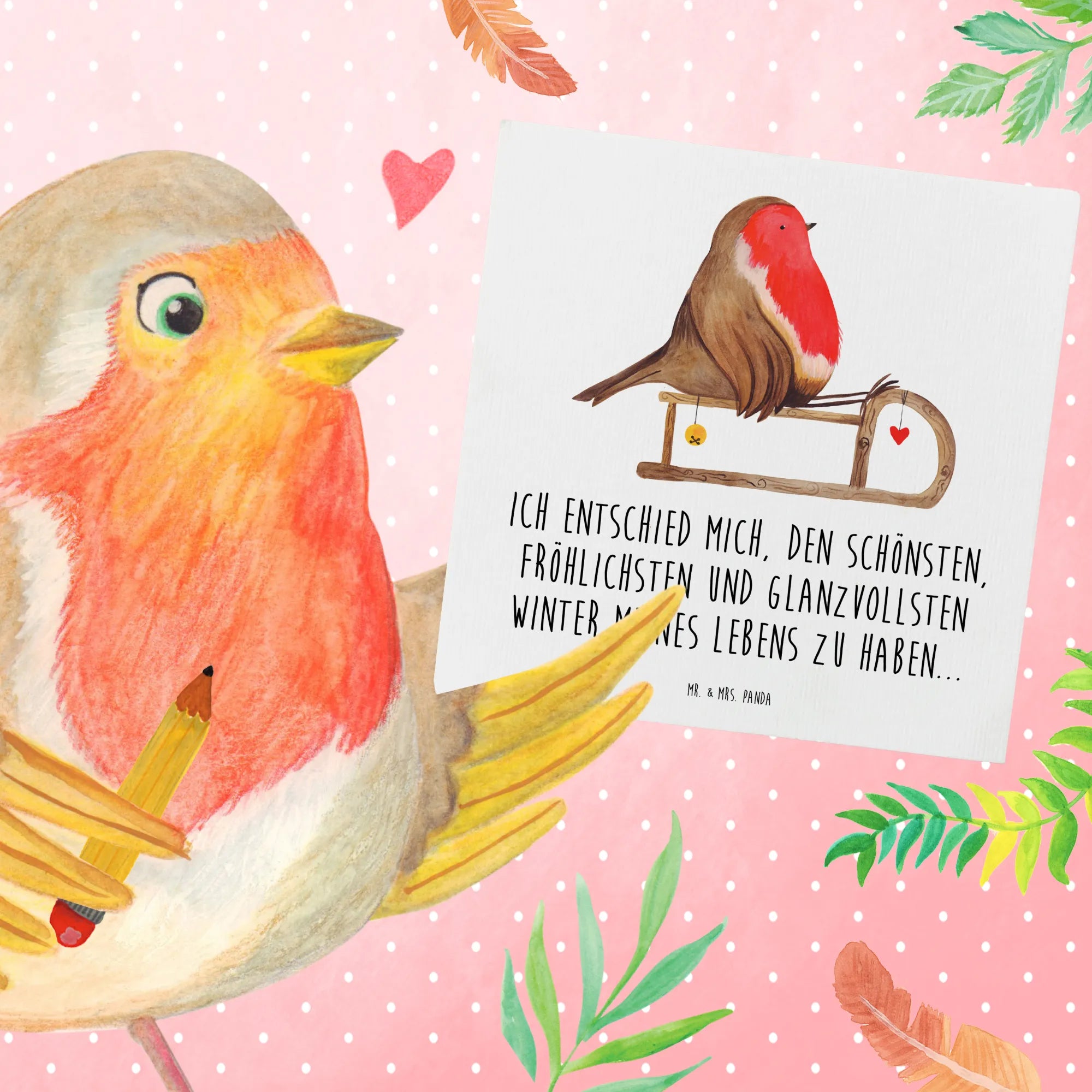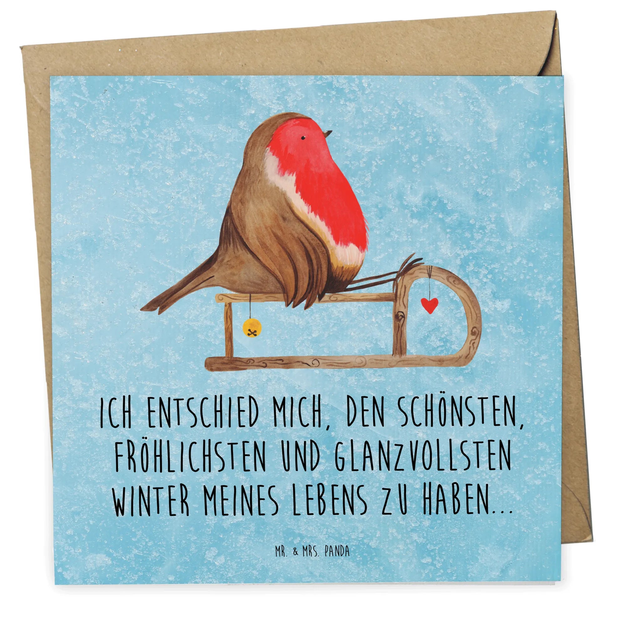 Auf der Vorderseite prangt das handgezeichnete Motiv des fröhlichen Rotkehlchens, das durch die winterliche Landschaft mit seinem Holzschlitten gleitet. Der Slogan ‘Ich entschied mich, den schönsten, fröhlichsten und glanzvollsten Winter meines Lebens zu haben...‘ zaubert jedem ein Lächeln ins Gesicht und macht jedes Schreiben zu einem festlichen Erlebnis.