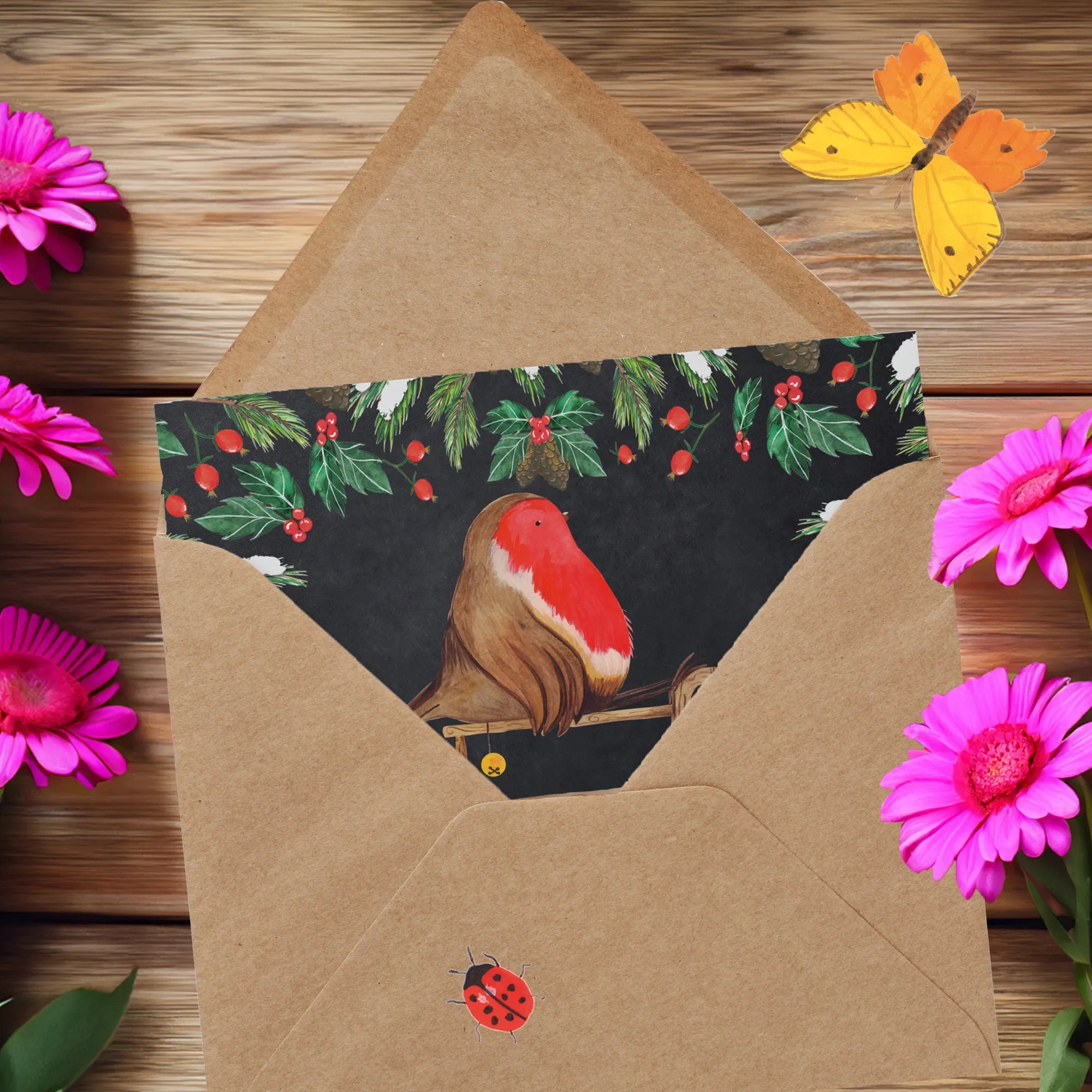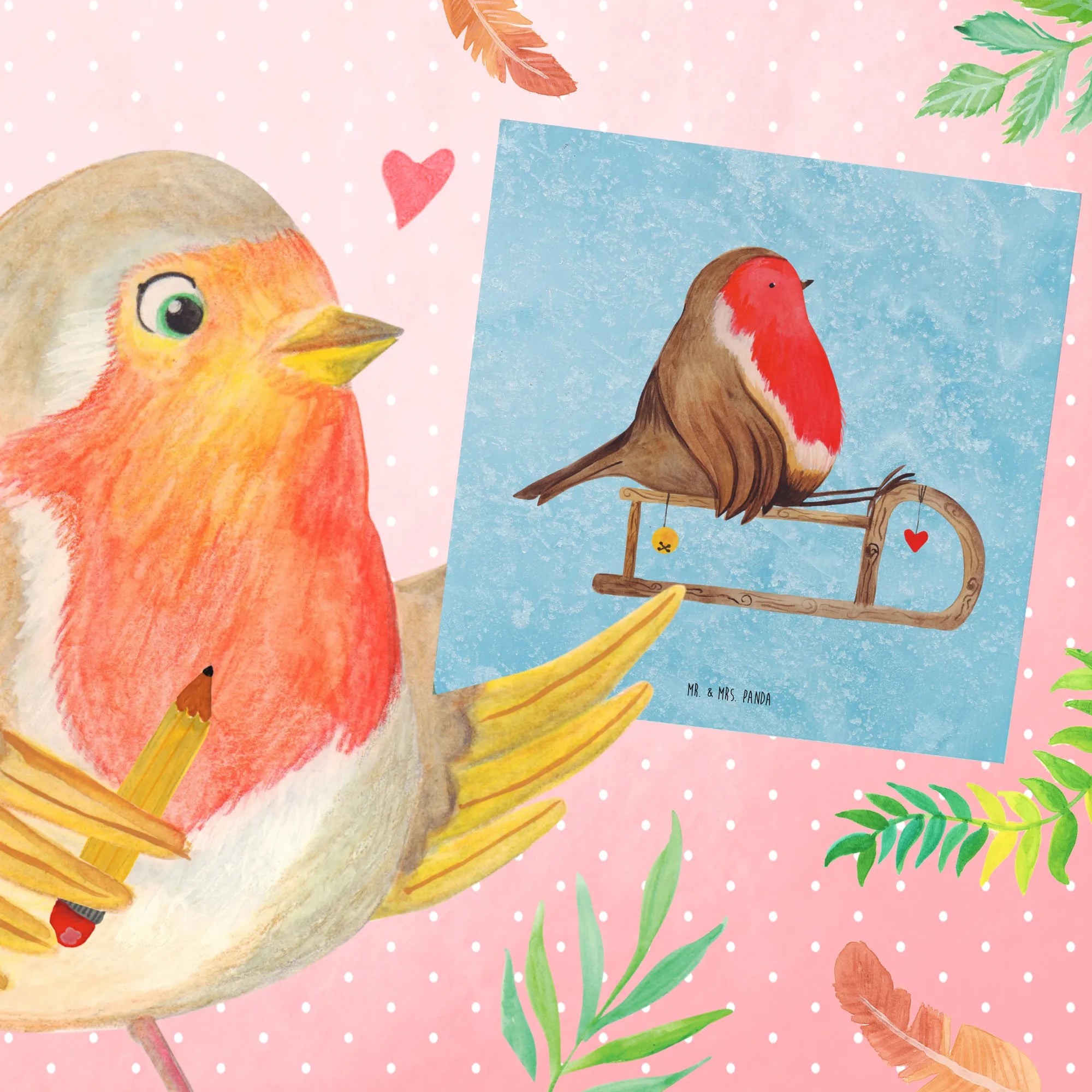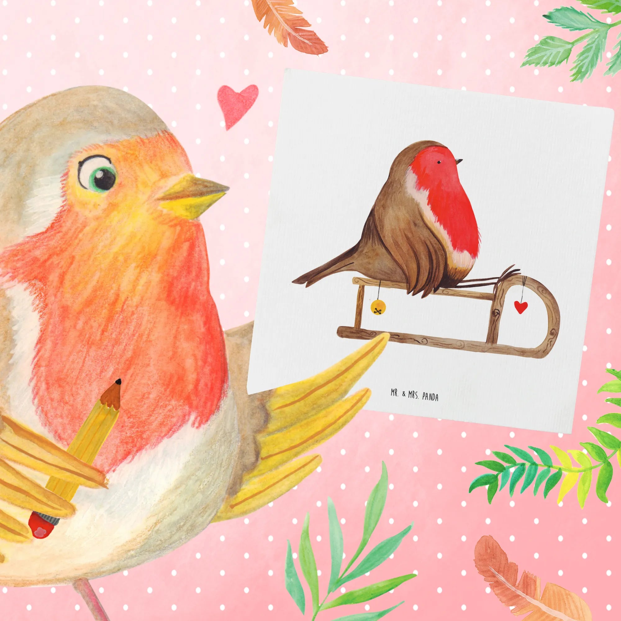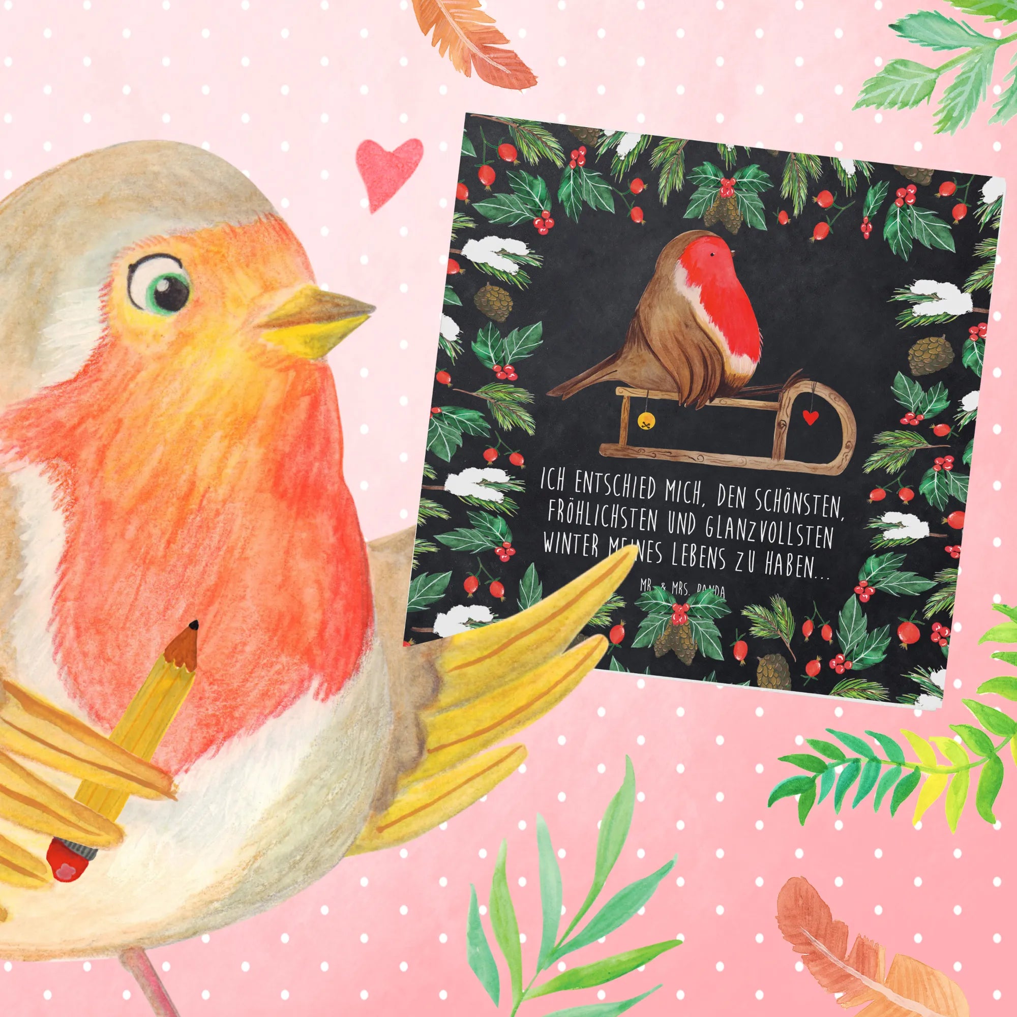 Die Deluxe Karte mit dem entzückenden Motiv Rotkehlchen auf einem Holzschlitten ist das perfekte Geschenk für die winterliche Zeit! Egal ob für Weihnachten, den Nikolaus, Heiligabend oder als Einladungskarte zu einer winterlichen Feier, diese besondere Grußkarte bringt Freude und Gemütlichkeit in jedes Zuhause. Jedes Rotkehlchen-Motiv wird liebevoll von Mr. & Mrs. Panda handgezeichnet und verleiht deiner Botschaft einen persönlichen und verspielten Touch.