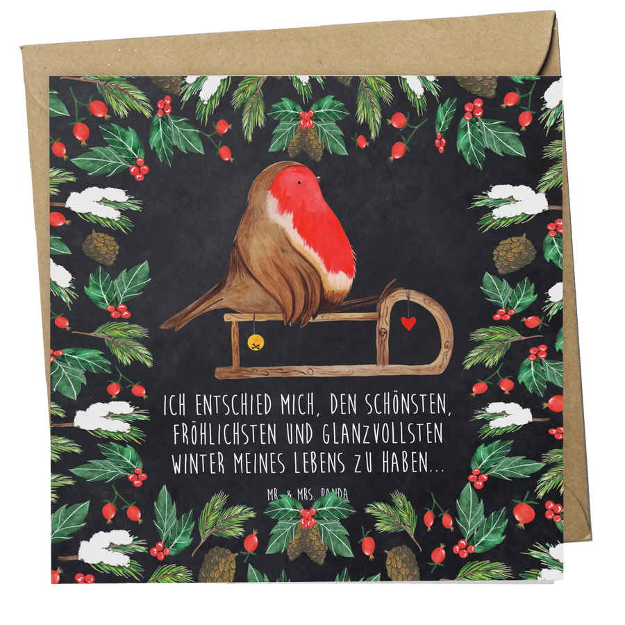 Entdecke die zauberhafte Deluxe Karte mit dem süßen Motiv des Rotkehlchens auf einem Schlitten, aus der Winter Kollektion von Mr. & Mrs. Panda. Diese wunderschöne und hochwertige quadratische Karte ist ideal, um persönliche Grüße oder Glückwünsche zu feierlichen Anlässen wie Weihnachten, Geburtstagen, Hochzeiten oder Jubiläen zu übermitteln.