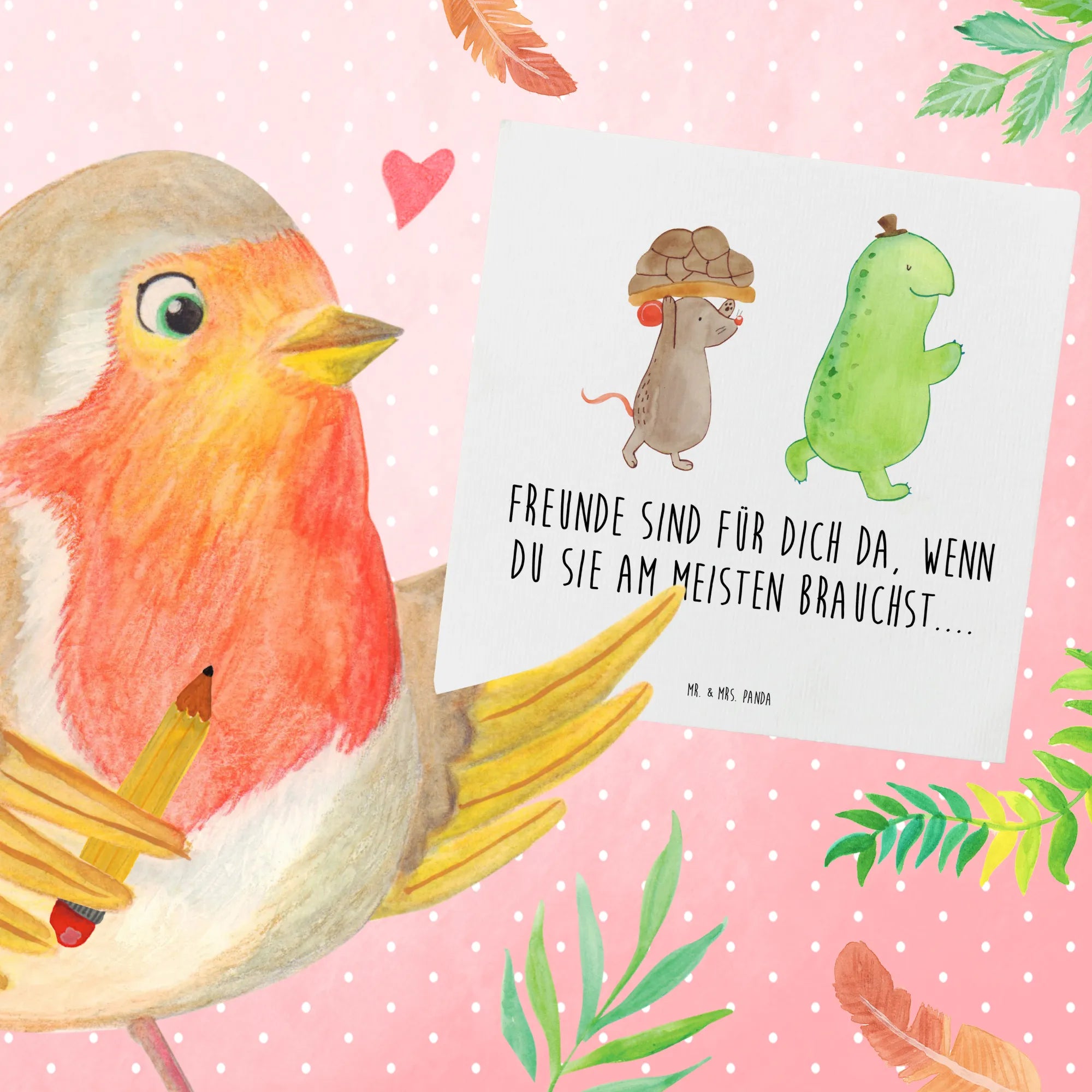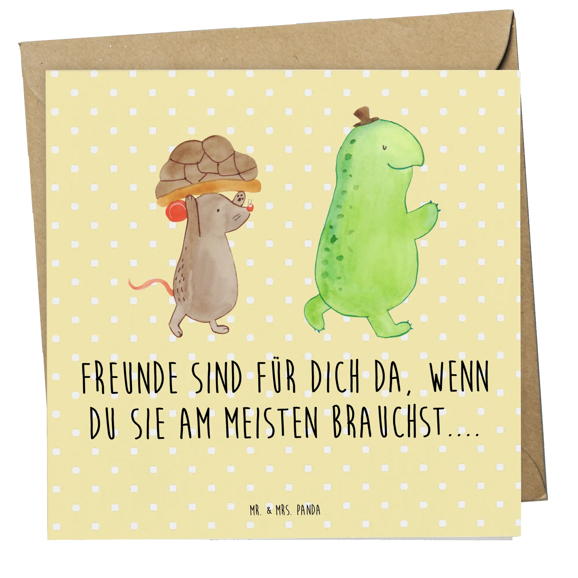 Das Design zeigt eine fröhliche Schildkröte, die ihren Schildkrötenpanzer stolz trägt, während die niedliche Maus fröhlich hinterherläuft. Dieses Bild zaubert jedem Betrachter ein Lächeln ins Gesicht! Zudem enthält die Karte den liebevollen Slogan: 'Freunde sind für dich da, wenn du sie am meisten brauchst...', der in schweren Zeiten Trost und Unterstützung bietet.
