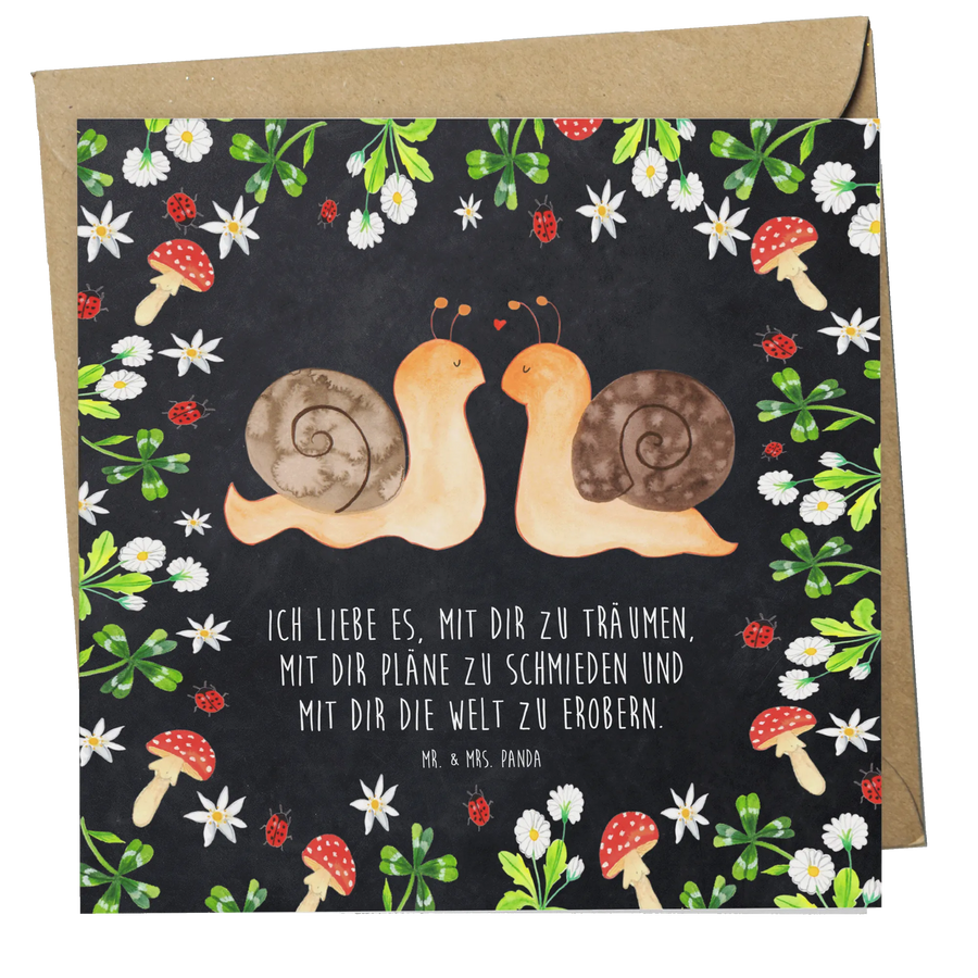 Jedes Detail dieser wundervollen Karte wurde sorgfältig durchdacht. Auf der Vorderseite prangen zwei niedliche stilisierte Schnecken, die sich gegenüberstehen und ihre einzigartigen Schalen in harmonischen Farben präsentieren. Zwischen ihnen schwebt ein kleines, rotes Herz, das die innige Verbindung zwischen Liebenden symbolisiert. Der nostalgische Spruch 'Ich liebe es, mit dir zu träumen, mit dir Pläne zu schmieden und mit dir die Welt zu erobern.' macht sie zu einem ganz besonderen Geschenklein, das Erinnerungen weckt und gemeinsame Träume verkörpert.